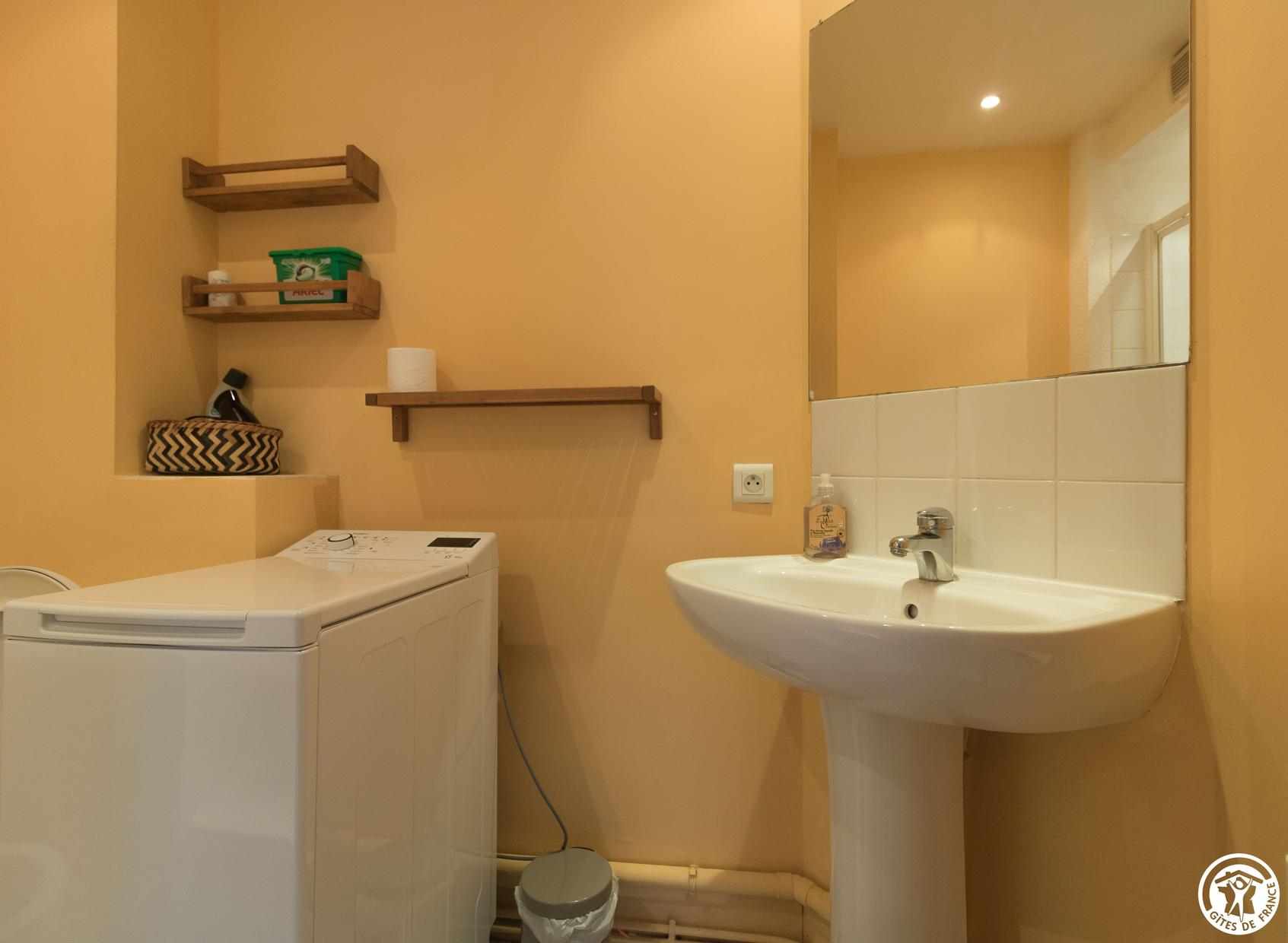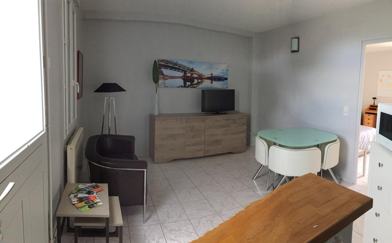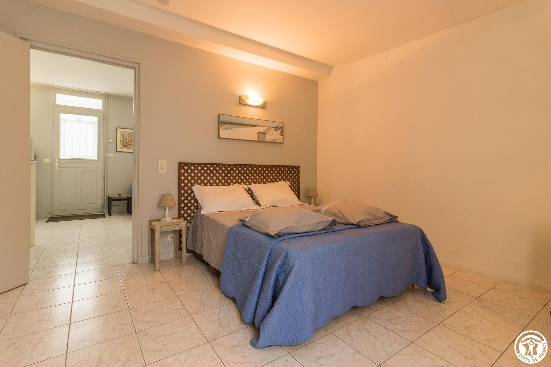 Entrée dans le séjour, espace repas et coin-cuisine, grande chambre (1 lit 2 personnes en 140cm), salle d’eau avec WC. Réfrigérateur/congélateur, four micro-ondes, lave-linge. Matériel bébé sur demande. Chauffage électrique