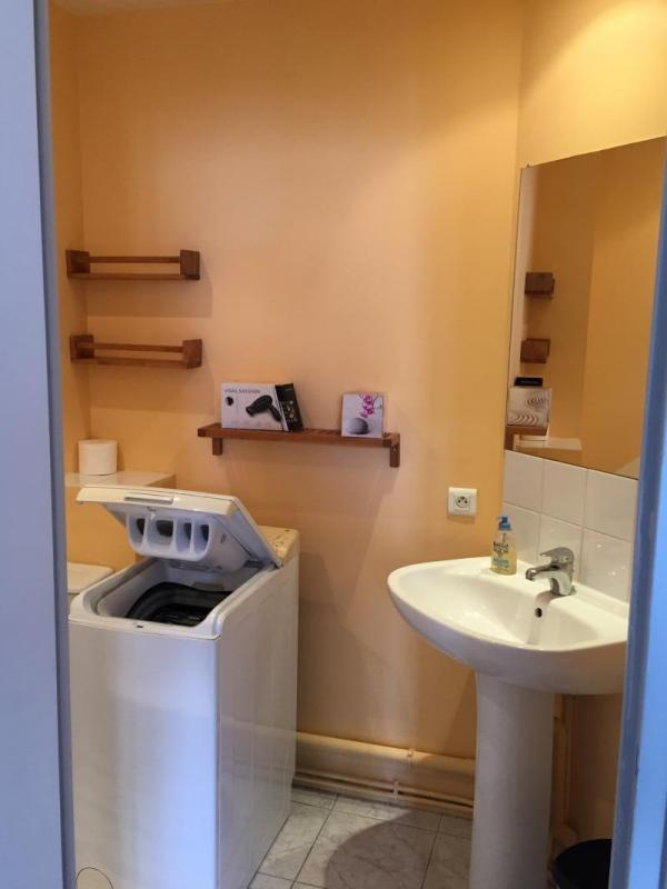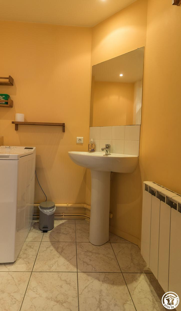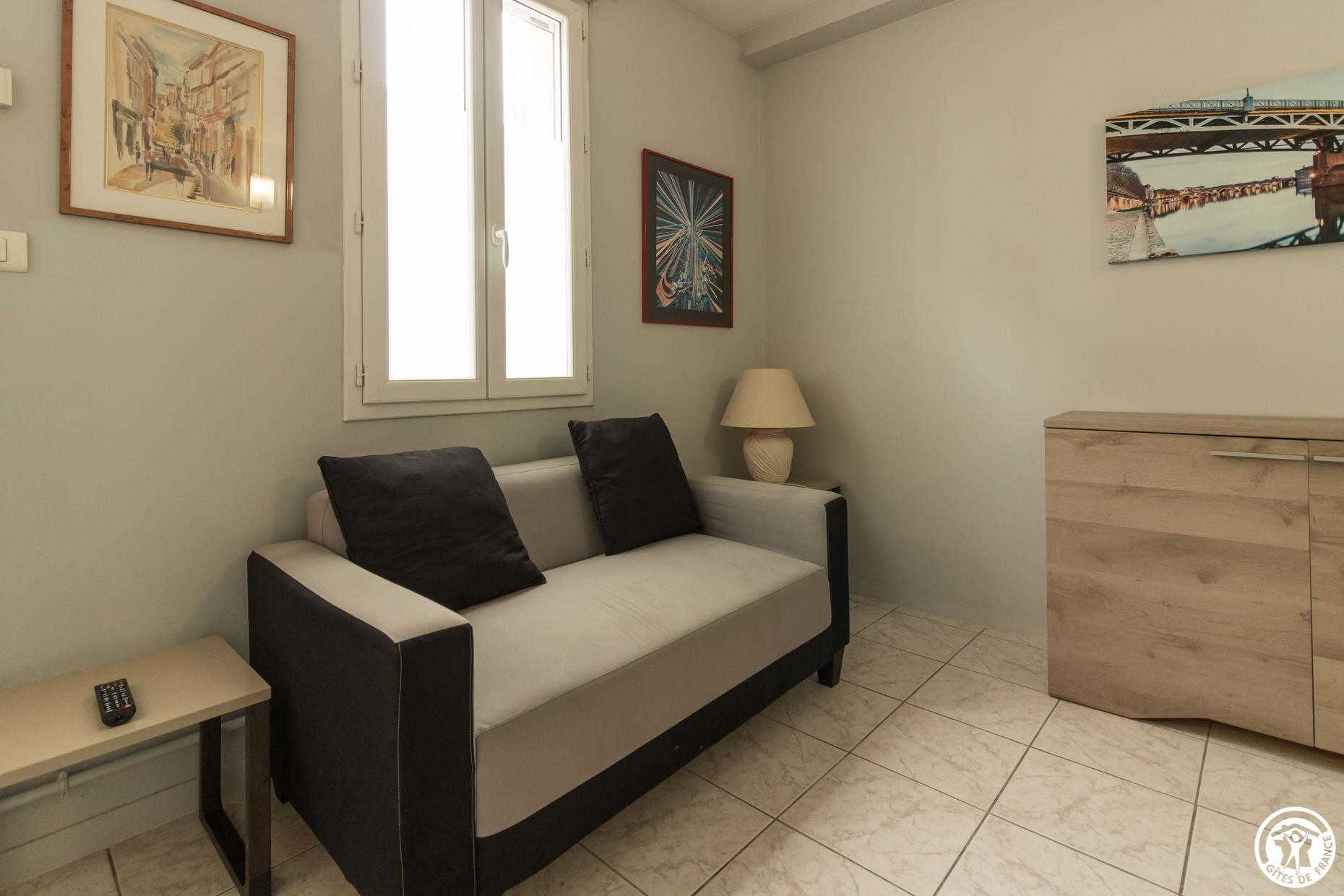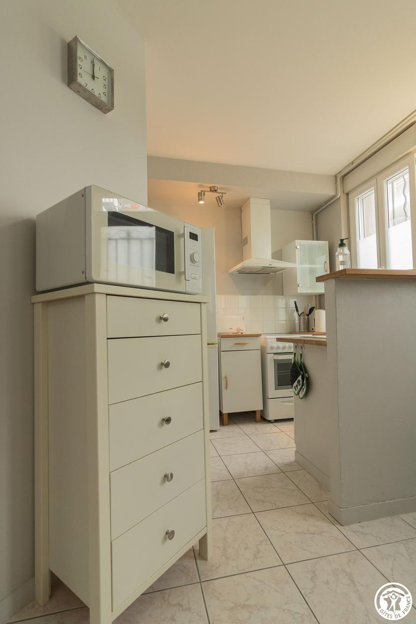 Entrée dans le séjour, espace repas et coin-cuisine, grande chambre (1 lit 2 personnes en 140cm), salle d’eau avec WC. Réfrigérateur/congélateur, four micro-ondes, lave-linge. Matériel bébé sur demande. Chauffage électrique