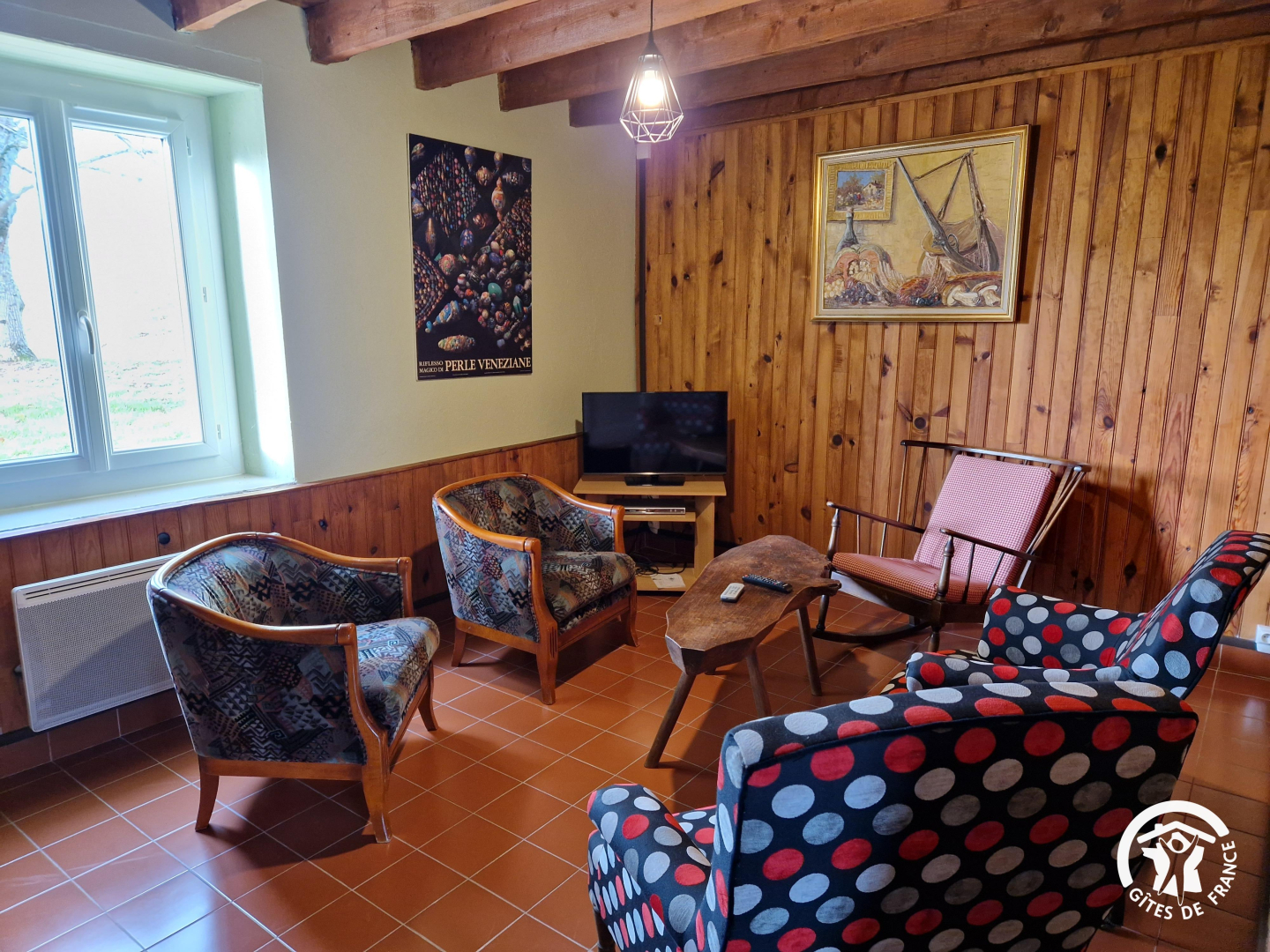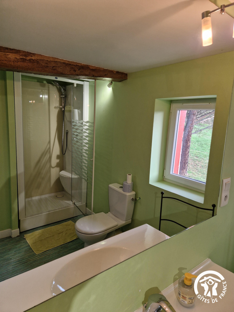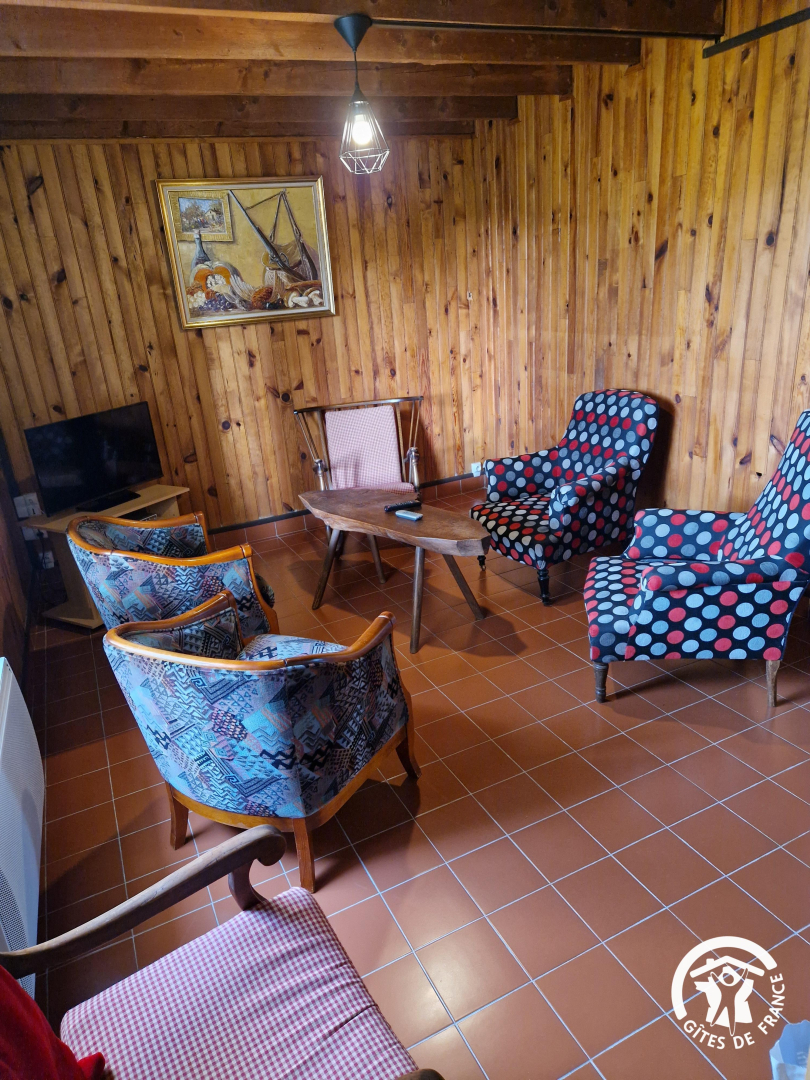 Maison indépendante, à proximité de l’habitation des propriétaires, avec des espaces séparés. Au rez-de-chaussée : grande cuisine bien équipée (cafetière à filtre, senseo, batterie de cuisine, cocotte, batteur…), petit salon, salle d’eau, wc. La cuisine donne sur une terrasse avec salon de jardin, parasol, balancelle. le parc arboré s’ouvre sur une vue dégagée sur la campagne. A proximité, le boulodrome invite à la convivialité.