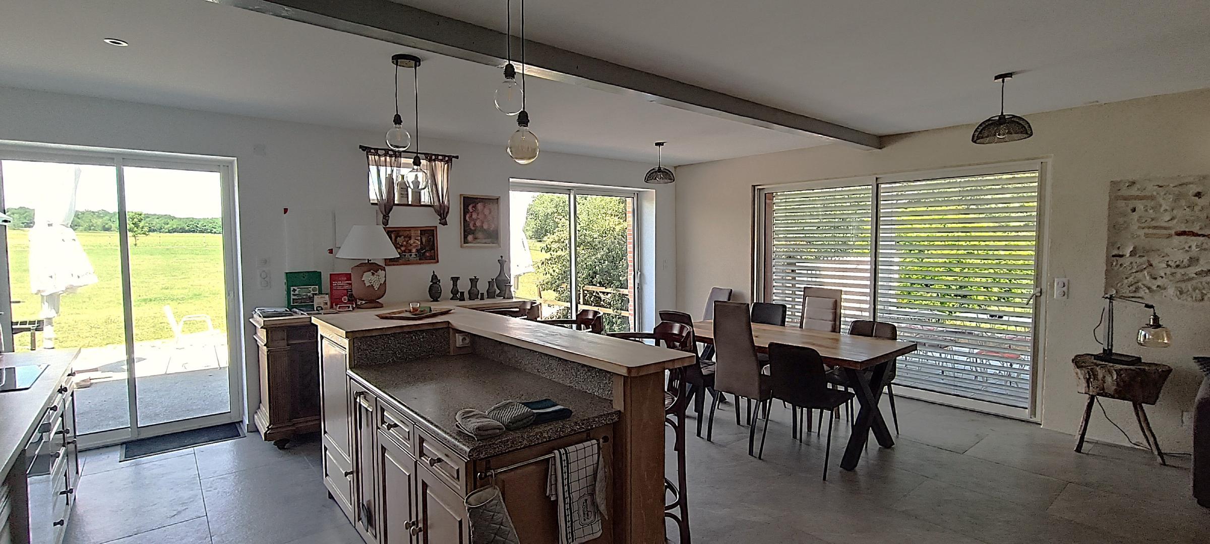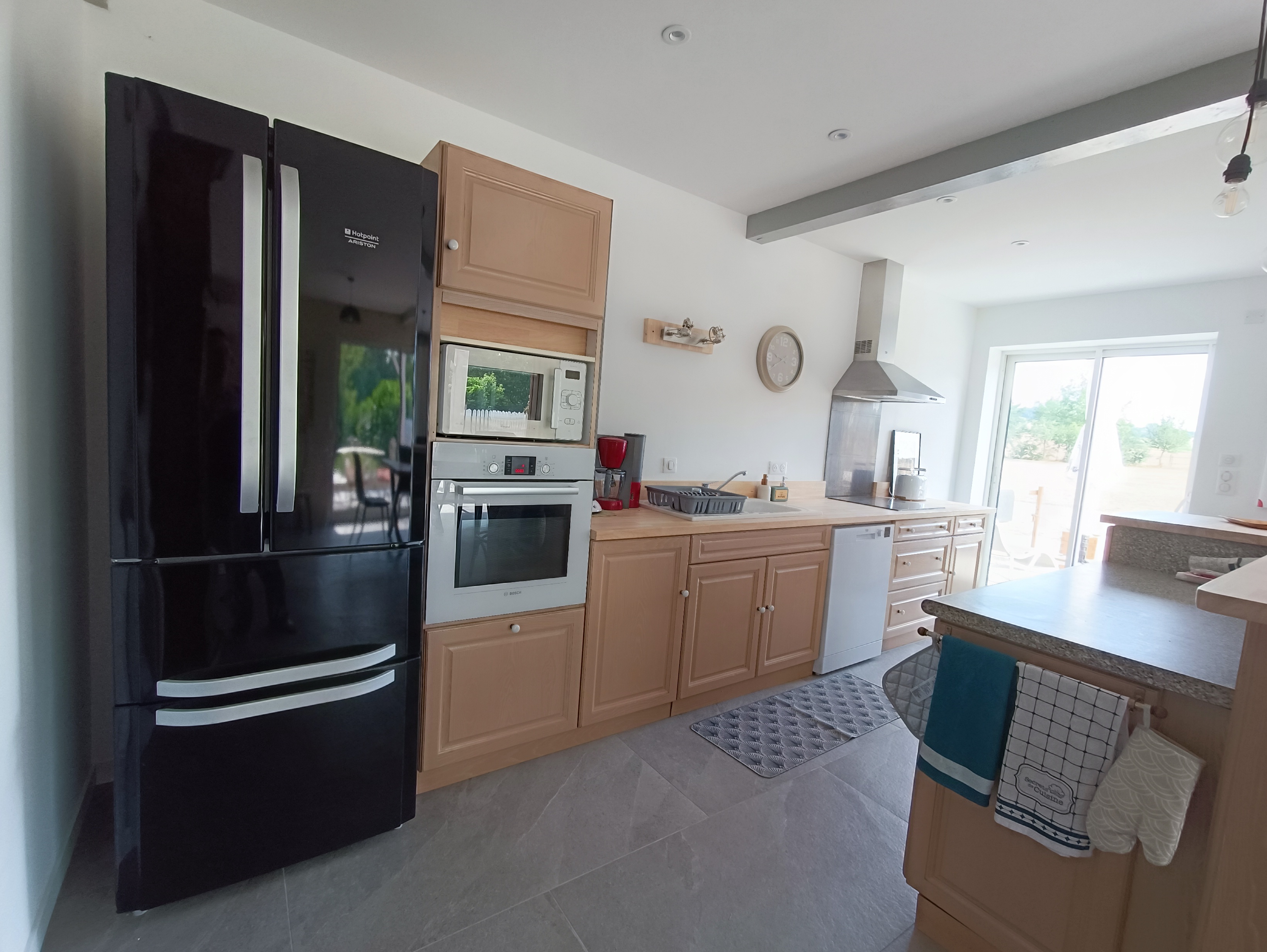 * pièce de vie (45m²) avec coin salon, canapé convertible 140×190, cuisine ouverte toute équipée : plaque cuisson, four, micro-ondes, lave-vaisselle, réfrigérateur, cafetière, bouilloire, grille pain …
