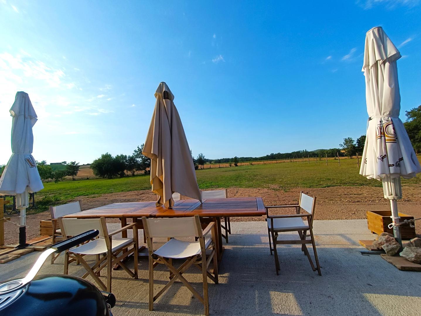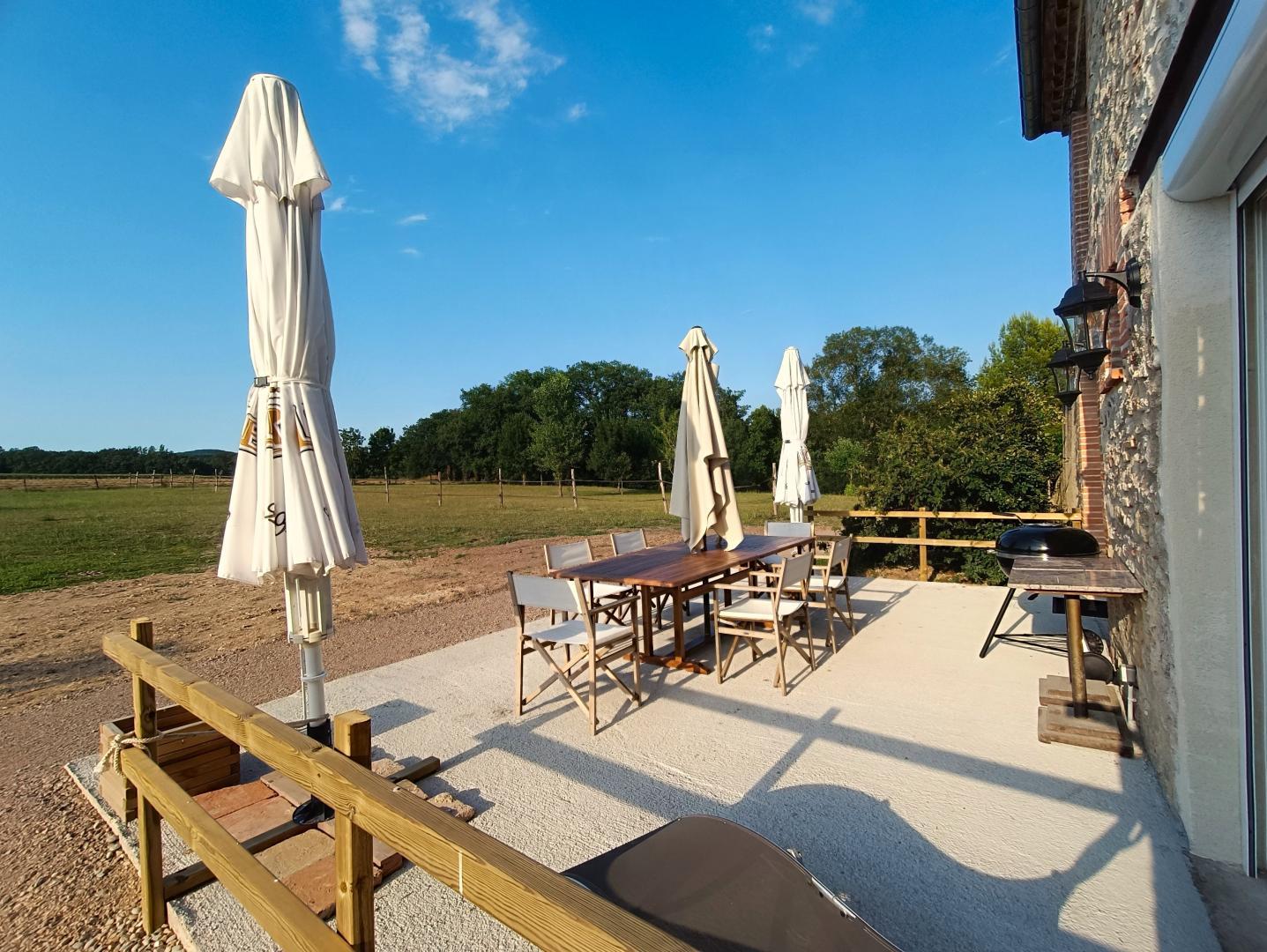 Le Gîte Libellule dispose d’une terrasse couverte 25m² et d’une seconde terrasse de 40m², avec salon de jardin, parasol, barbecue