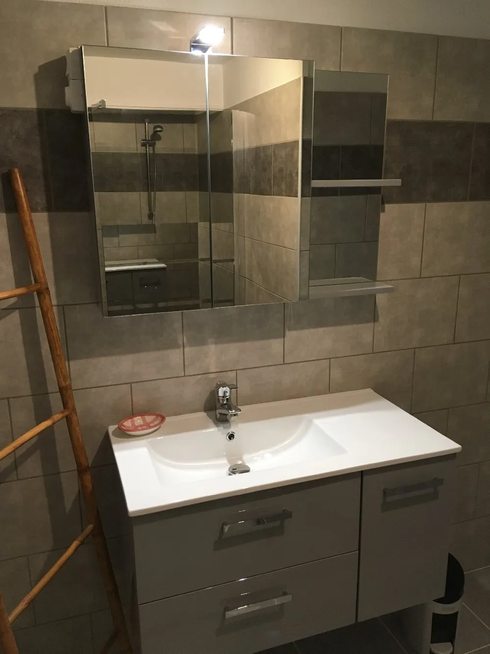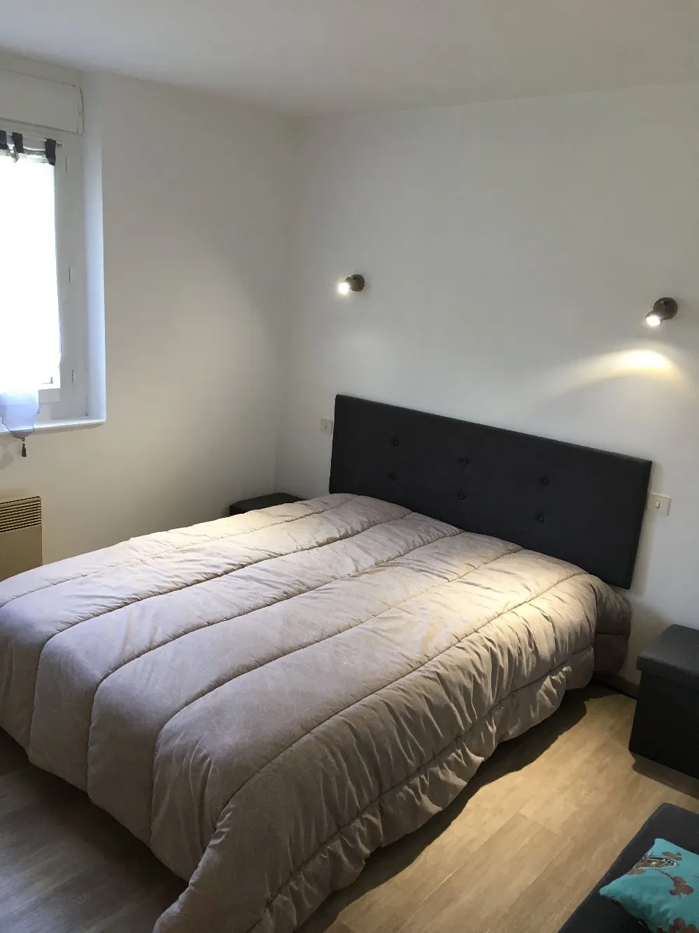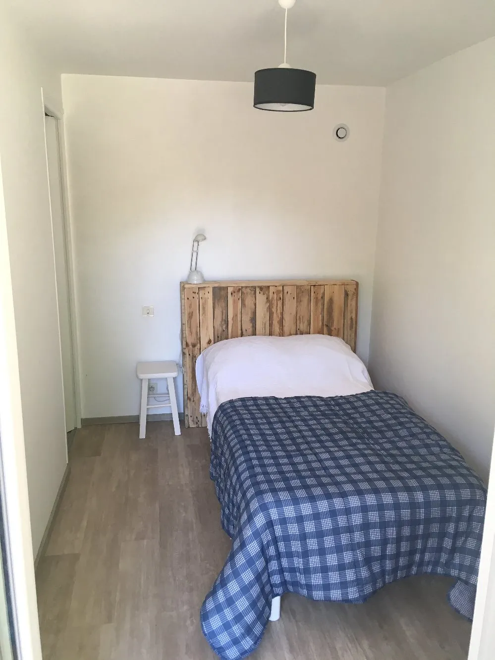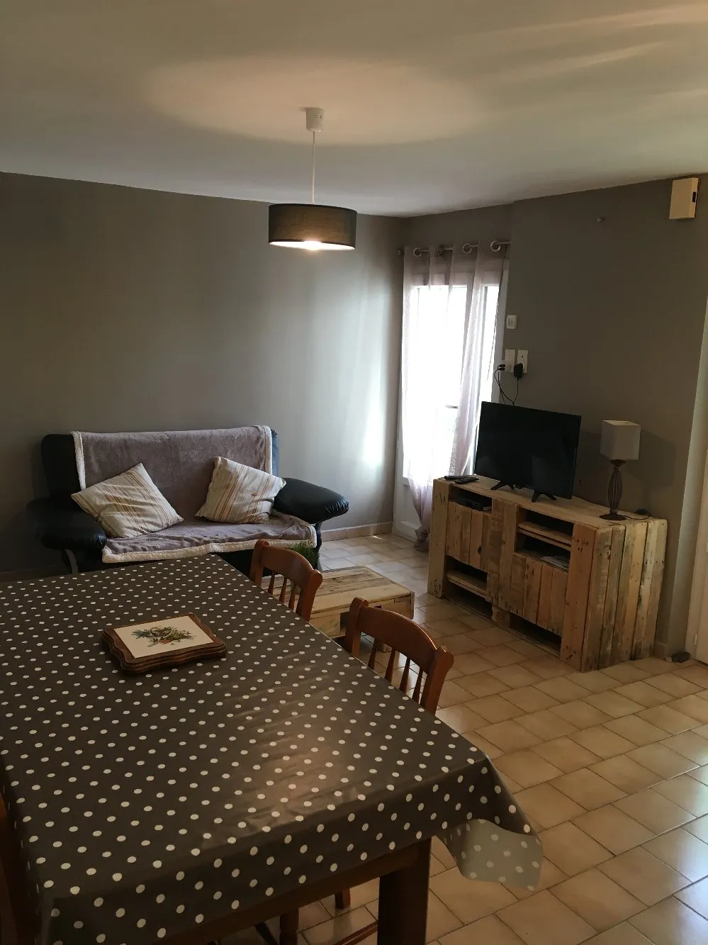 Appartement situé au rez-de-chaussée dans une maison individuelle. Grande pièce à vivre avec coin cuisine tout équipé (lave-vaisselle, lave-linge, micro-ondes, mini-four) et coin séjour avec canapé, table basse et tv. 1 grande chambre avec 1 lit électrique en 140, grand placard. 1 petite chambre avec 1 lit en 90 et placard. 1 cellier de rangement. 1 salle d’eau avec douche, wc indépendant. 1 véranda équipée avec un salon de jardin. Jardin et parking privatif
