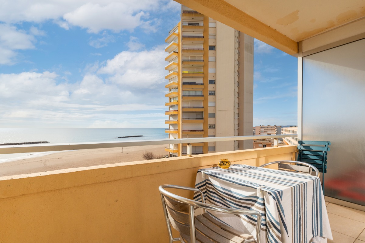 Appartement F2 cabine, 40 m², 4ème étage. Au bord de la mer, à 2km du centre-ville, à 2km du port. Parking privé, balcon, loggia, salon de jardin. Télévision, DVD, congélateur, lave linge, lave vaisselle.