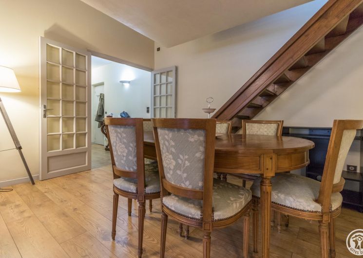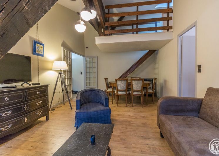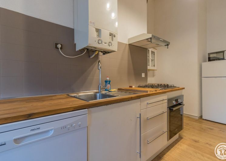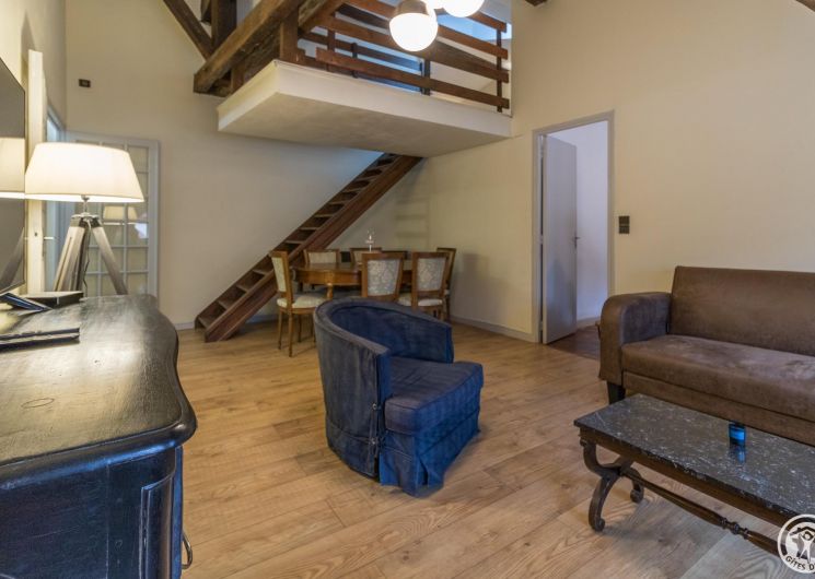L’hébergement fait 62m2 : entrée, cuisine intégrée avec petit espace repas (4 plaques gaz, four, micro-ondes, réfrigérateur-congélateur et lave-vaisselle), séjour avec coin salle à manger et coin salon (TV, bureau), une chambre (2 lits simples en 90*190cm jumelables en 1 lit double de 180*190cm), salle de bains/WC (baignoire et vasque). Un lit double est disponible sur la mezzanine, très basse de plafond (escalier raide). Chauffage central au gaz. Connexion Internet wifi.