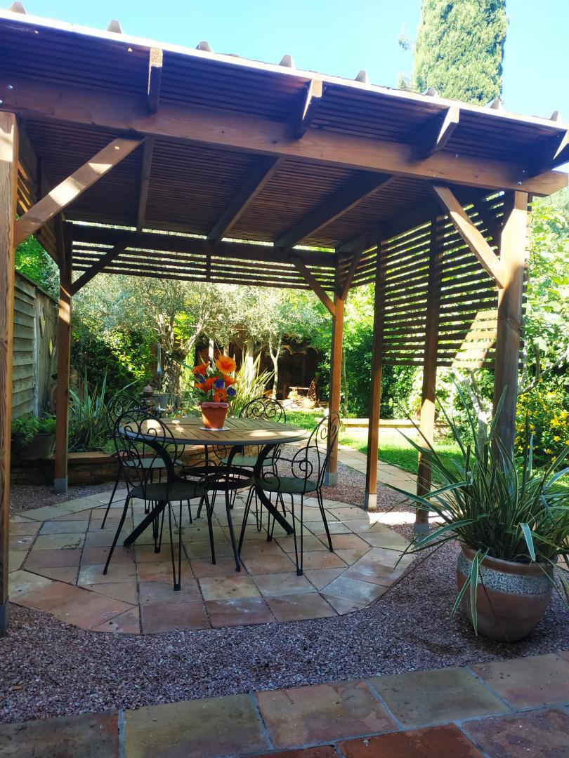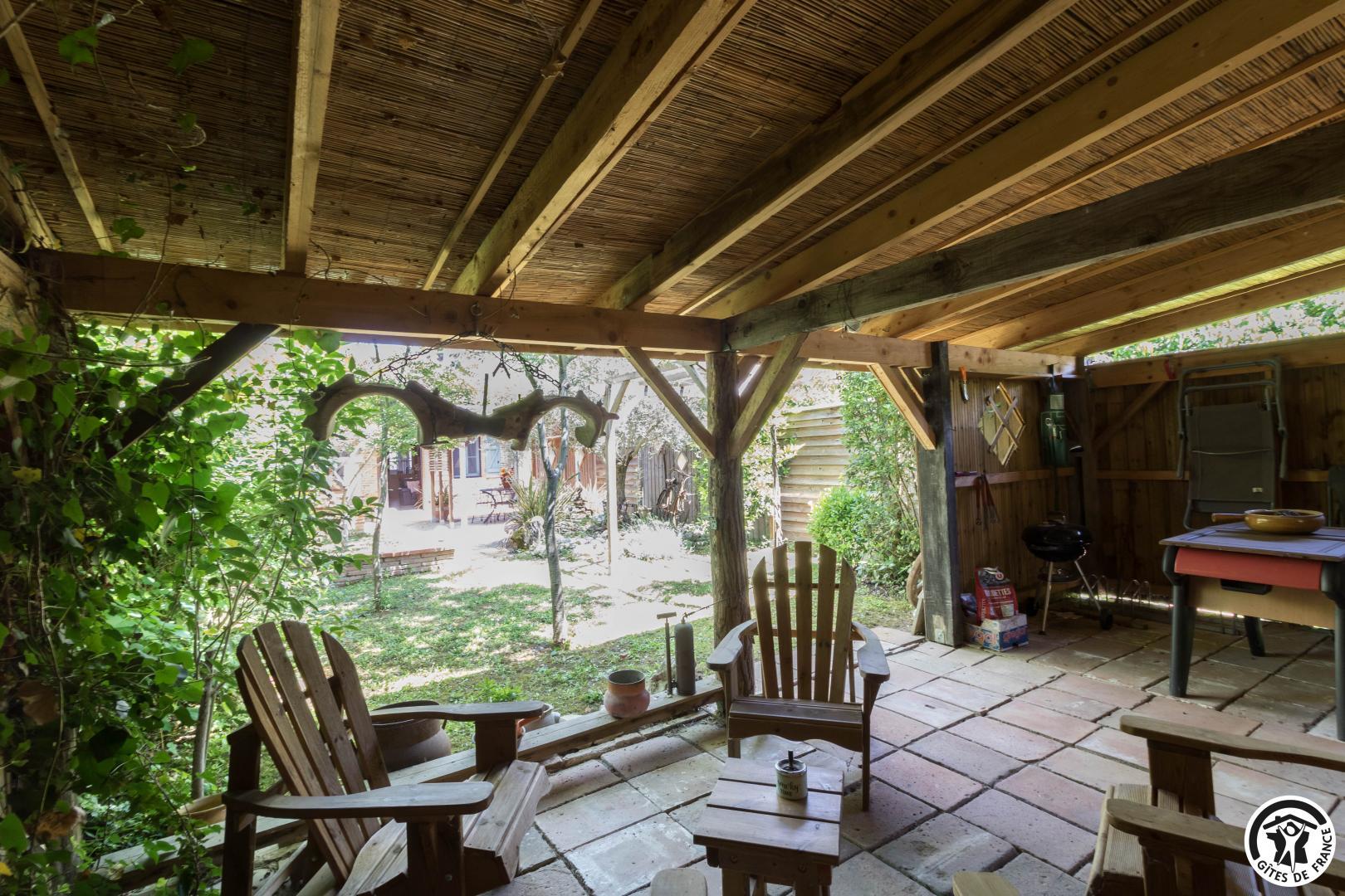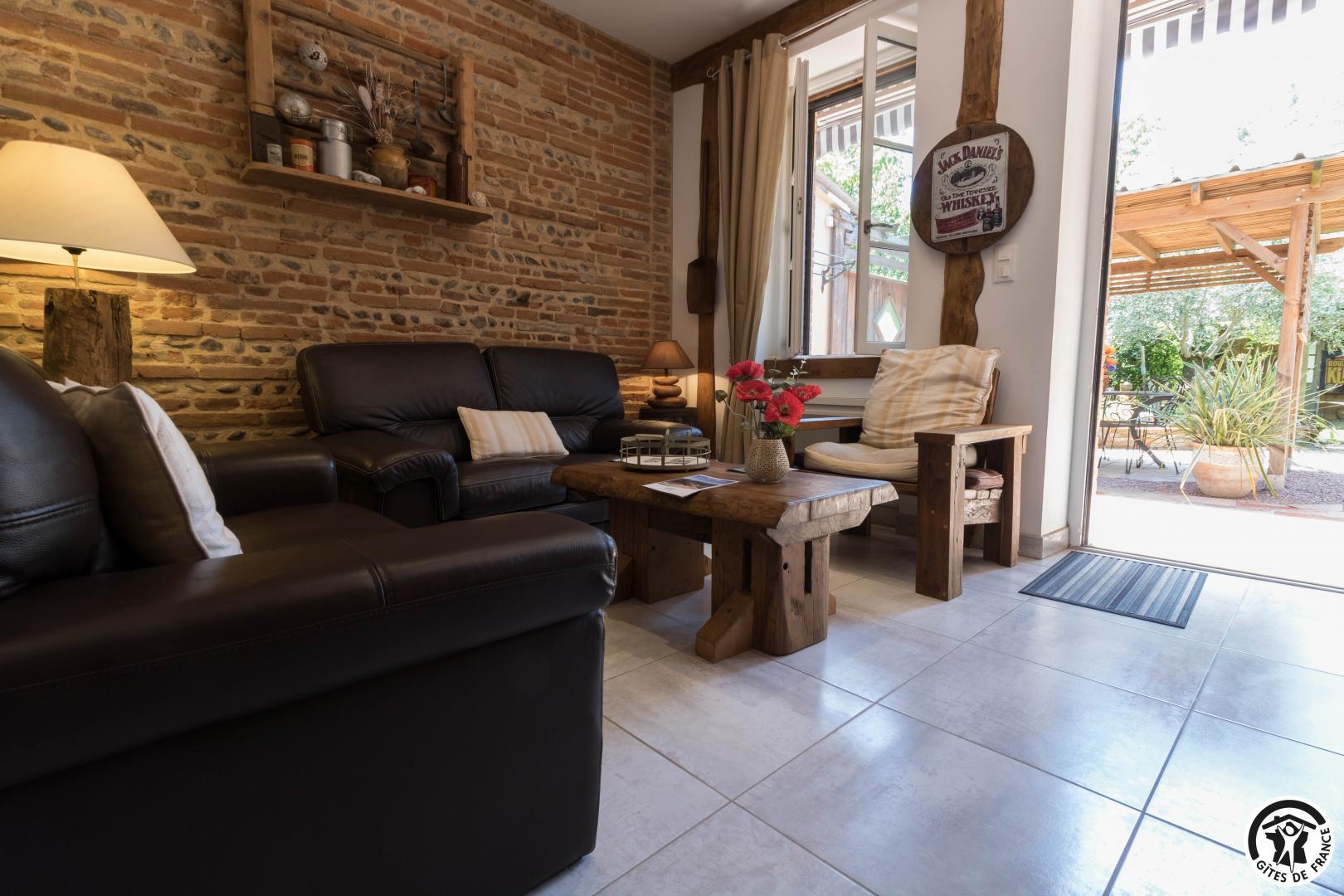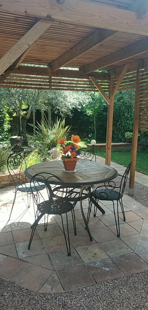 Gîte de plain pied : entrée, cuisine intégrée, agréable séjour typique d’une maison toulousaine, avec mur de briques et galets et réemploi de poutres de chêne (colombages). Salle à manger et coin-salon. Deux chambres (1 lit 2 personnes en 160cm) (2 lit 1 personne en 90cm), salle d’eau, WC. A l’arrière, jardin clos privatif proposant deux terrasses dont une abritée. Maison mitoyenne de la maison des propriétaires. Salon de jardin, salon de détente, transats, terrasse abritée, babyfoot. Stationnement gratuit dans la rue.