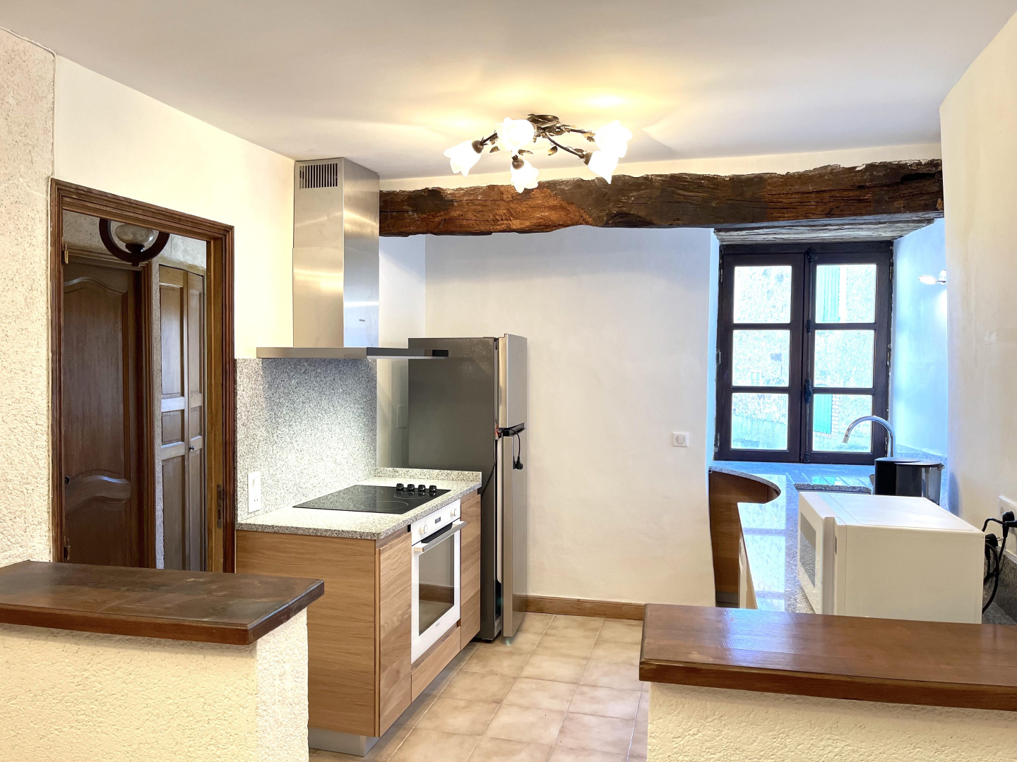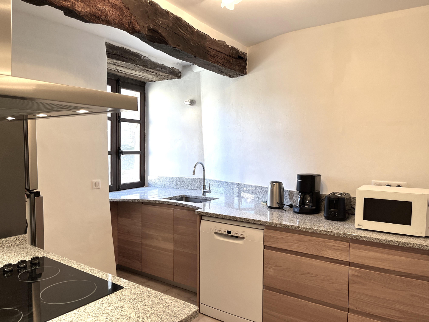 – cuisine contemporaine toute équipée (lave-vaisselle, four, micro-ondes, réfrigérateur-congélateur, batterie de cuisine et vaisselle)