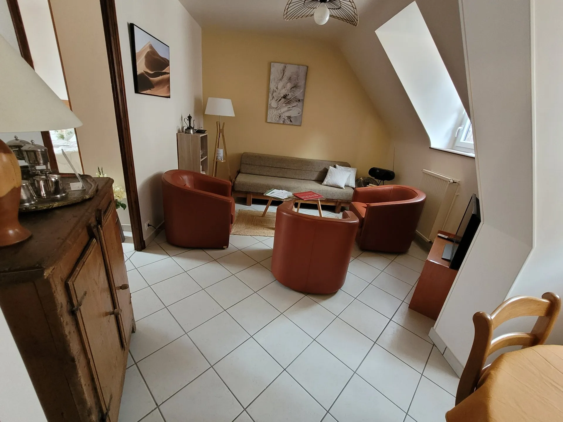 Au 1er étage, un appartement plus grand, l’Amiral, pour trois personnes uniquement qui accueillera deux hôtes dans la chambre à deux lits simples et le troisième hôte dans le salon doté d’un « vrai » lit simple ;