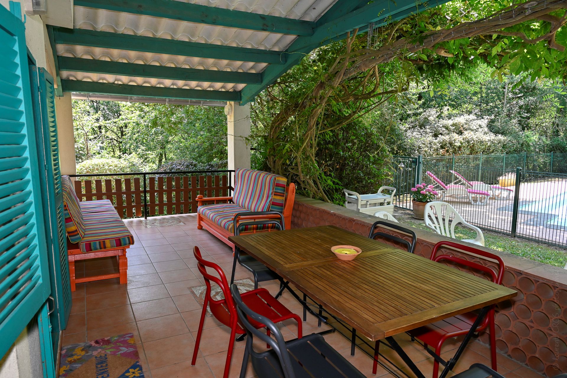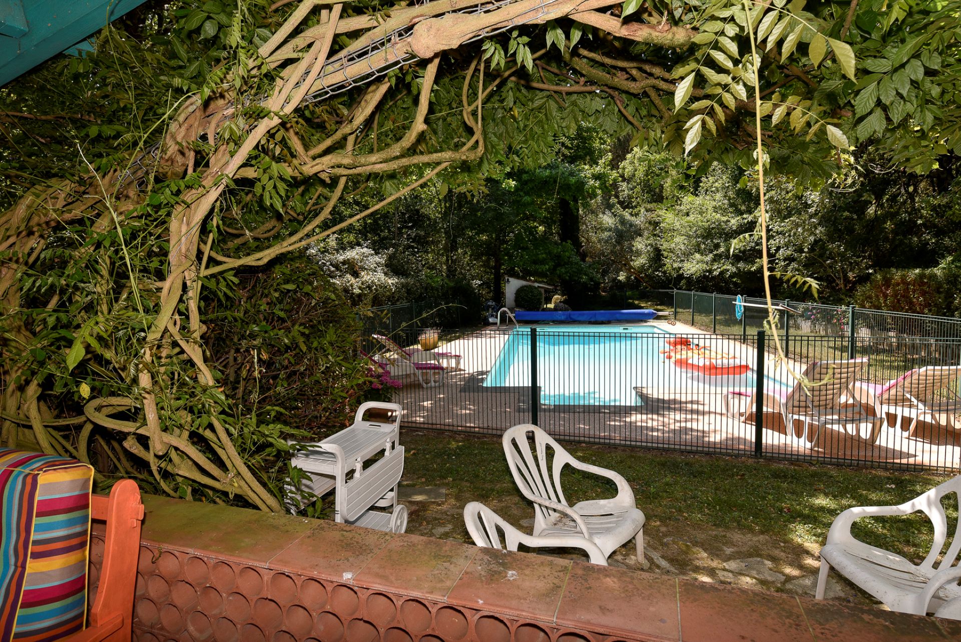 Extérieur : balcon/terrasse 24 m2. 7500 m2 non clos arboré dont une partie est boisée et pentue. Salon de jardin, barbecue, 2ème salle d’eau + WC + lave linge. Piscine illuminée 11 m x 5 m x 2,50 m profondeur maxi (ouverte du 15 juin au 30 septembre). Chaises longues.