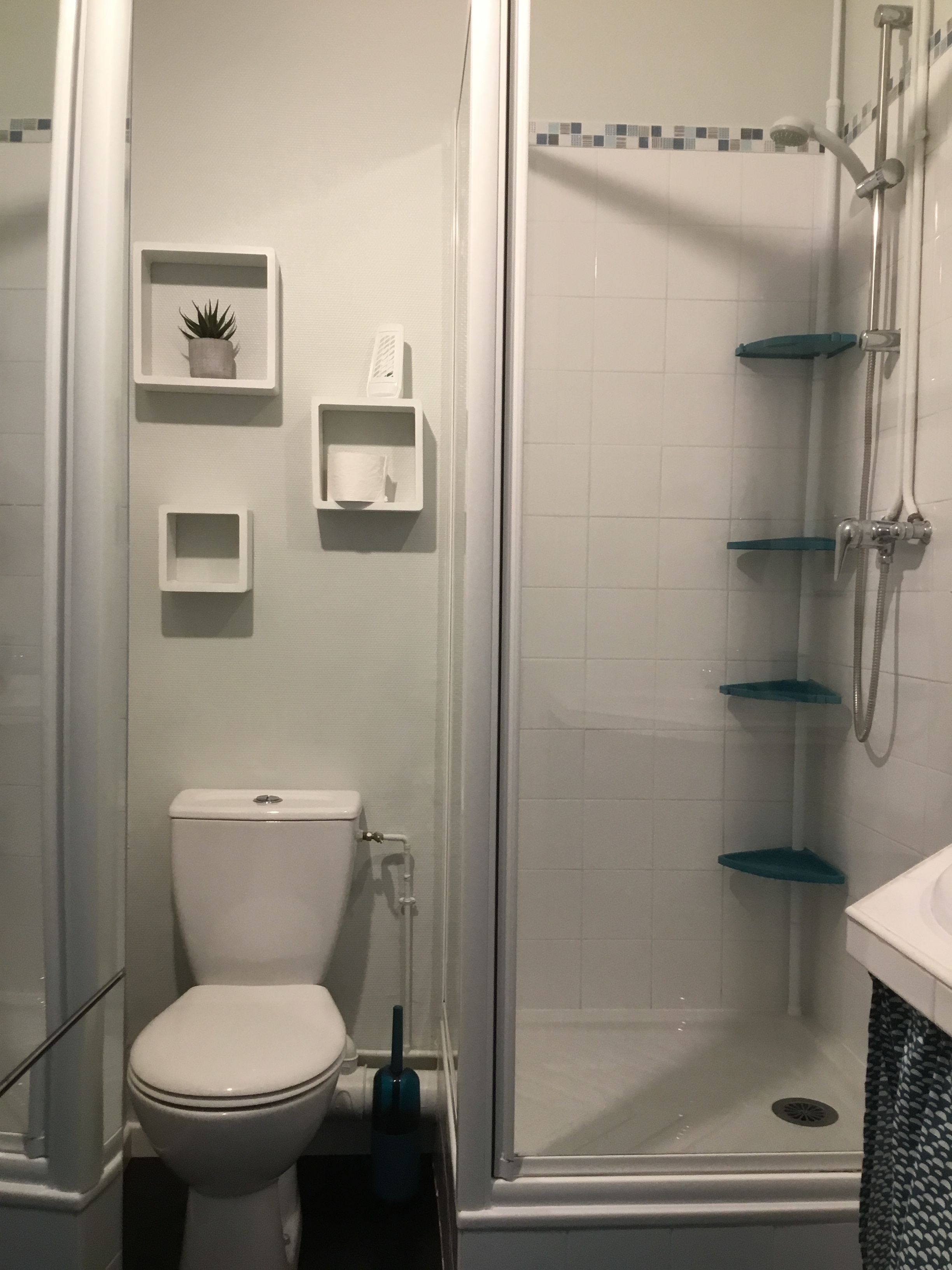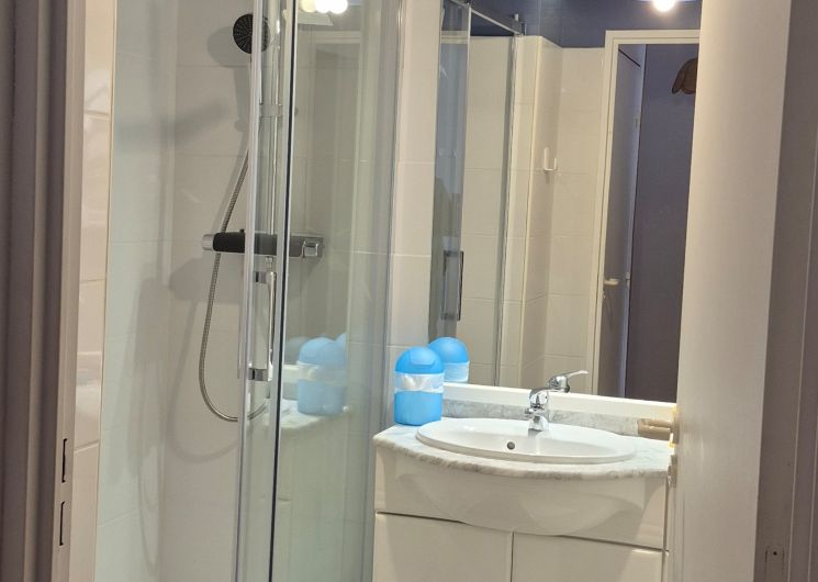 Salle de Bain équipée d’un radiateur sèche serviette et d’un sèche-cheveux.