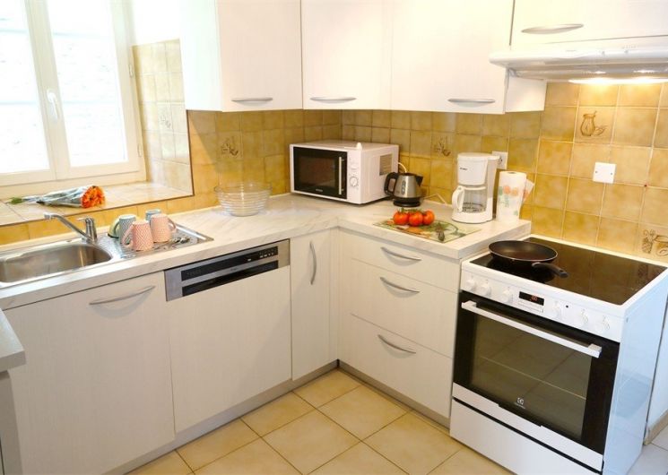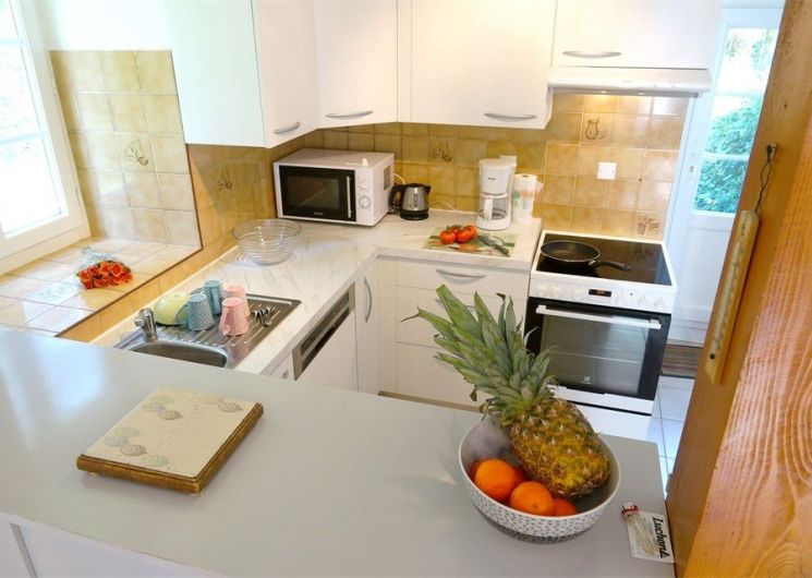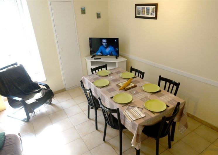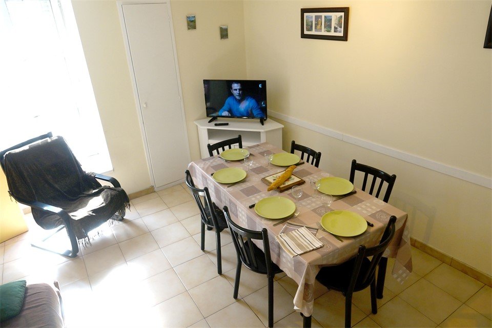 Au rez-de-chaussée : Coin cuisine intégrée et entièrement équipée, séjour salon attenant avec espace repas et un canapé convertible en 140. Salle d’eau avec WC.
