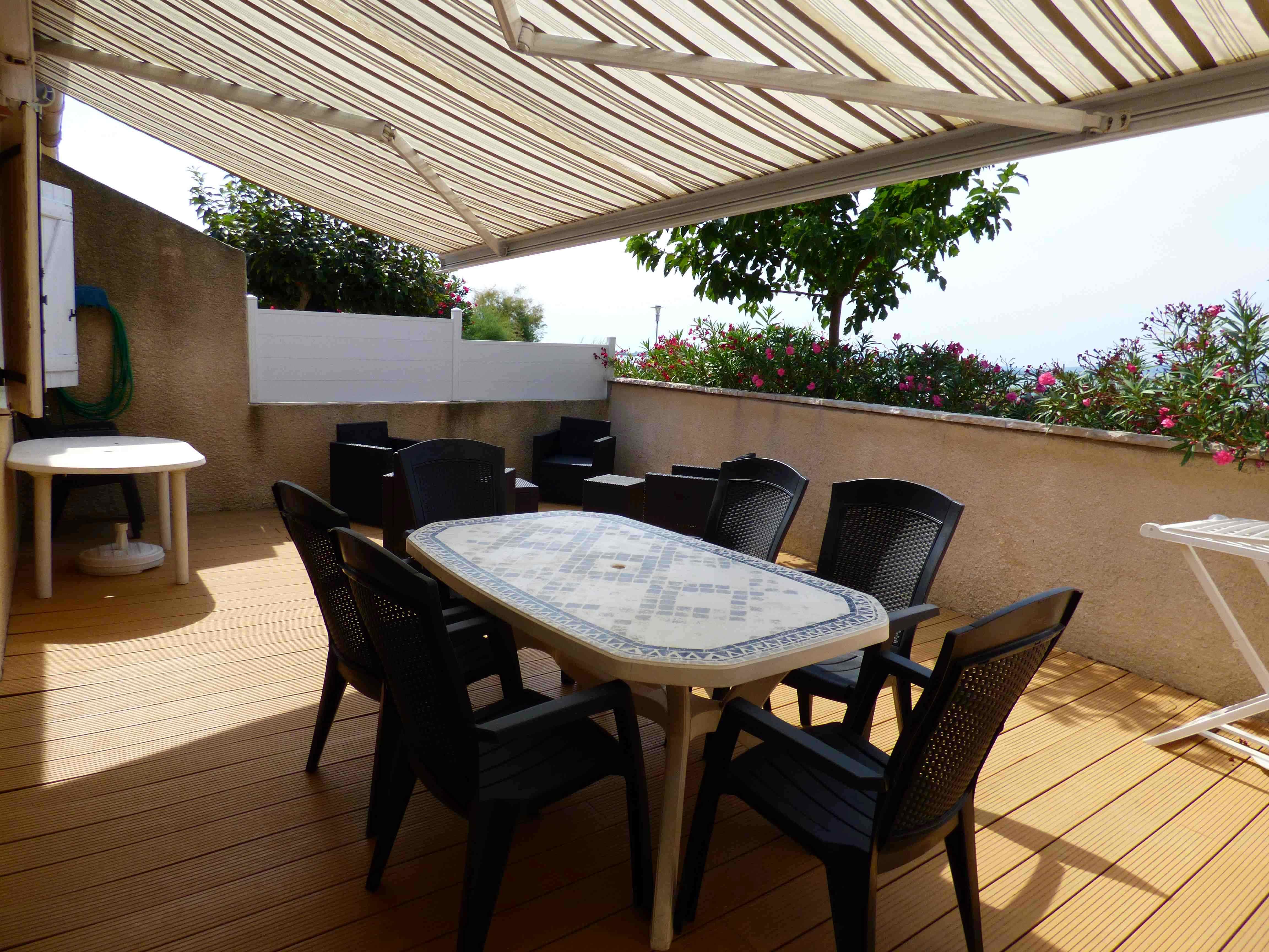 Sa terrasse ombragée de 35m², entièrement close (table, chaises et fauteuils de jardin-Plancha )