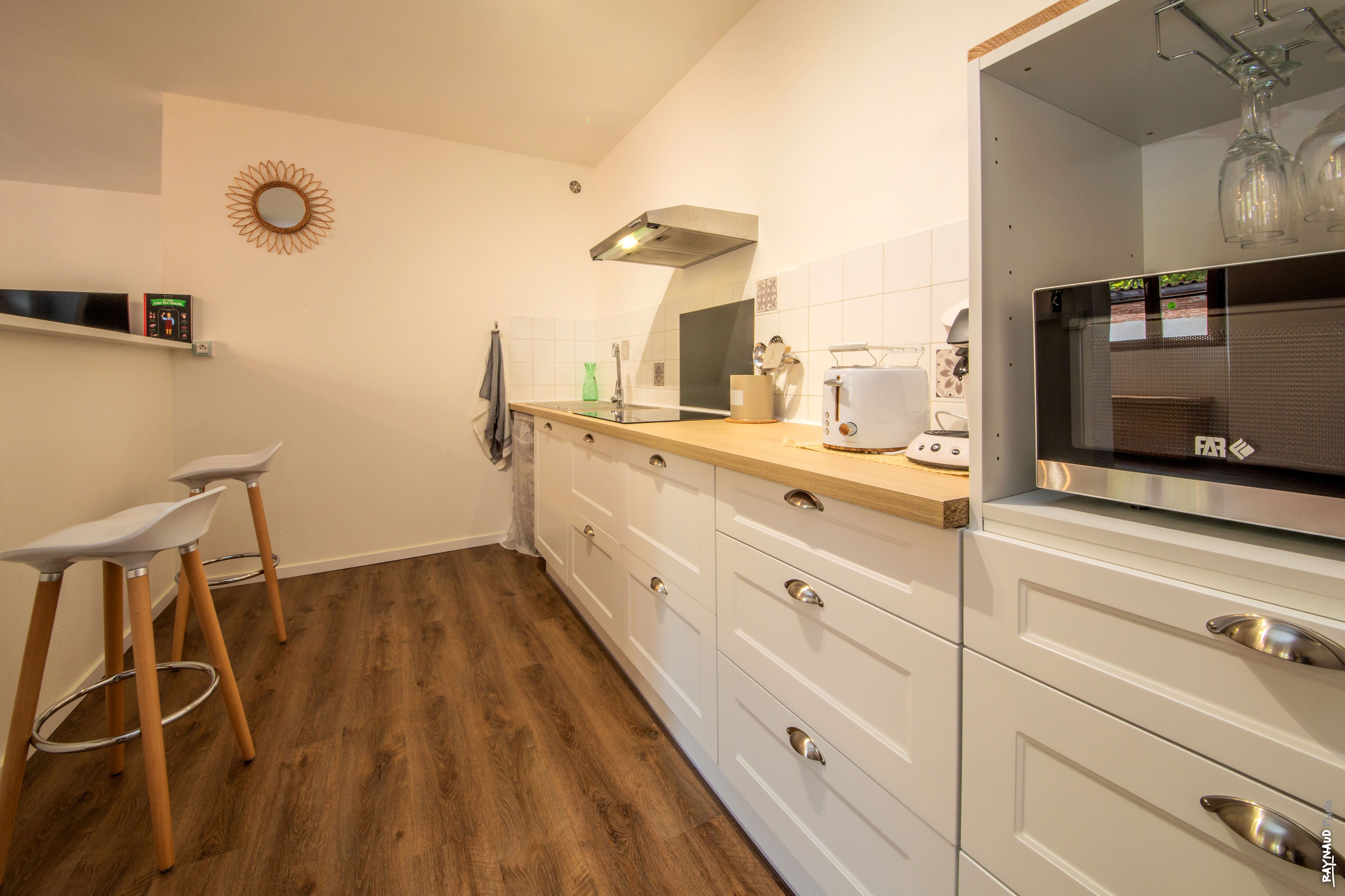 * Cuisine équipée avec four, micro-ondes, réfrigérateur, poêles, casseroles, ustensiles de cuisine et vaisselles
