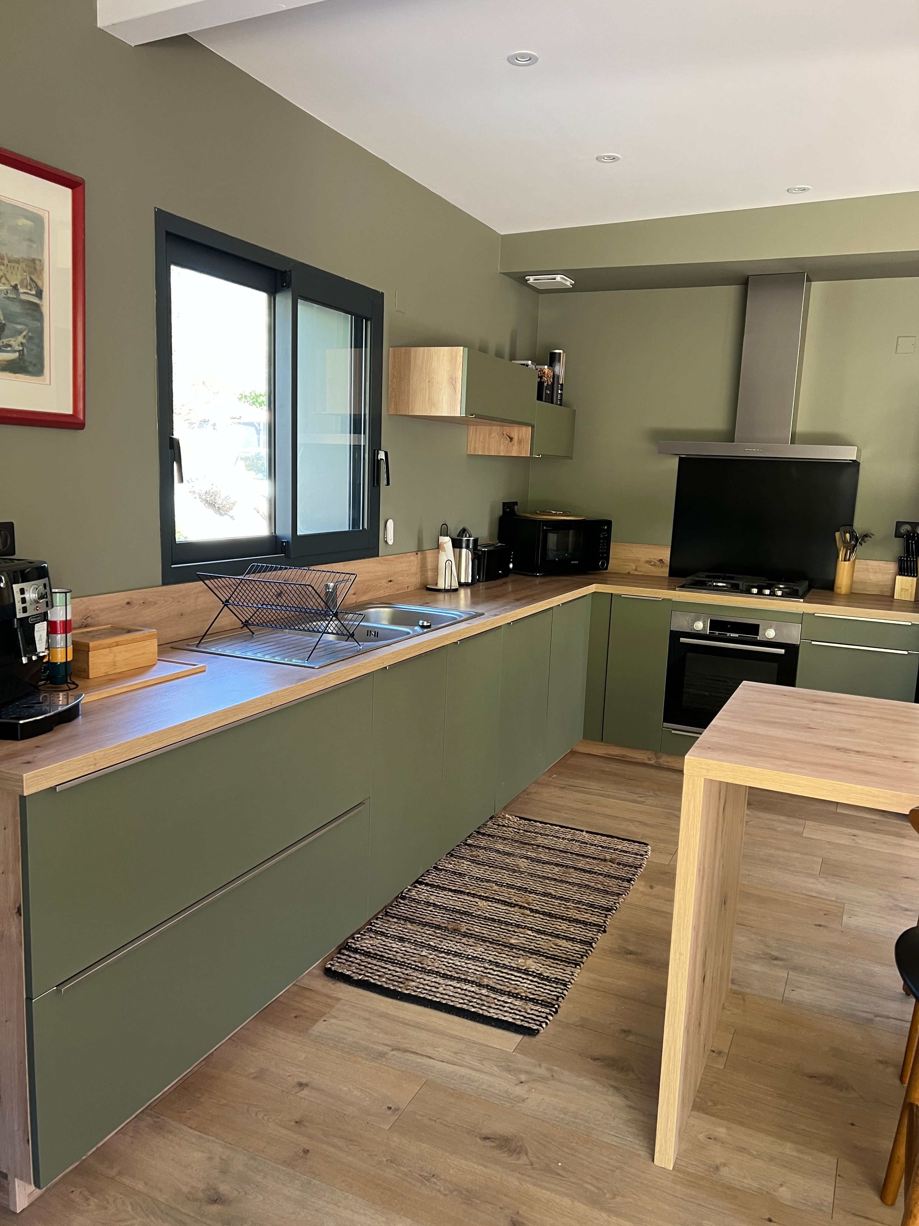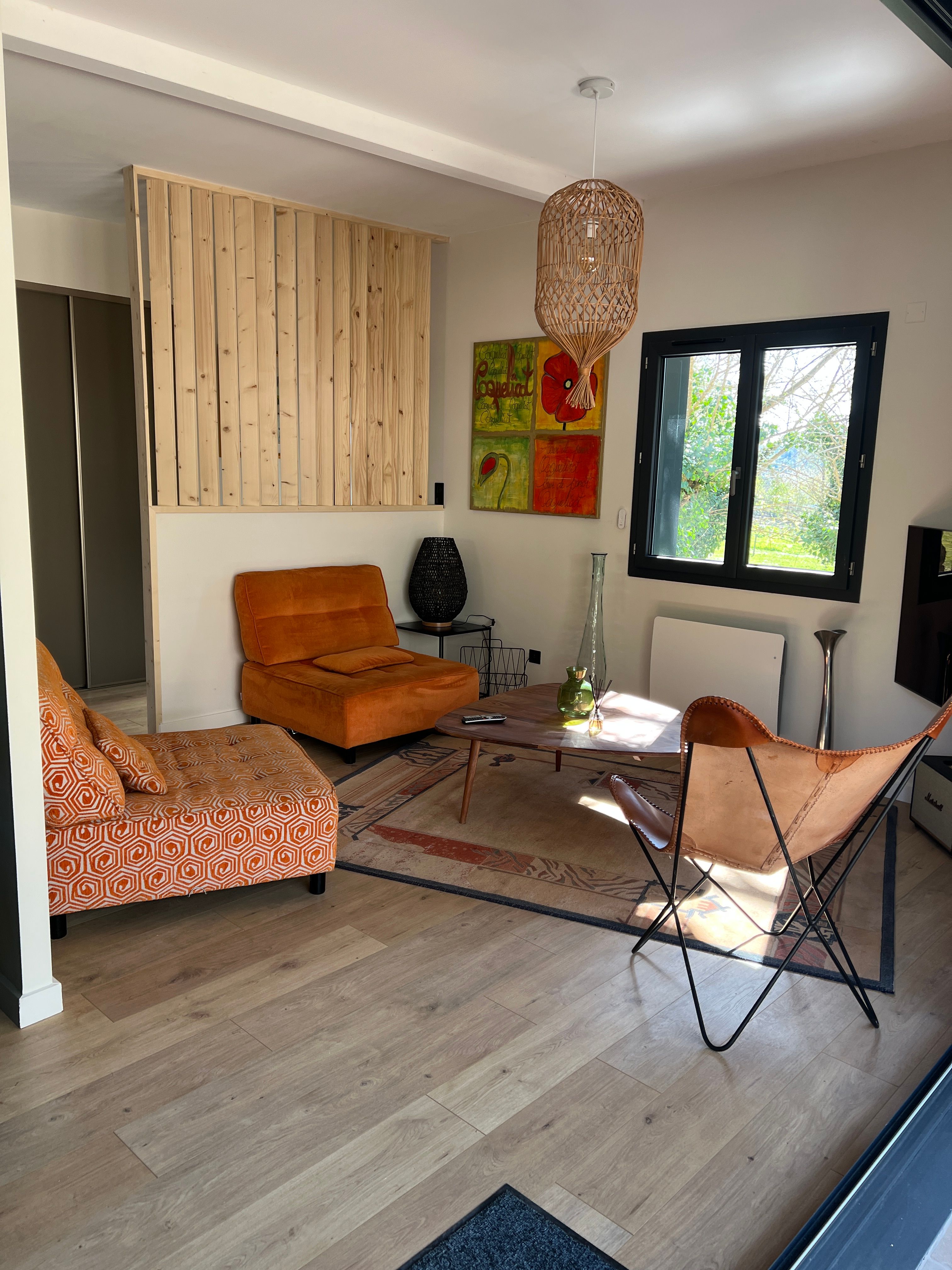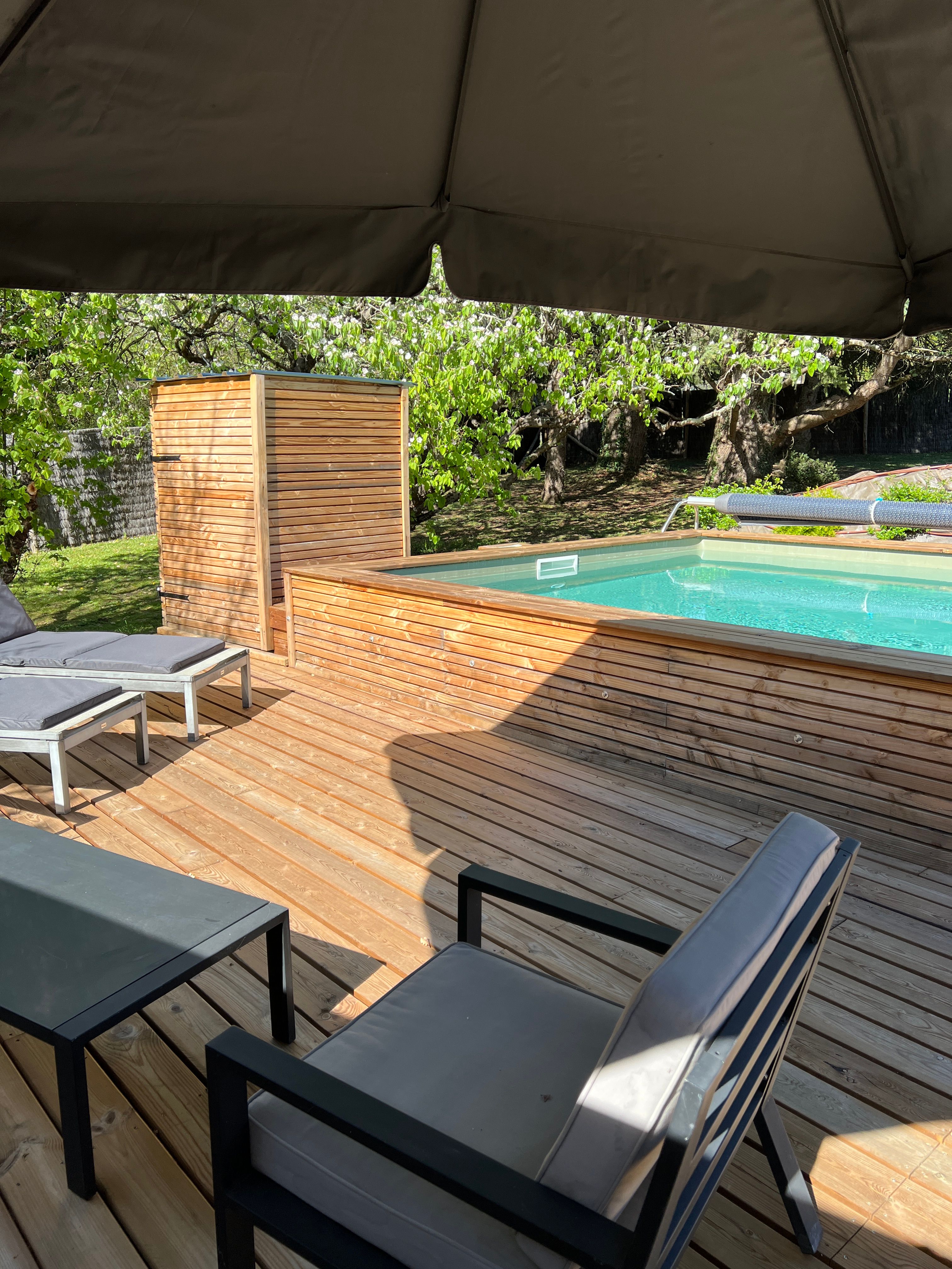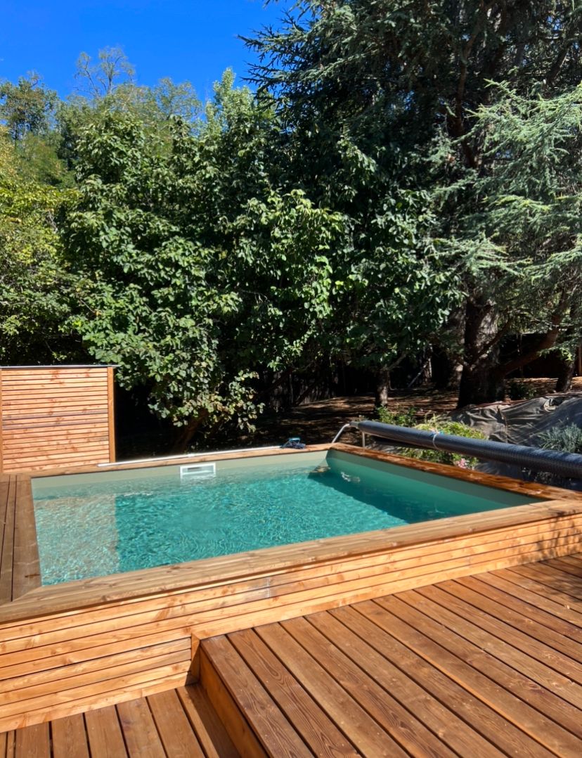 Logement de plain-pied après trois larges marches extérieures, entrée indépendante. Il comprend : 1 séjour avec espace cuisine (éléments intégrés, réfrigérateur-congélateur, four, plaques, lave-vaisselle) et salon (canapé, pouf, TV, poêle bois), 1 cellier (lave-linge, sèche linge), 1 chambre (1 lit 160/190) avec salle d’eau communicante (2 vasques, 1 douche à l’italienne), 1 wc indépendant. wifi dans le logement, linge de maison, de lit et de toilette fournis, peignoirs fournis. Terrasse privée en bois (80m2) où se trouve la piscine carrée privée (4m x 4m, 1,2m de profondeur). Terrasse devant le salon avec salon de jardin, barbecue. Parking privé. 2 vélos VTC sur place. Chauffage électrique.et climatisation