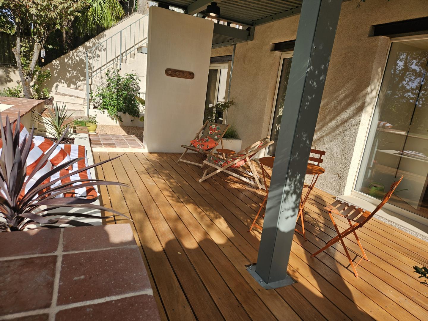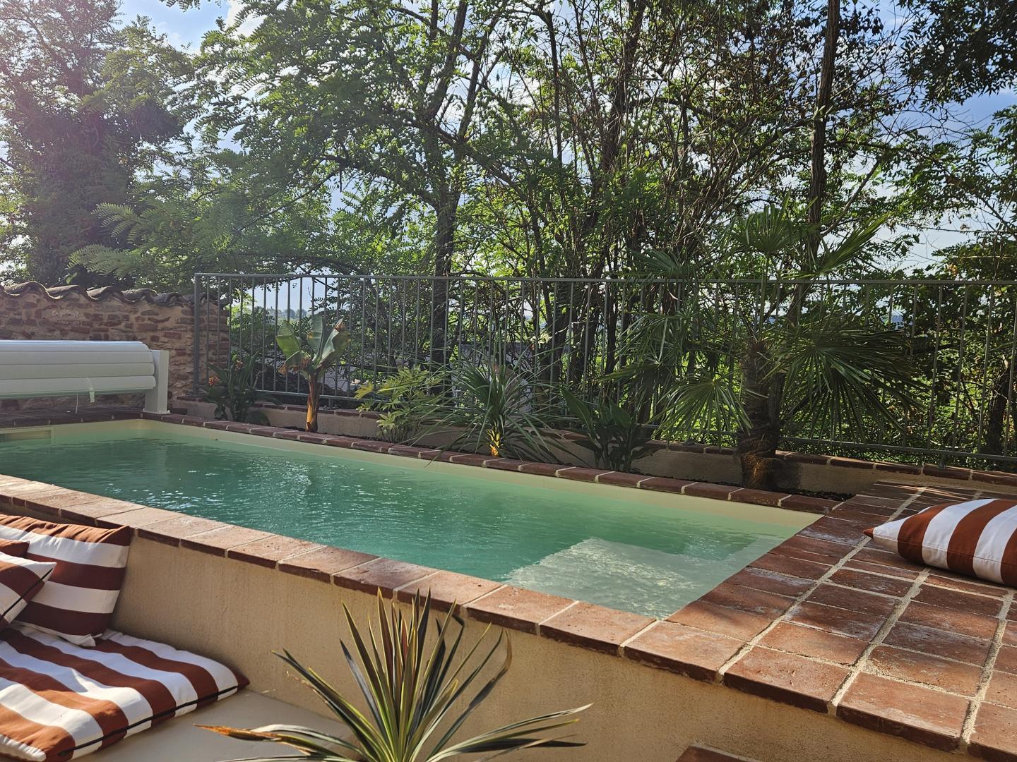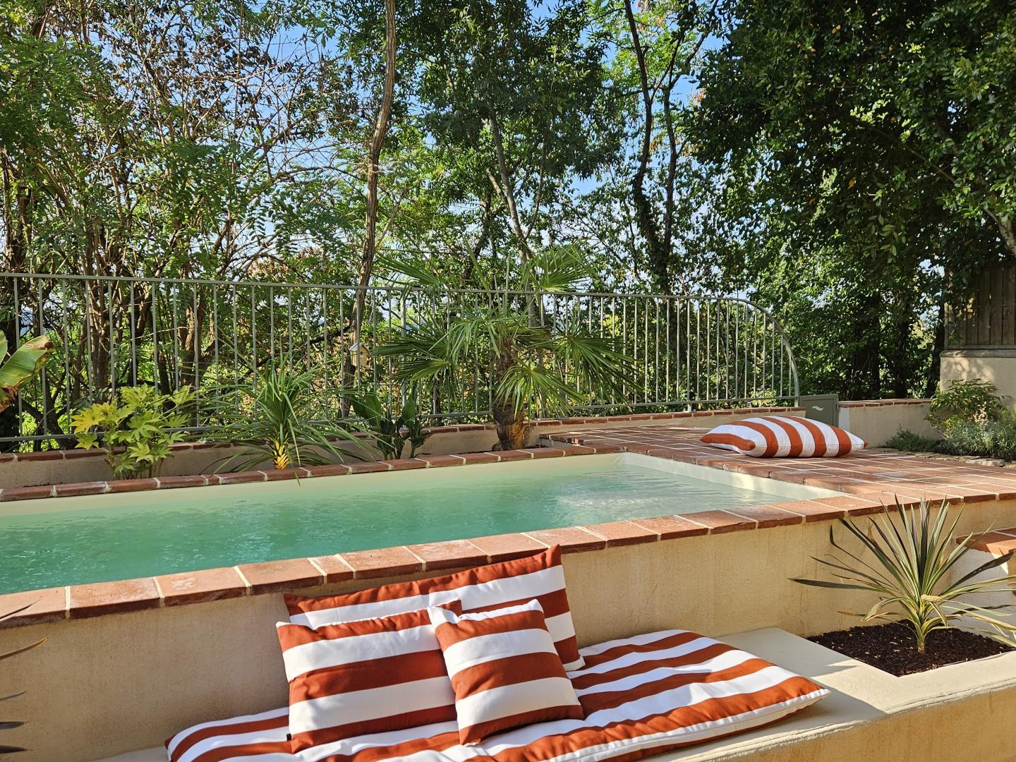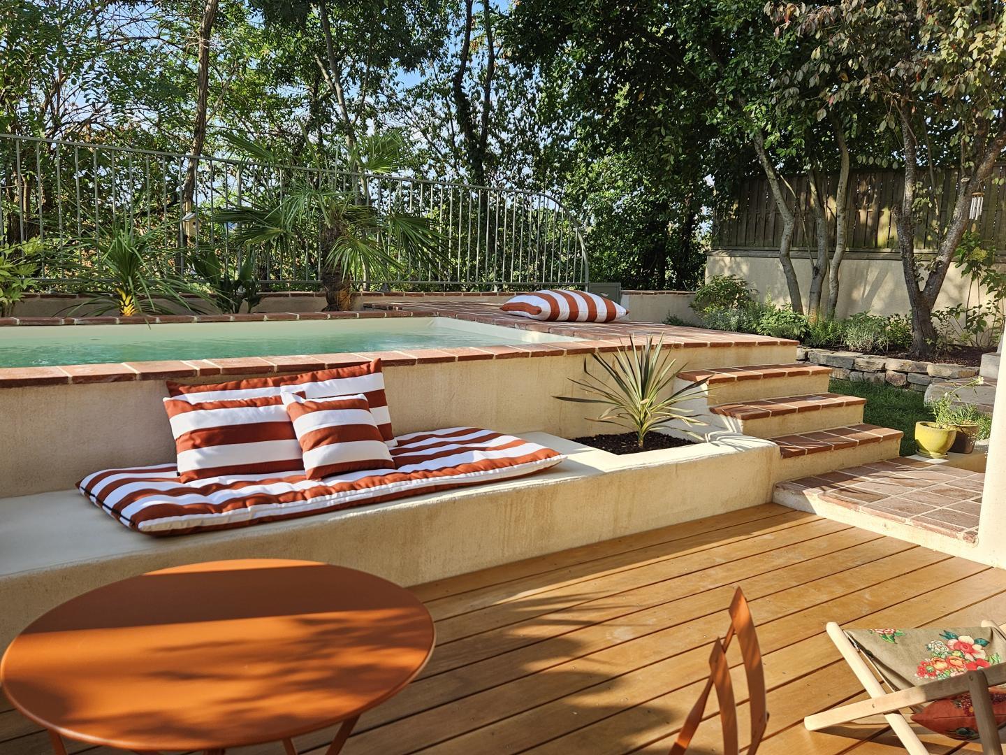 – terrasse en bois et piscine privatives (2x5m, profondeur 1m20) avec banquette intégrée et douche extérieure, jardin luxuriant, barbecue, salon de jardin