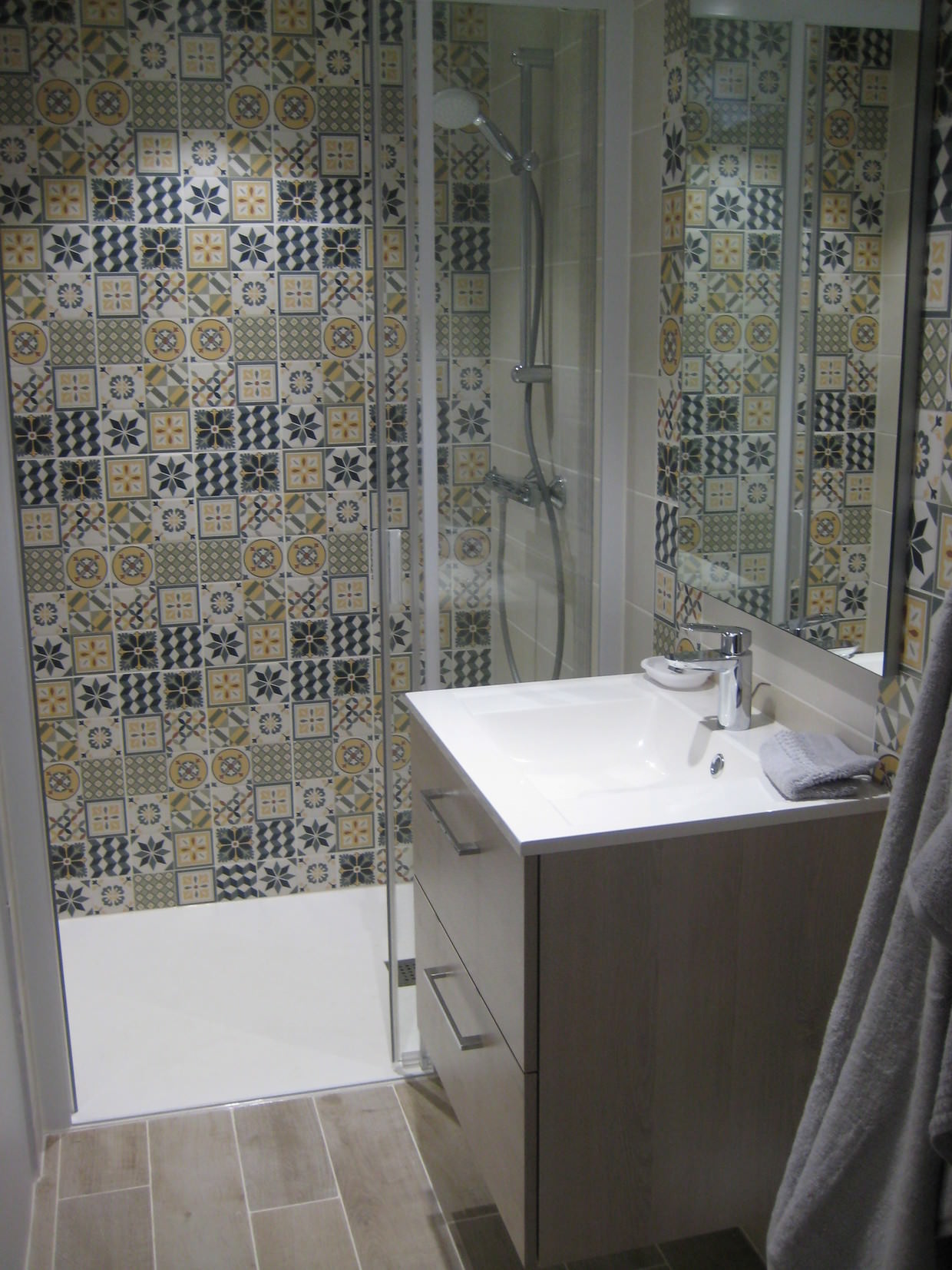 Pièce à vivre avec cuisine équipée, coin repas, salon (canapé, TV, WIFI) – Chambre séparée (lit électrique 160×200 modulable en 2 lits 80×200 sur demande) – Grande douche à l’italienne – WC séparés – Equipement pour bébé sur demande – Local vélo/moto/skis – Parking privé – Terrasse avec table/chaises/parasol et chaises longues – Linge de maison et de lit fournis – Linge de toilette sur demande – Animaux non acceptés