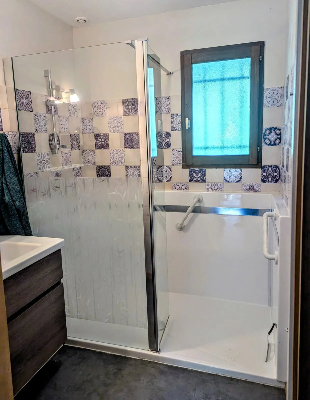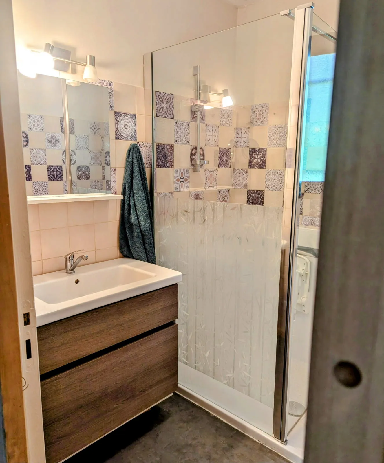 La Salle de bain est équipée d’une douche PMR, les WC sont séparés.