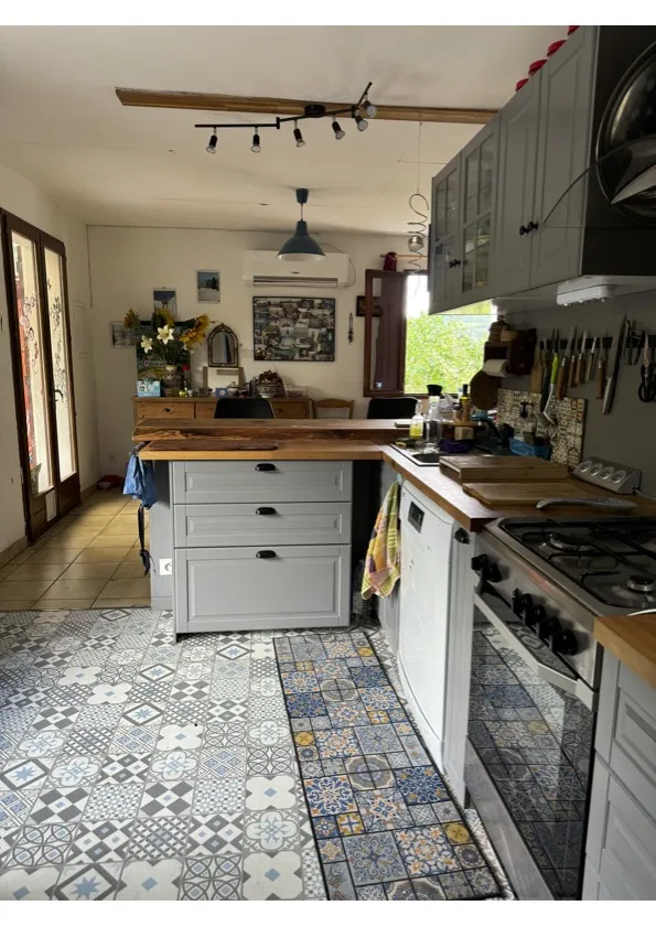 La cuisine entièrement équipée comporte un frigo, congélateur, lave-vaisselle, cuisinière gaz et électrique + four. La vaisselle est neuve.