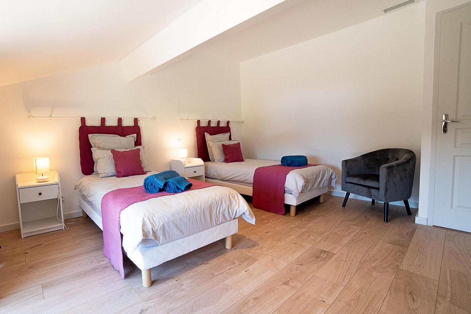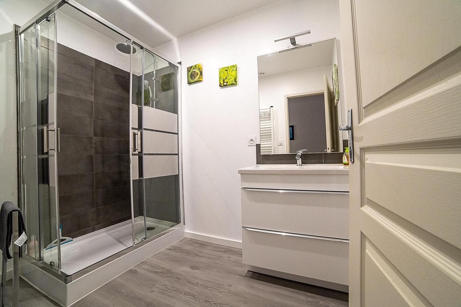 Le séjour offre un coin canapé lit avec une télévision, une cusine équipée et un espace pour dîner pour 10 personnes. Le gîte est composé de deux coins de nuit séparés avec chacun un escalier. De chaque côté, il y a une chambre avec lit double, une chambre avec deux lits de 90, une salle d’eau et des wc séparés.