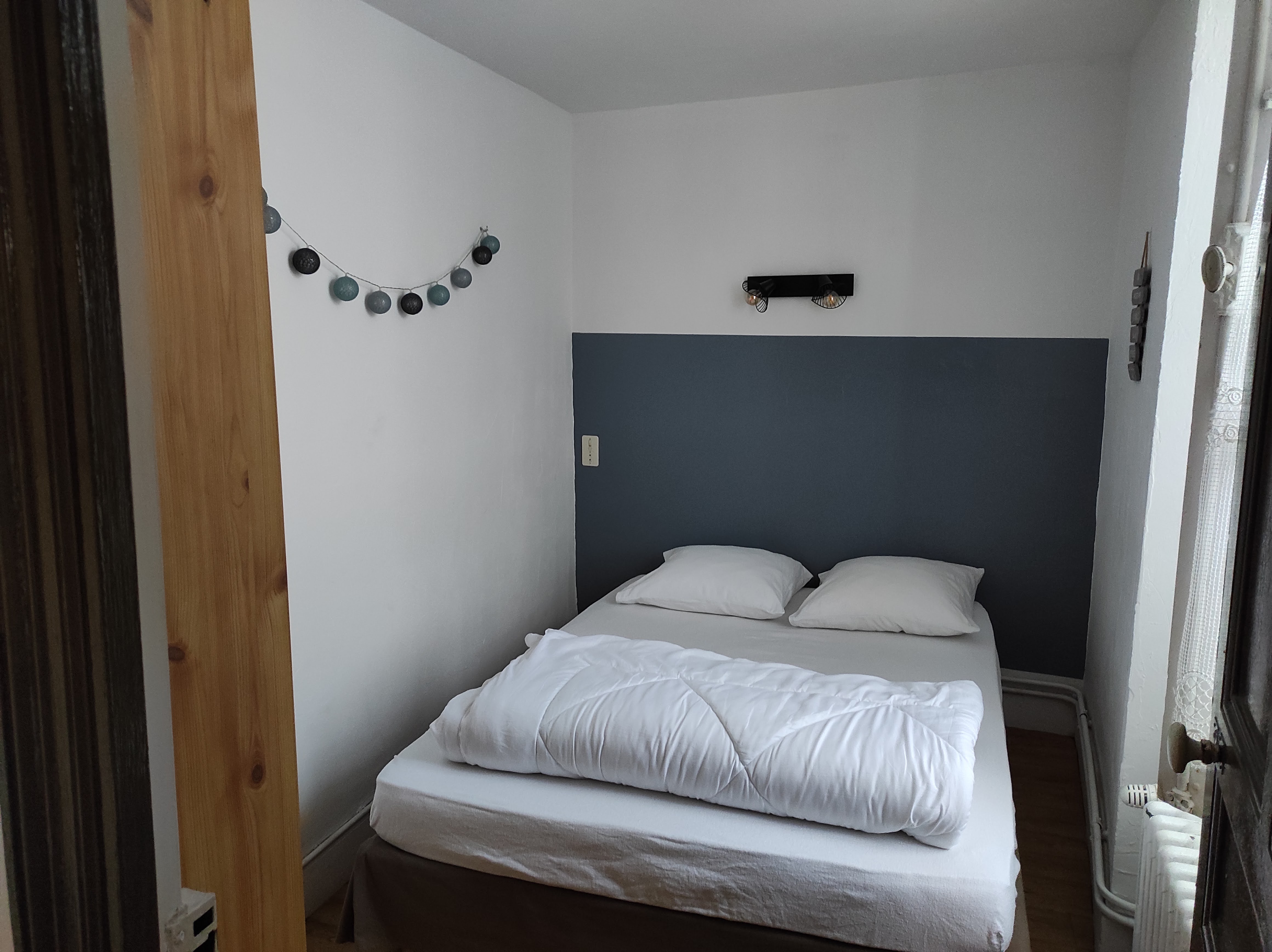 La maison dispose d’un séjour-cuisine au premier étage, de deux chambres avec lits doubles et rangements au second, d’un salon meublé d’un canapé convertible, d’un fauteuil crapaud, d’une table basse et d’une télé, d’une salle de douche au rez-de-chaussée, d’un cabinet de toilette et de deux WC séparés.
