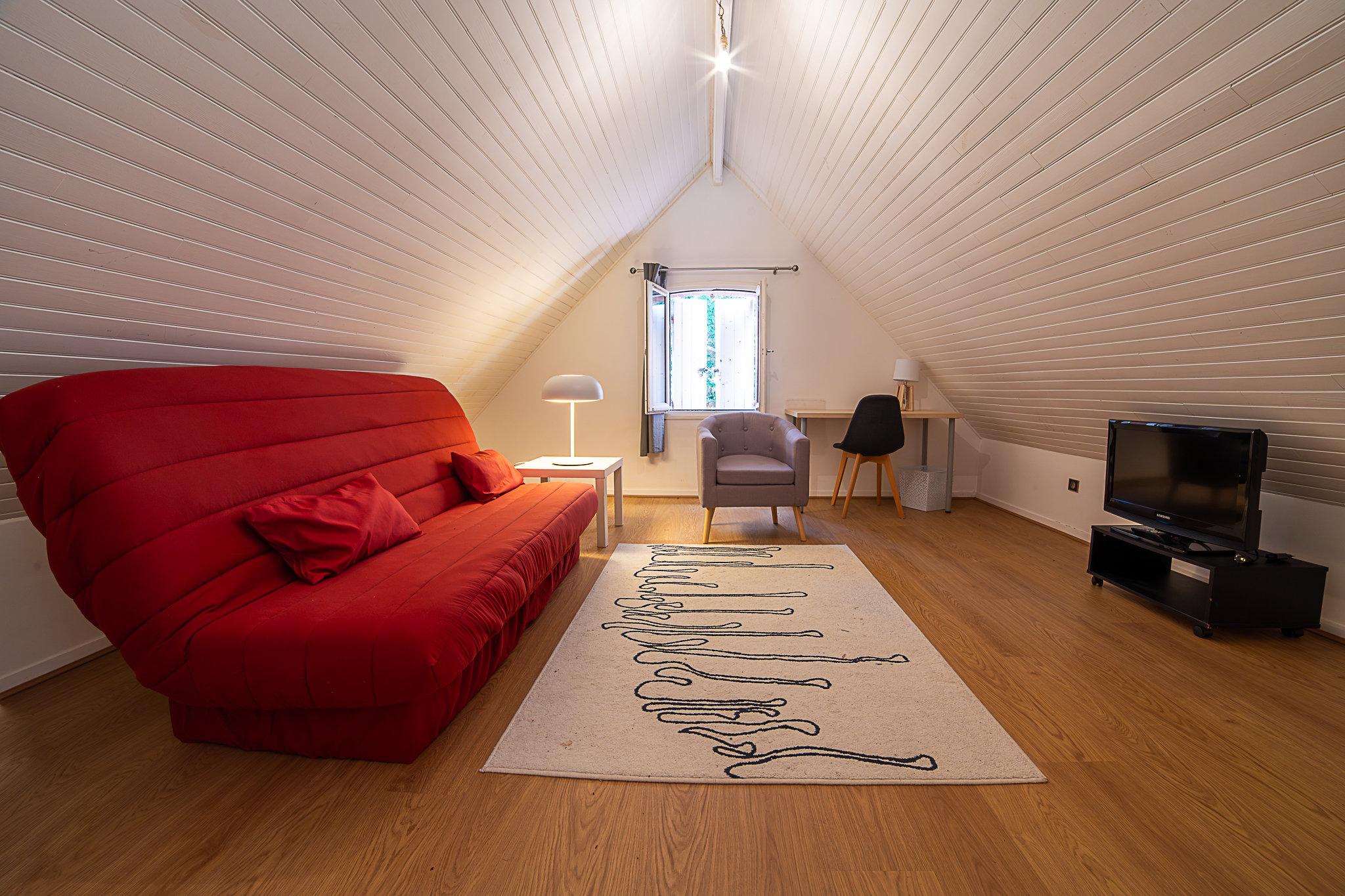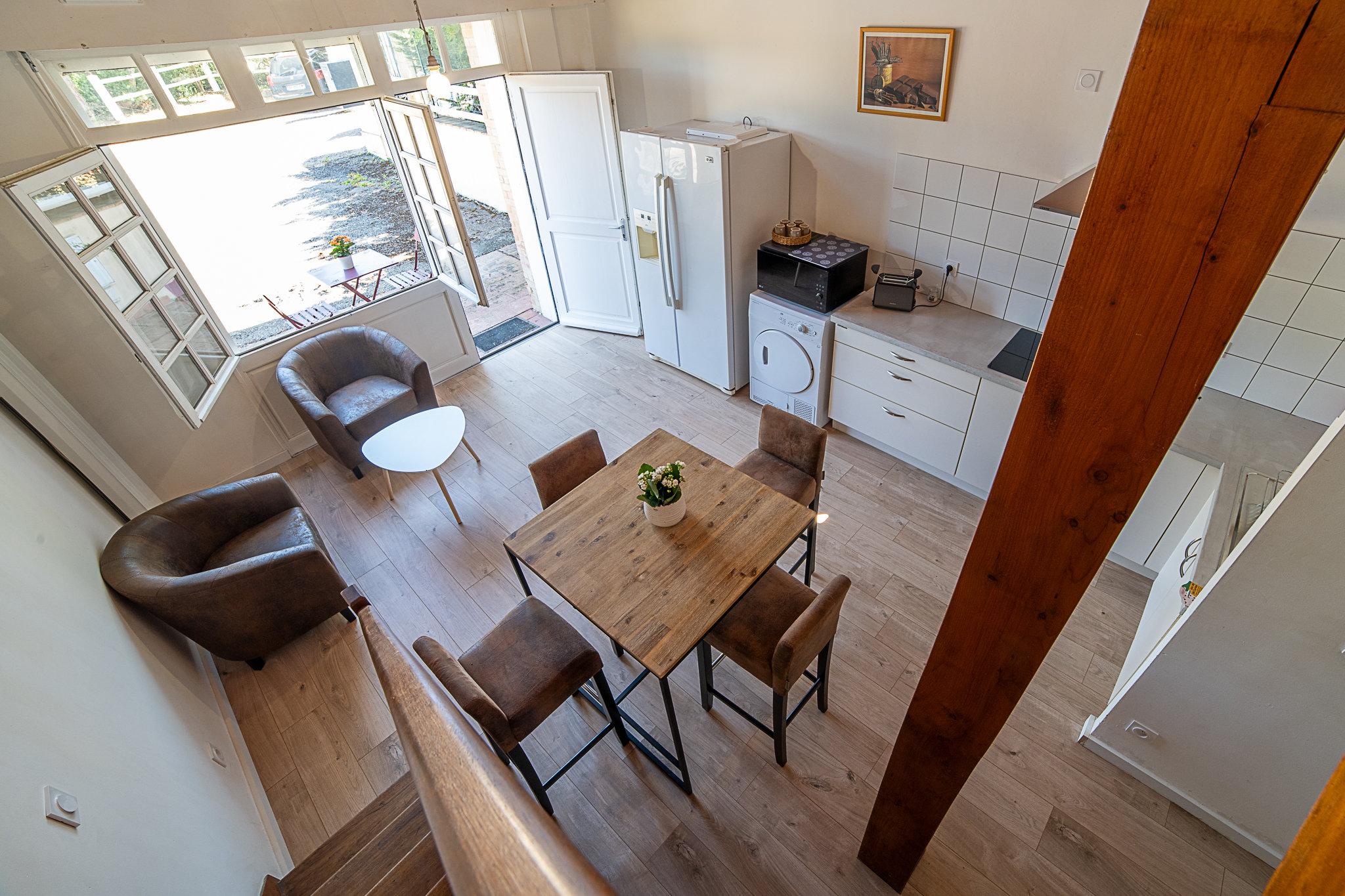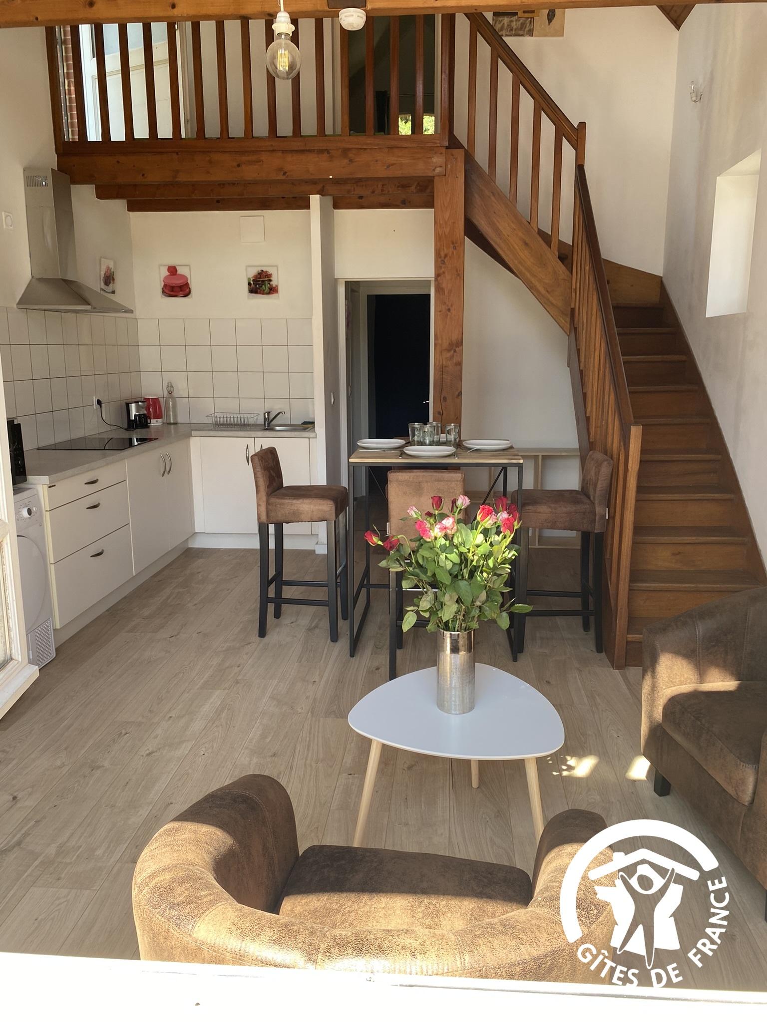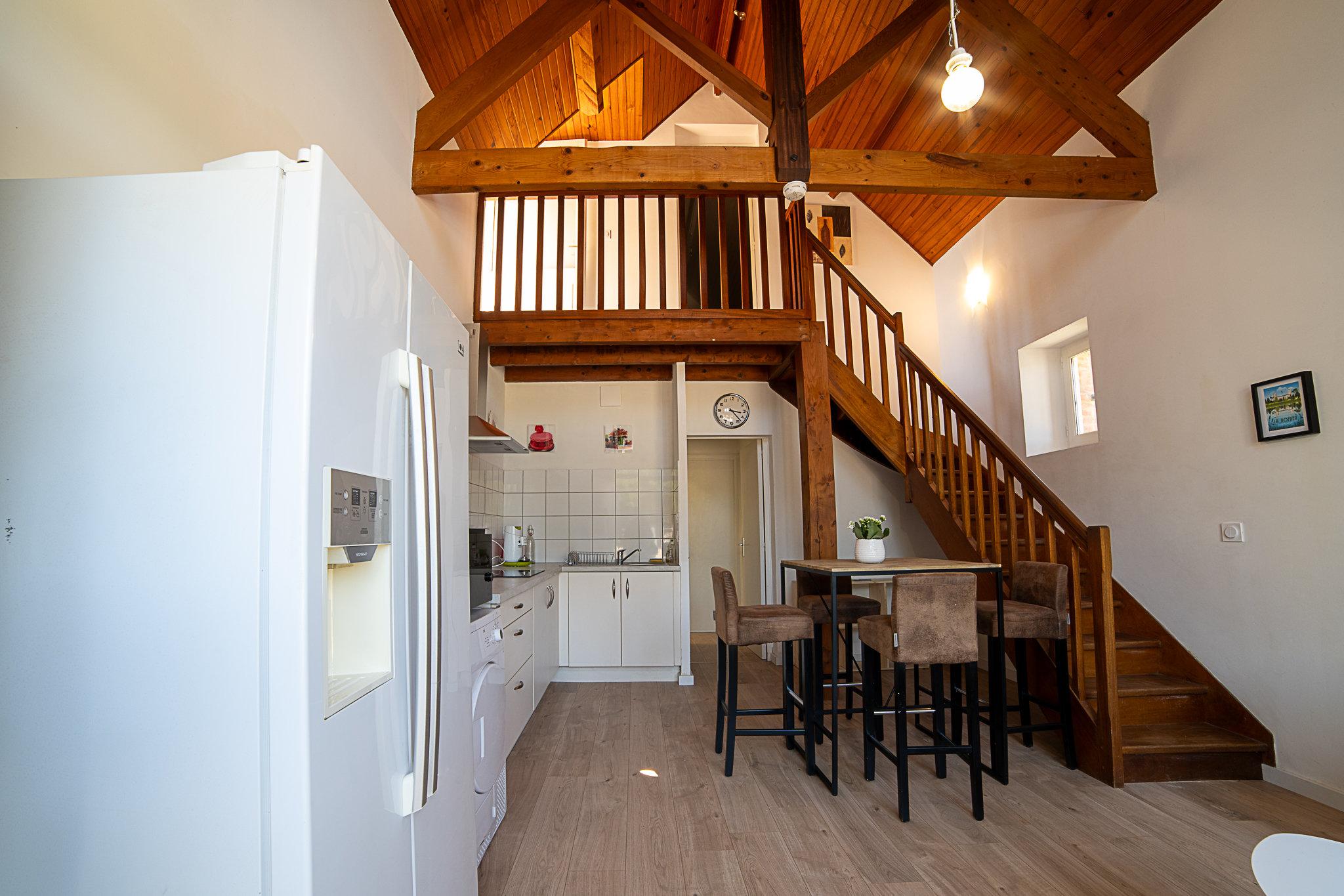 En rez-de-chaussée, séjour/cuisine, petit couloir : salle d’eau, wc indépendant, 1 chambre 1 lit 140. Par un escalier, à l’étage, accès au salon: télévision, canapé convertible.