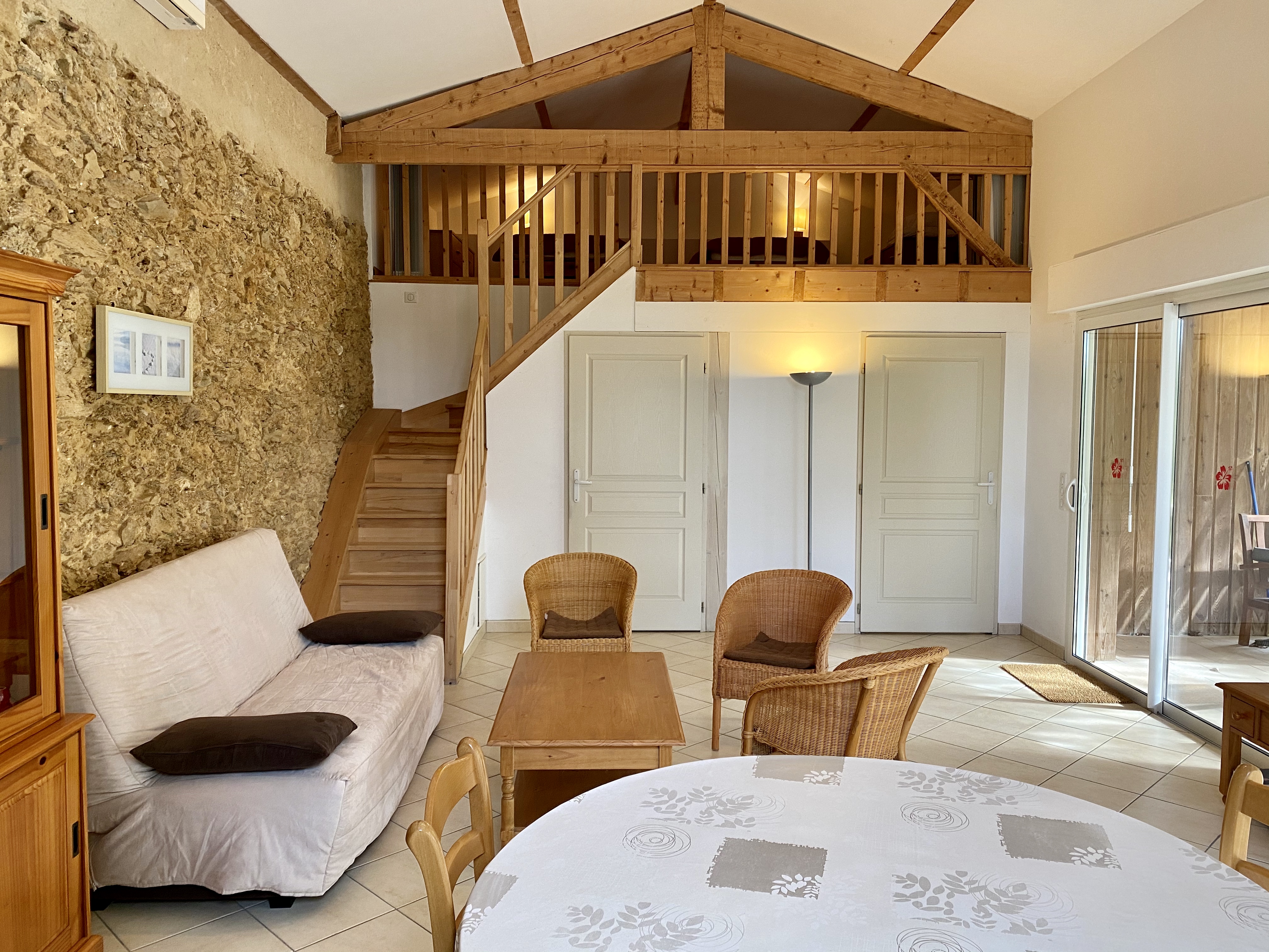 Belle pièce à vivre équipée d’un coin-cuisine, une chambre en rdc et une salle d’eau/wc. A l’étage une chambre en mezzanine. Ce gîte est accessible aux personnes à mobilité réduite. Situé au coeur d’une exploitation productrice d’Armagnac et Floc de Gascogne (visite de chai, dégustation).