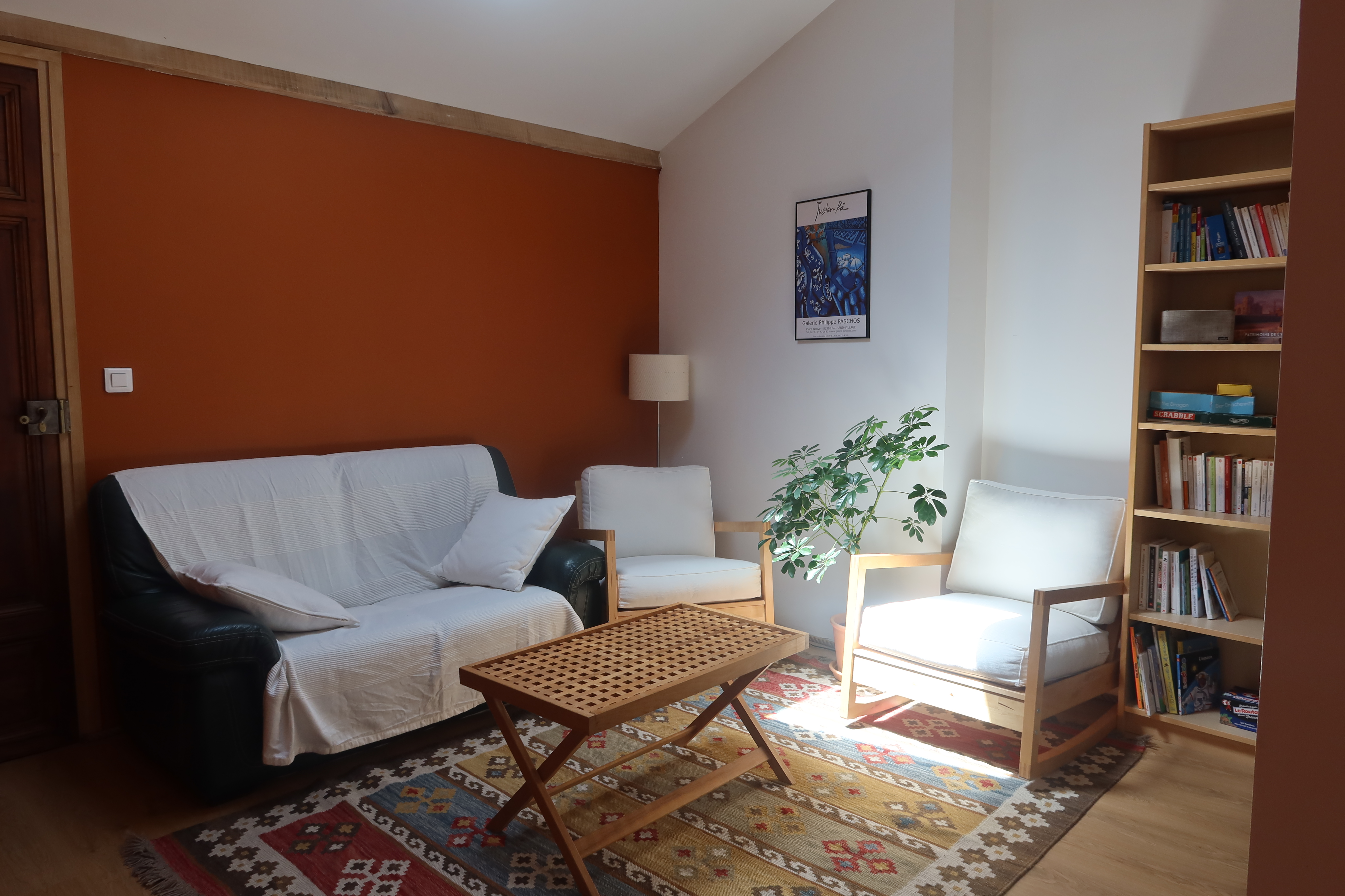 – d’une pièce de vie avec cuisine aménagée, d’un coin salon/bibliothèque