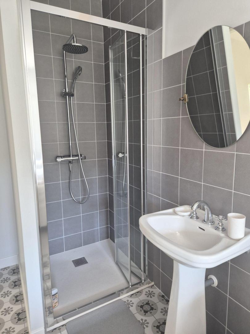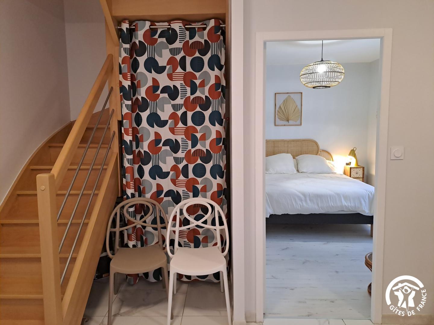 – Depuis la cuisine, un escalier dessert une chambre mansardée avec un lit 140×190 et son coin salle d’eau.