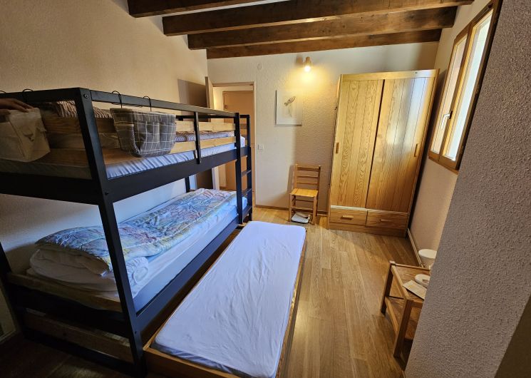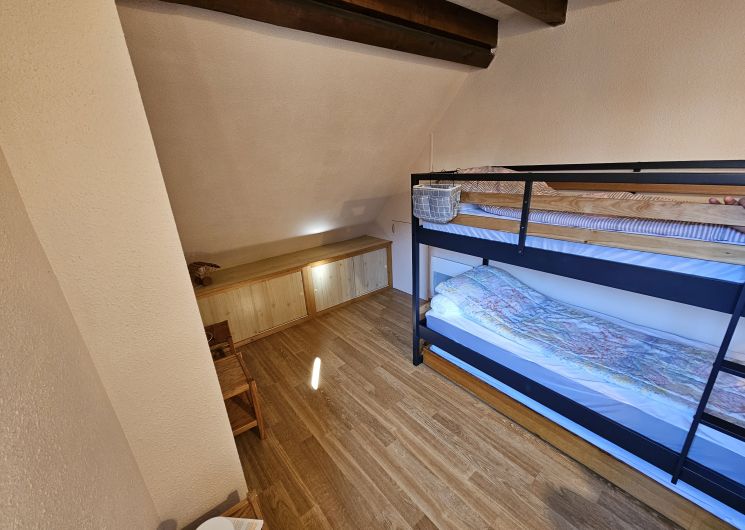 Maison mitoyenne ( n°11) d’une superficie de 46m², sur 2 niveaux. au rez-de-chaussée : – Séjour – coin cuisine – un jardinet – un WC à l’étage : – une chambre avec 1 lit en 1.40 – une chambre avec 3 lits en 0.90 dont 2 superposés – une salle de bains .
