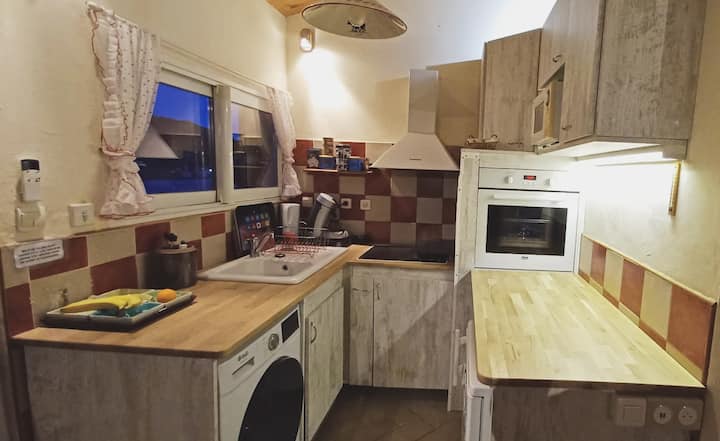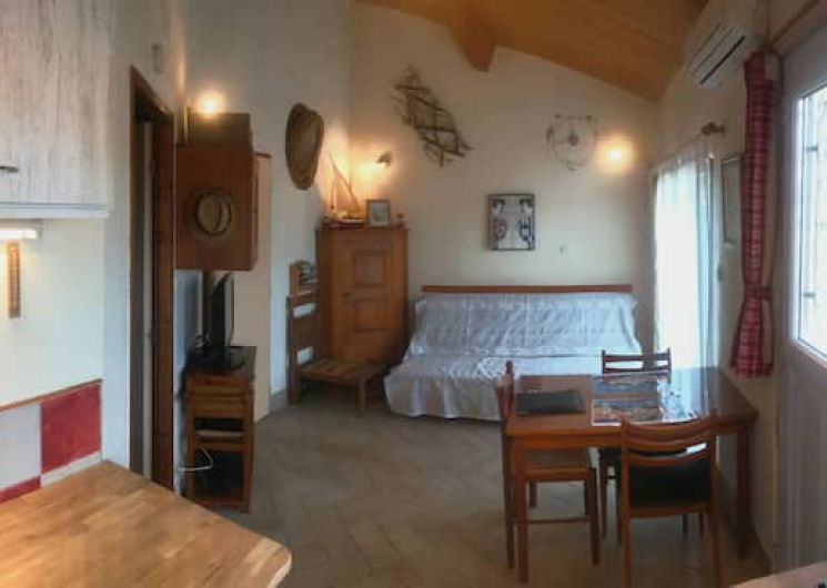 Logement indépendant exposé Sud Est avec terrasse/ store électrique et parterre (60 m2 au total). La maisonnette est un deux pièces climatisées situé dans un quartier calme à 5 min à pied du port de plaisance et des commerces. Elle se compose de : d’ un espace salon /salle à manger (canapé convertible, meuble de rangement et télévision, table à manger et 4 chaises , une desserte ) et un coin cuisine équipé (sauf lave vaisselle), frigo, table de cuisson, hotte aspirante, four électrique et four micro-ondes, plancha, grille pain, cafetière, et tout le matériel de cuisine ainsi que assiettes, verres, couverts, plats… ) D’ une chambre indépendante avec lit 140×190, matelas maintien de forme, 2 chevets avec lampe, 1 lit parapluie pour bébé, une penderie/étagères de rangement. D’ une salle d’eau avec lavabo, douche à l’ italienne, WC. Accessible en voiture (parking gratuit à côté de la maison) ou par train (5 min à pied).