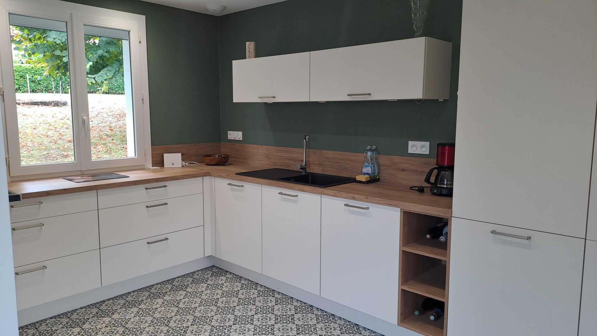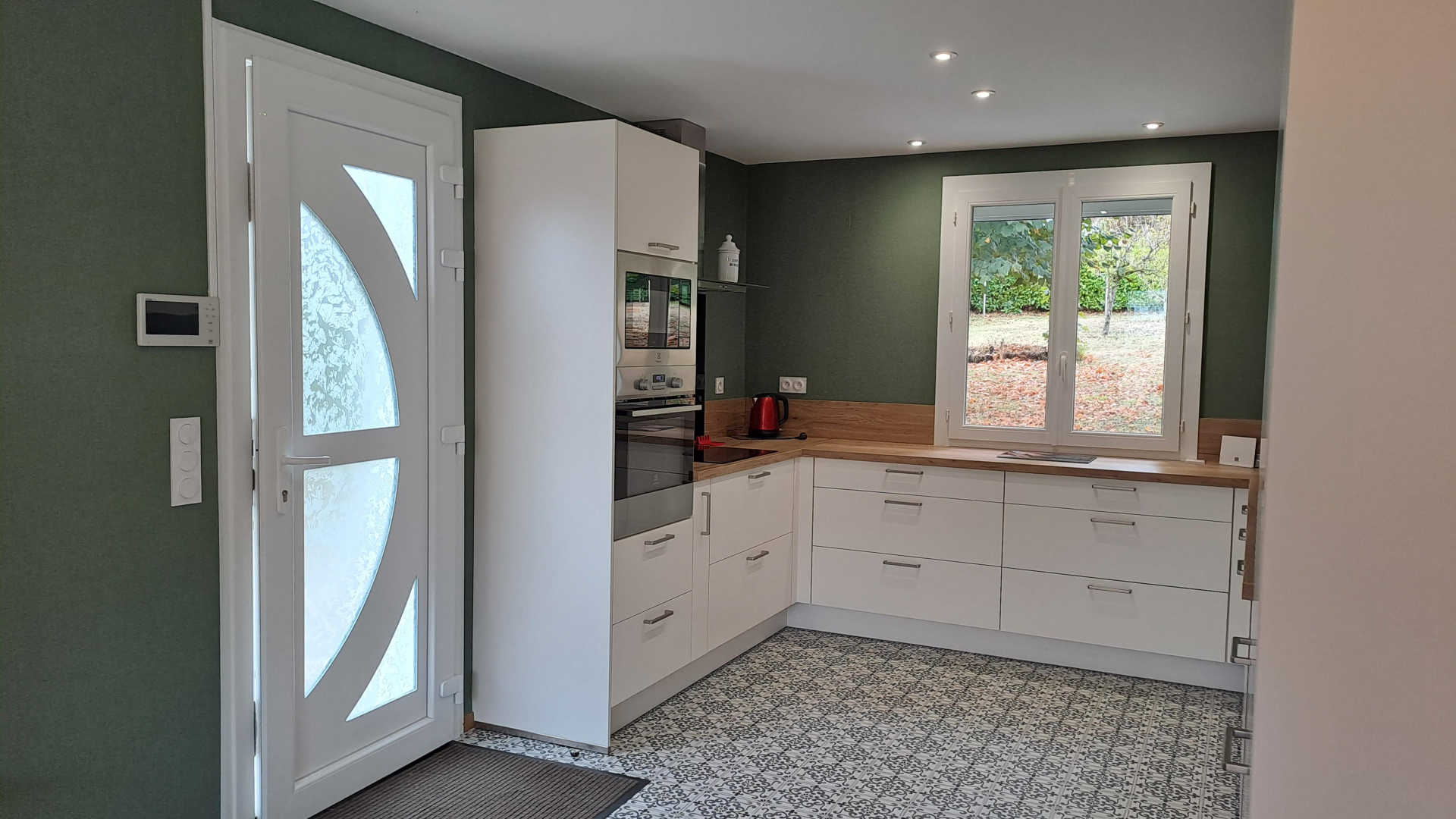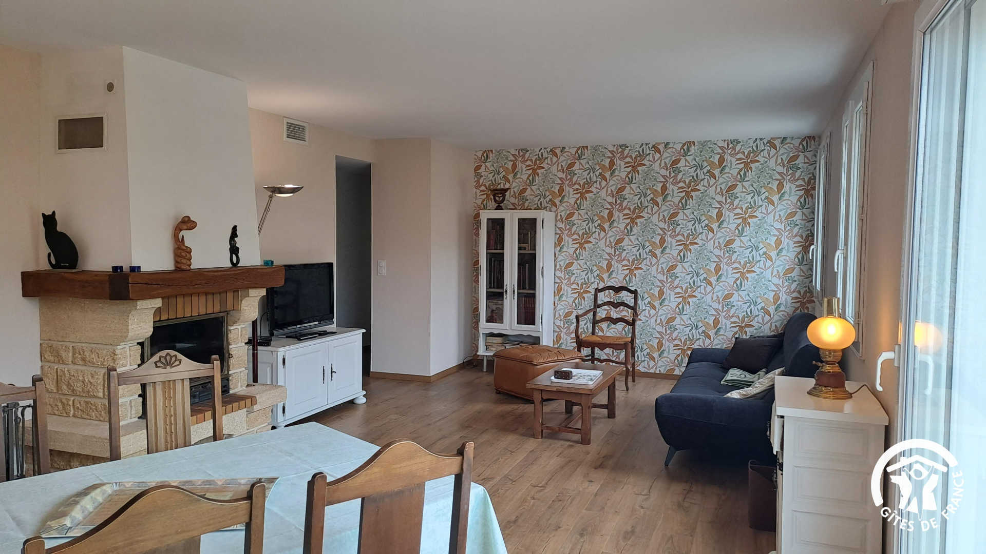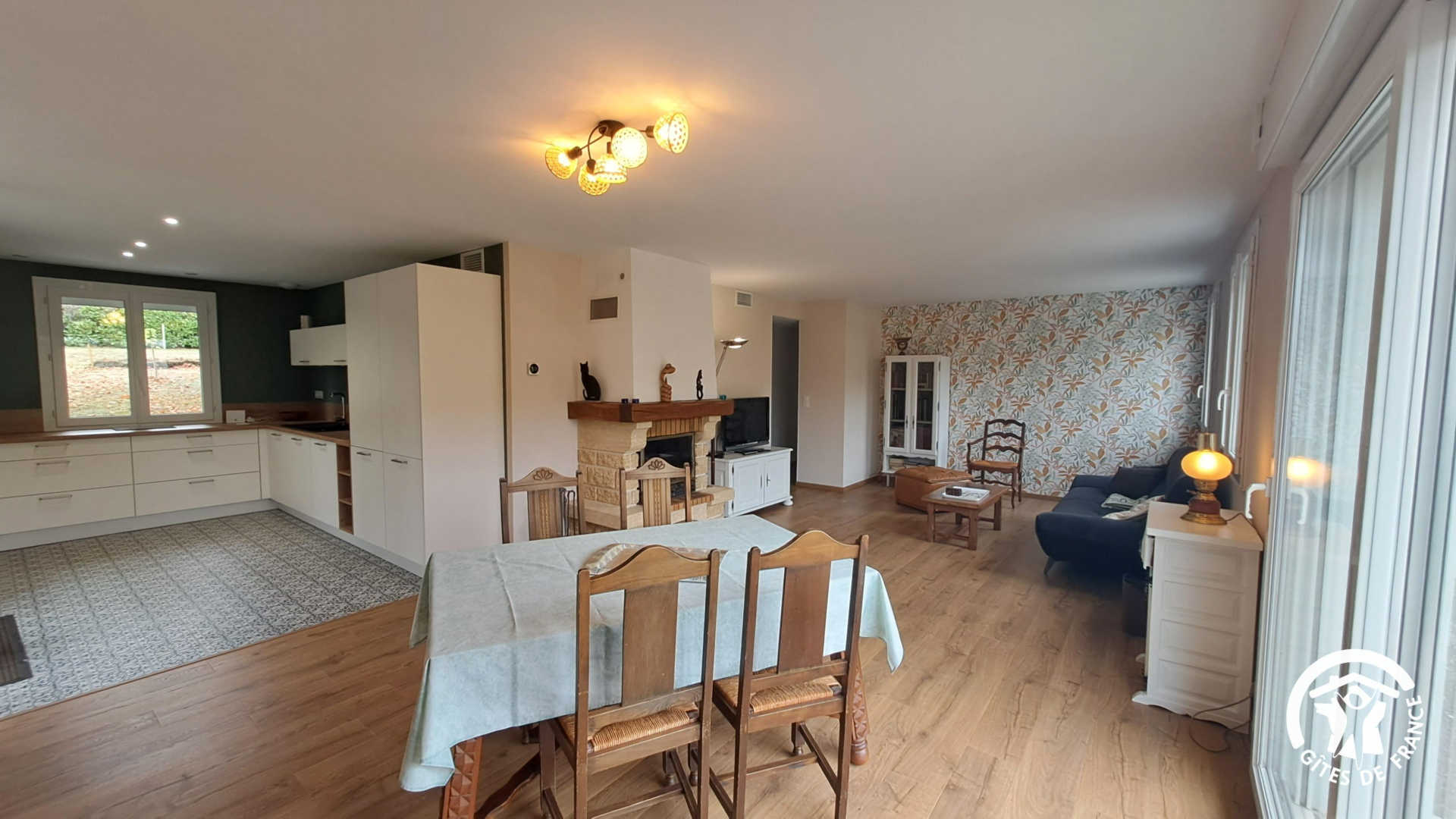 Espace de Vie : le salon – salle à manger avec cheminée insert, donne sur une cuisine très bien équipée : plaque induction, four, micro-ondes, Cookeo, réfrigérateur avec compartiment congélateur, bouilloire, grille-pain, cafetière, lave-vaisselle.