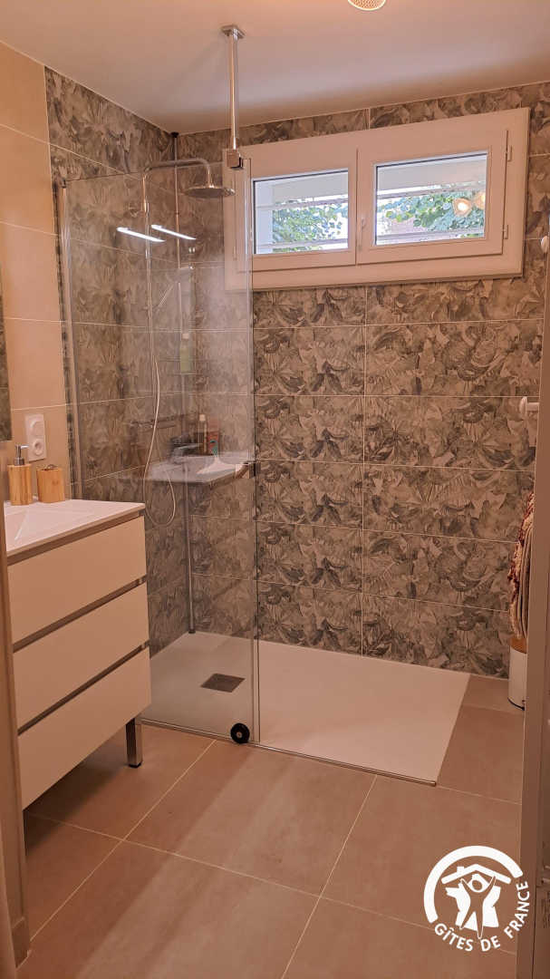 Salle d’eau avec douche à l’italienne, vasque et sèche serviette.