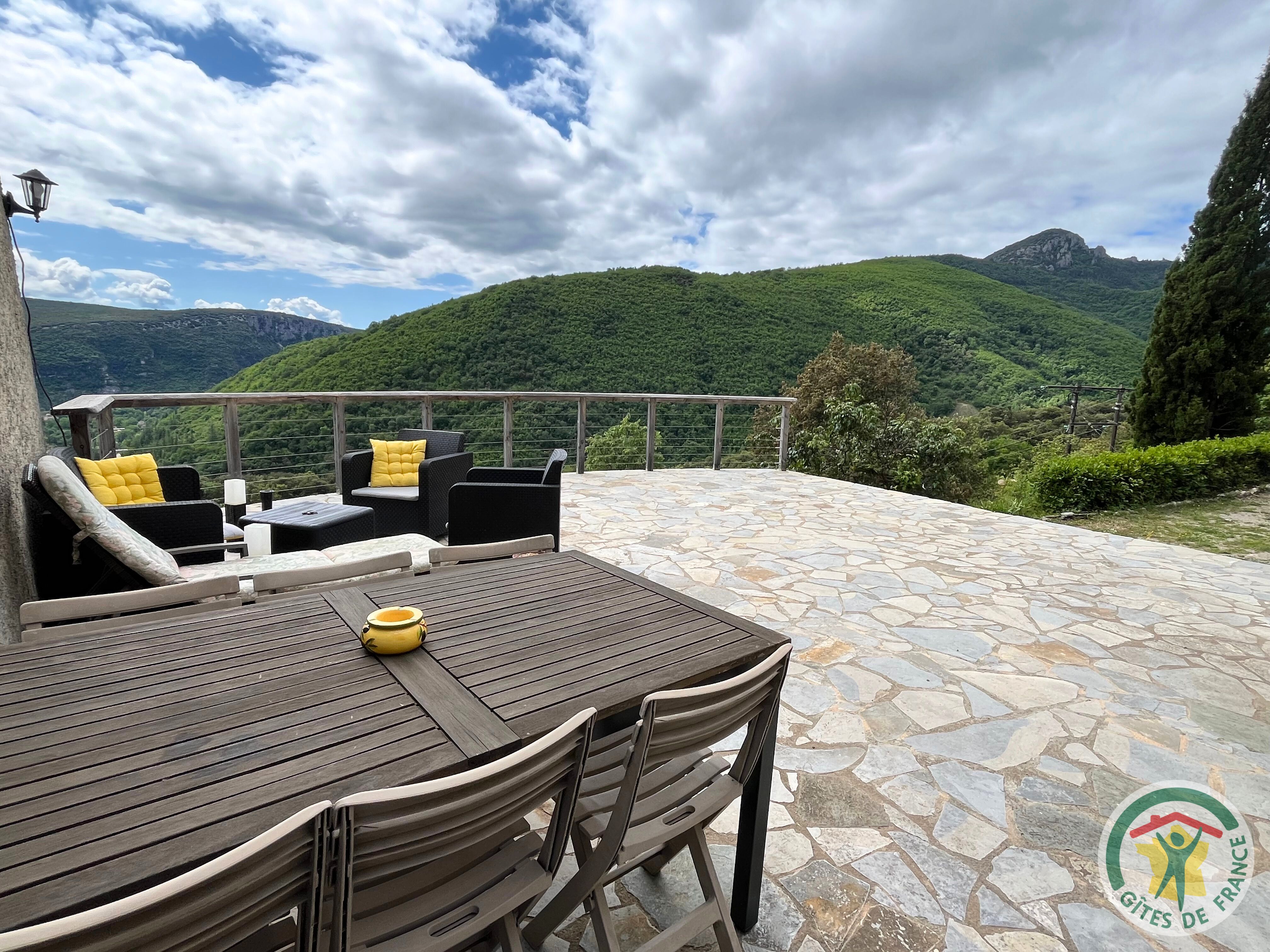 Gîte mitoyen dans ensemble bâti, avec parking aménagé en bord de route et accès au gîte tout proche à pied. A l’entrée, vous disposez d’une cuisine toute équipée qui donne accès à une grande terrasse panoramique commune, puis une première chambre (lit 140×200), le spacieux séjour, cadre exceptionnel avec remarquable plafond en bois et poutres en forme d’étoile. Une autre chambre (lit 140×200) avec un petit escalier donnant accès à une mezzanine avec deux lits (90×200). Petite terrasse privative à l’entrée du gîte- Barbecue – chauffage avec bois de cheminée (25€/jour).