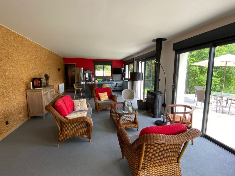 Le logement comprend une pièce à vivre avec salon (poêle à bois, 1 canapé, 2 fauteuils, table basse, bureau), une cuisine intégrée (lave-vaisselle, four, réfrigérateur, congélateur).