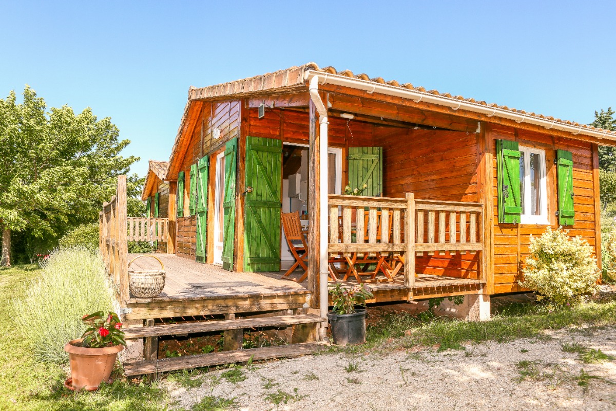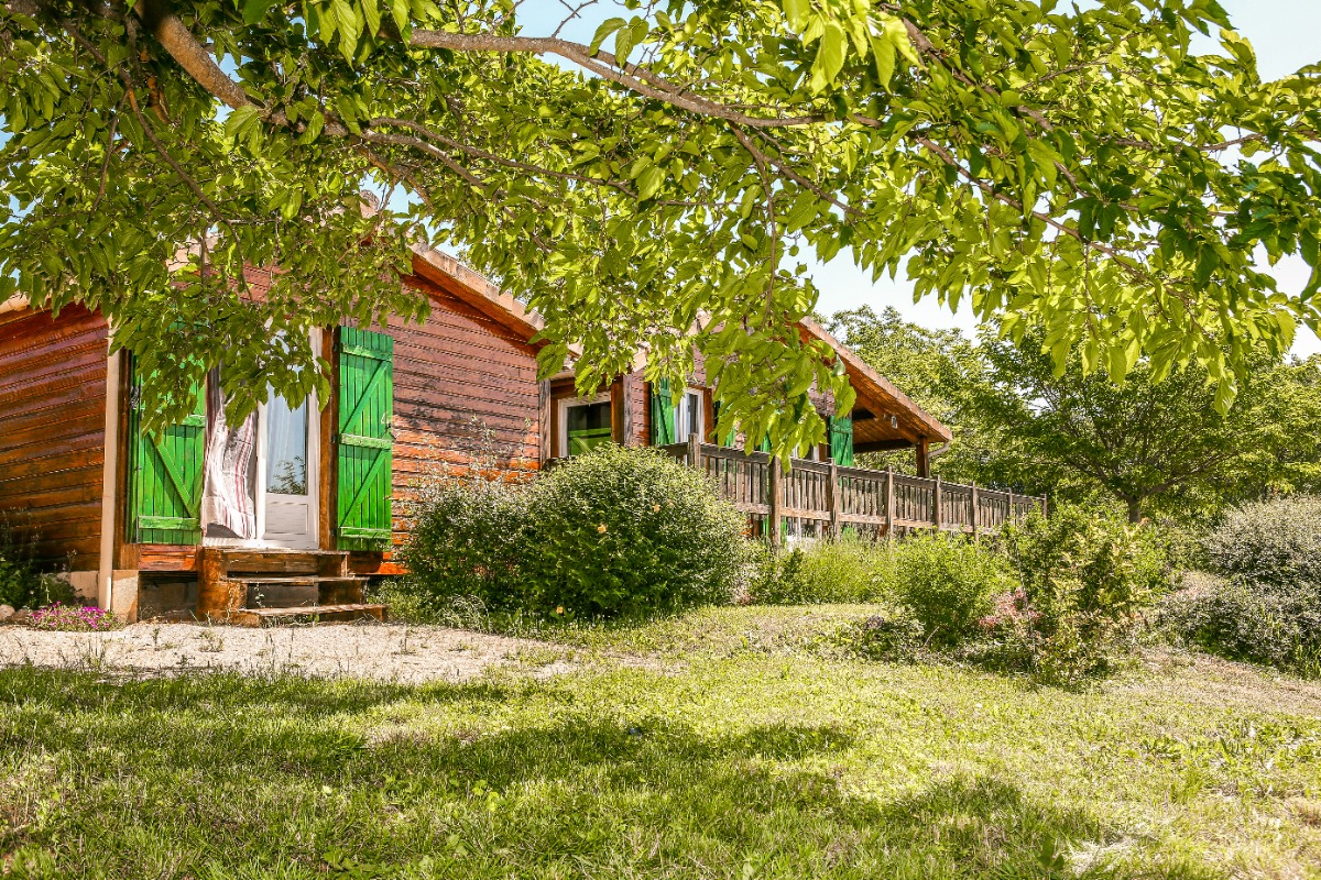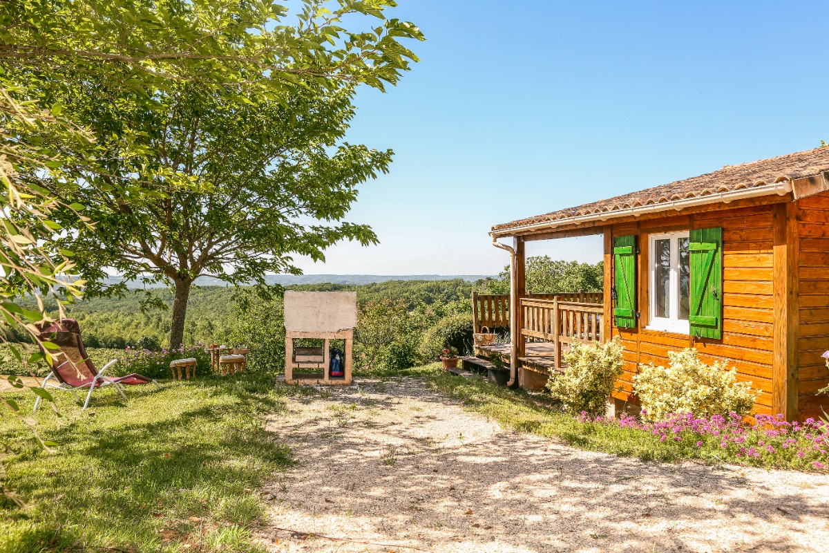 Chalet d’environ 45 m2 situé à flanc de colline, orienté au sud, en lisière de la forêt, à 3 km de la Base de Loisirs de Vère Grésigne.