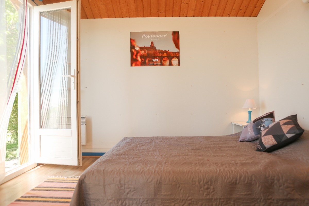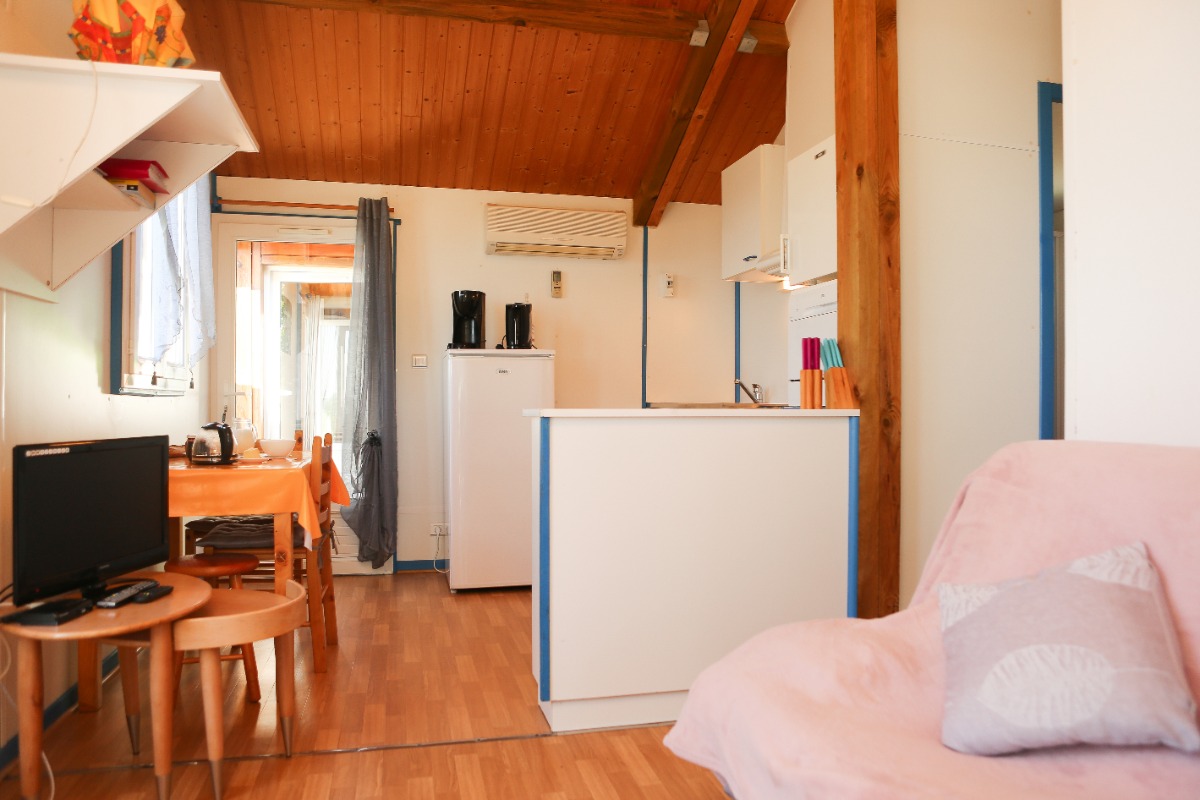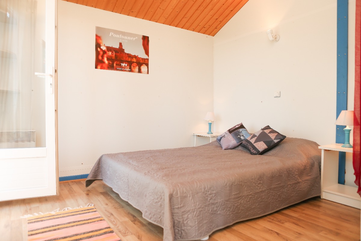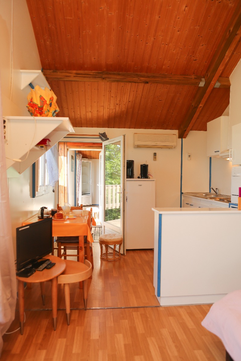 Le chalet est aménagé de plain pied légèrement surélevé (accès par 3-4 marches). Les parents du propriétaire habite sur place mais sa maison d’habitation tourne le dos à la location. Séjour + coin salon et coin cuisine (11 m2) avec bar de séparation (micro-ondes, lave vaisselle, lave linge, canapé convertible, TV couleur). 1 chambre (10 m2) avec 1 lit en 140. Salle d’eau. WC.Cette partie du chalet est équipée de climatisation.
