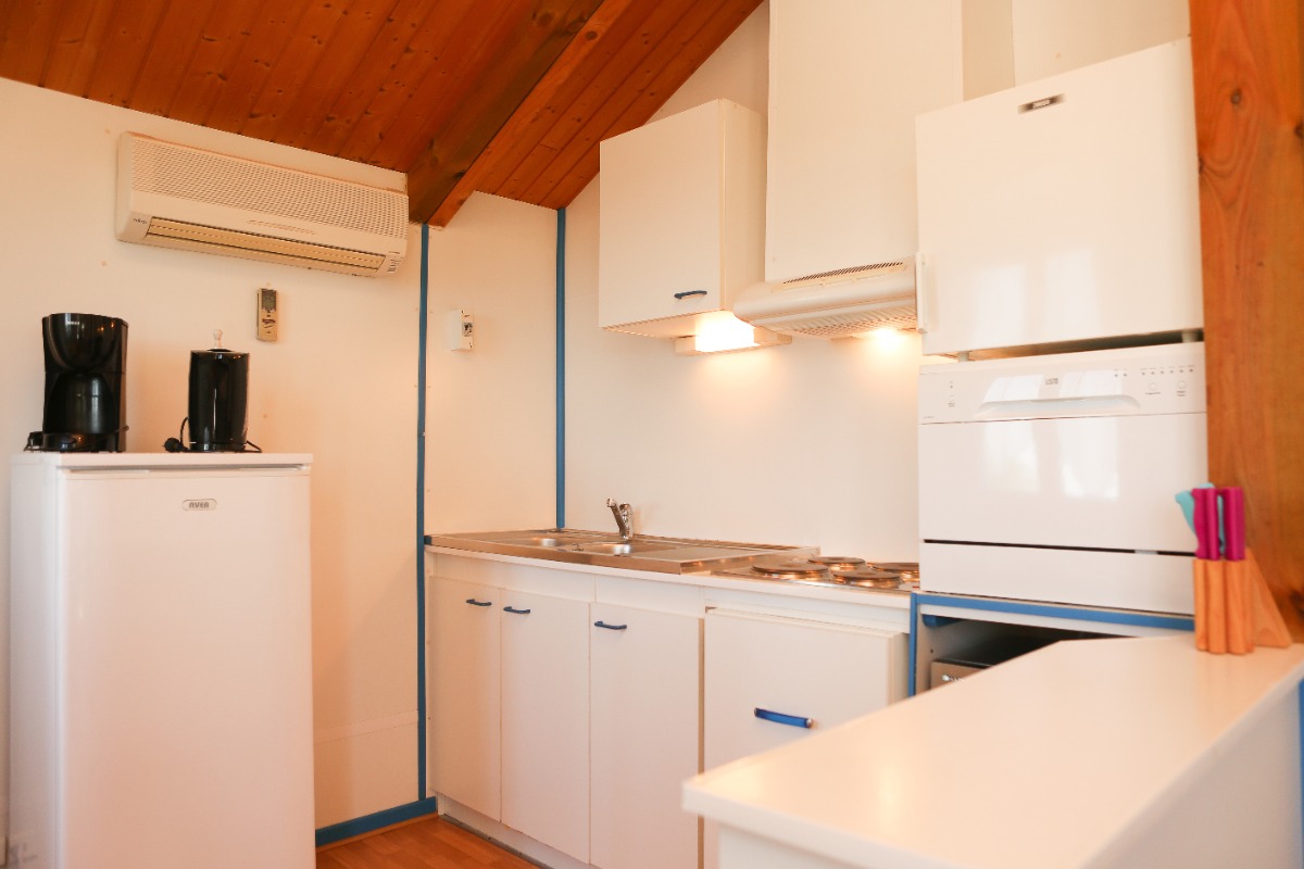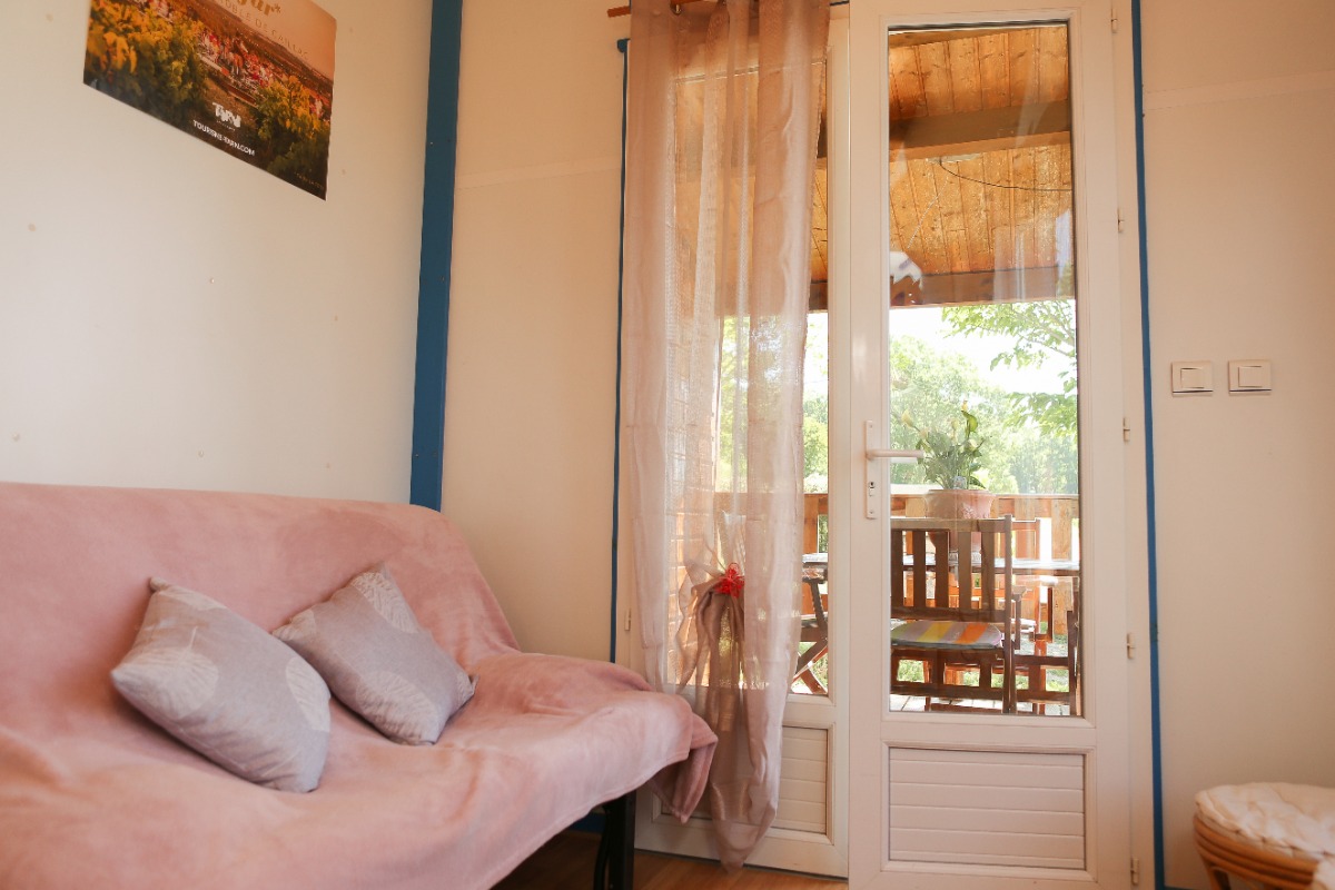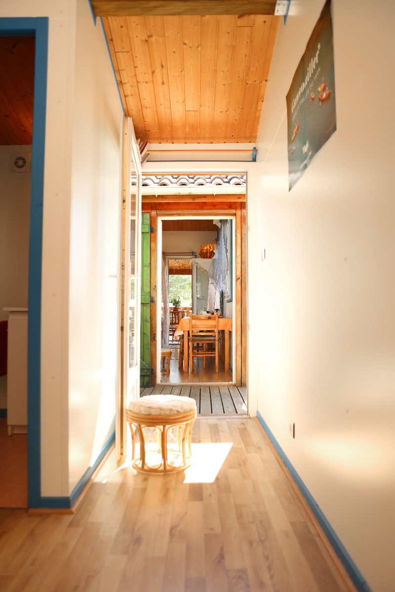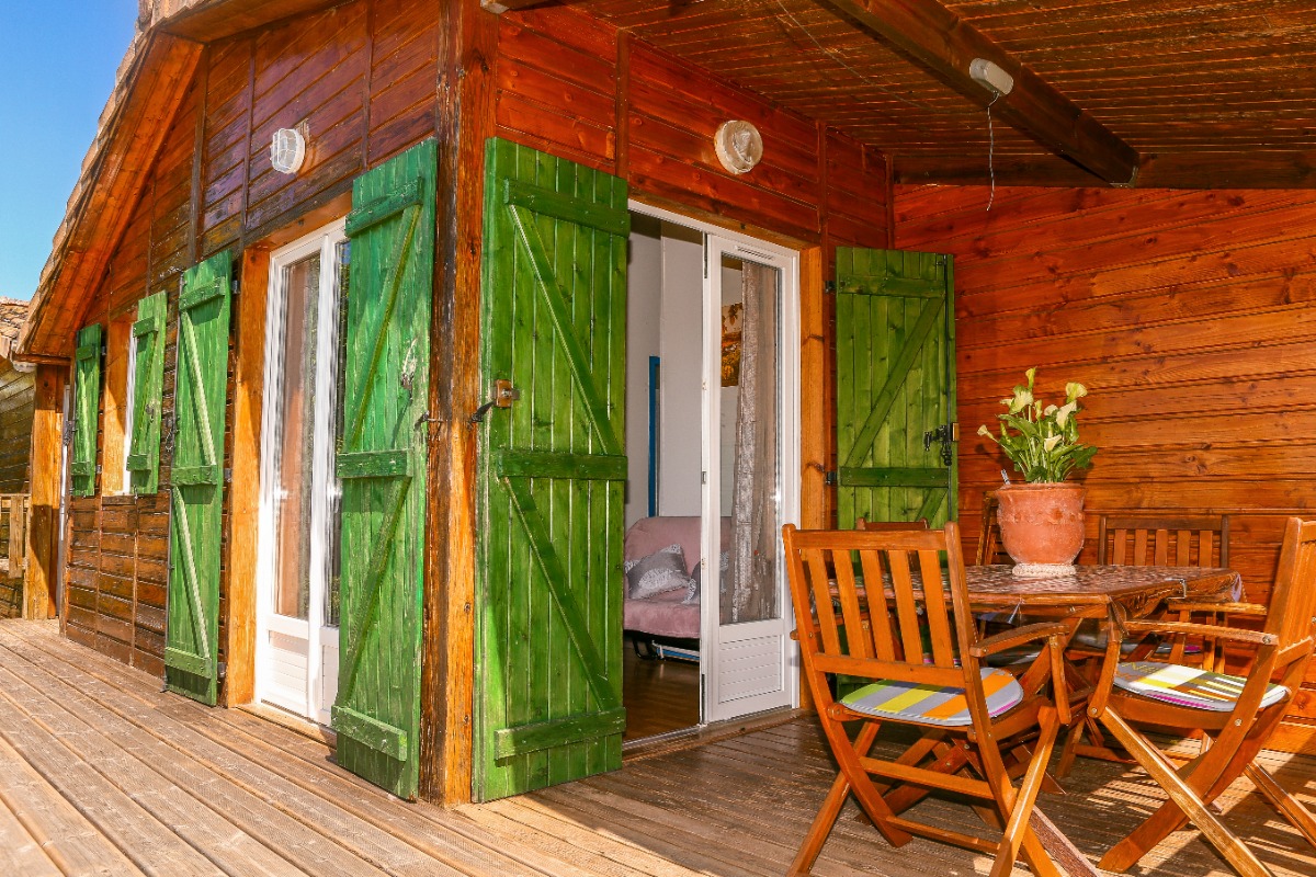 Le chalet est aménagé de plain pied légèrement surélevé (accès par 3-4 marches). Les parents du propriétaire habite sur place mais sa maison d’habitation tourne le dos à la location. Séjour + coin salon et coin cuisine (11 m2) avec bar de séparation (micro-ondes, lave vaisselle, lave linge, canapé convertible, TV couleur). 1 chambre (10 m2) avec 1 lit en 140. Salle d’eau. WC.Cette partie du chalet est équipée de climatisation.