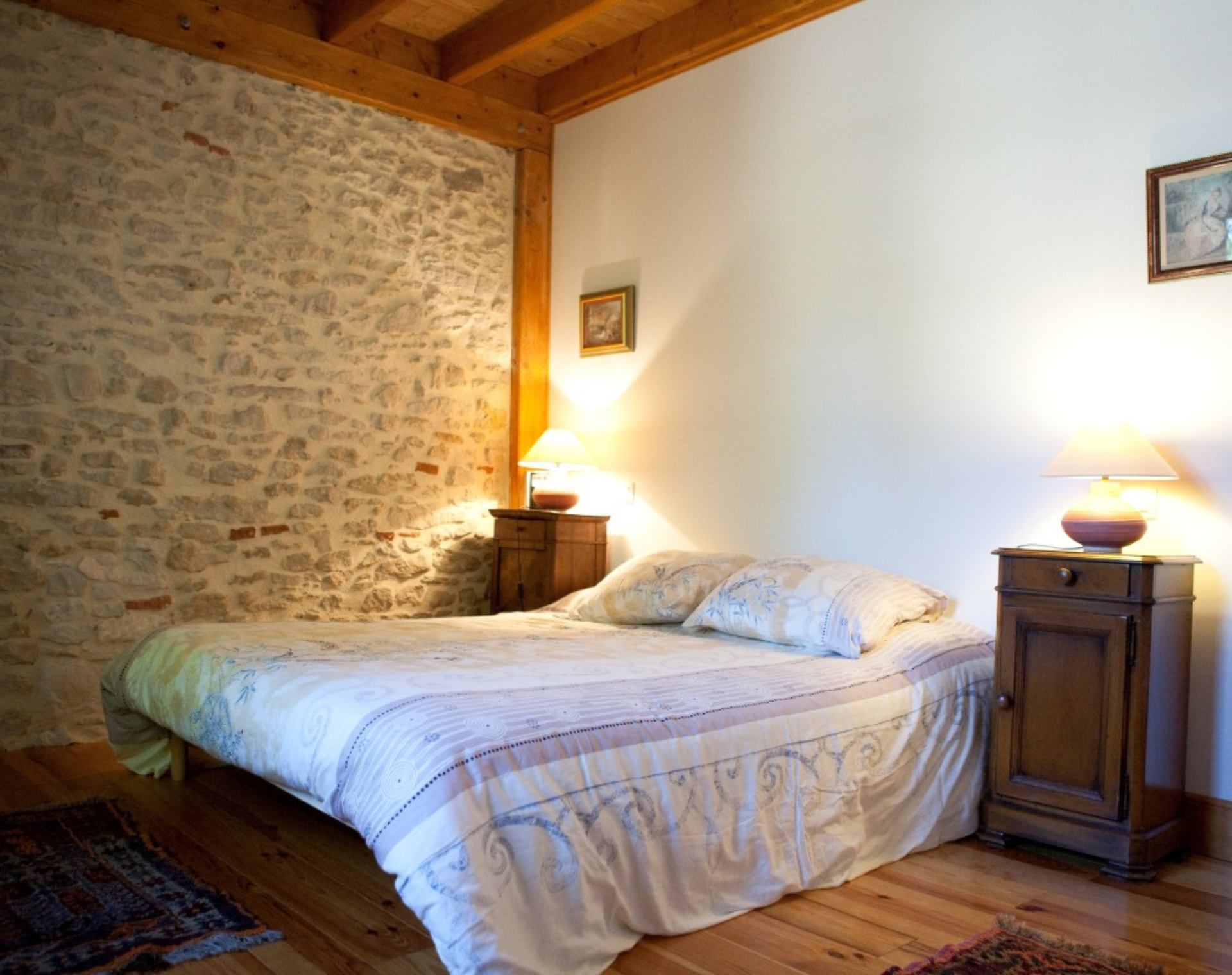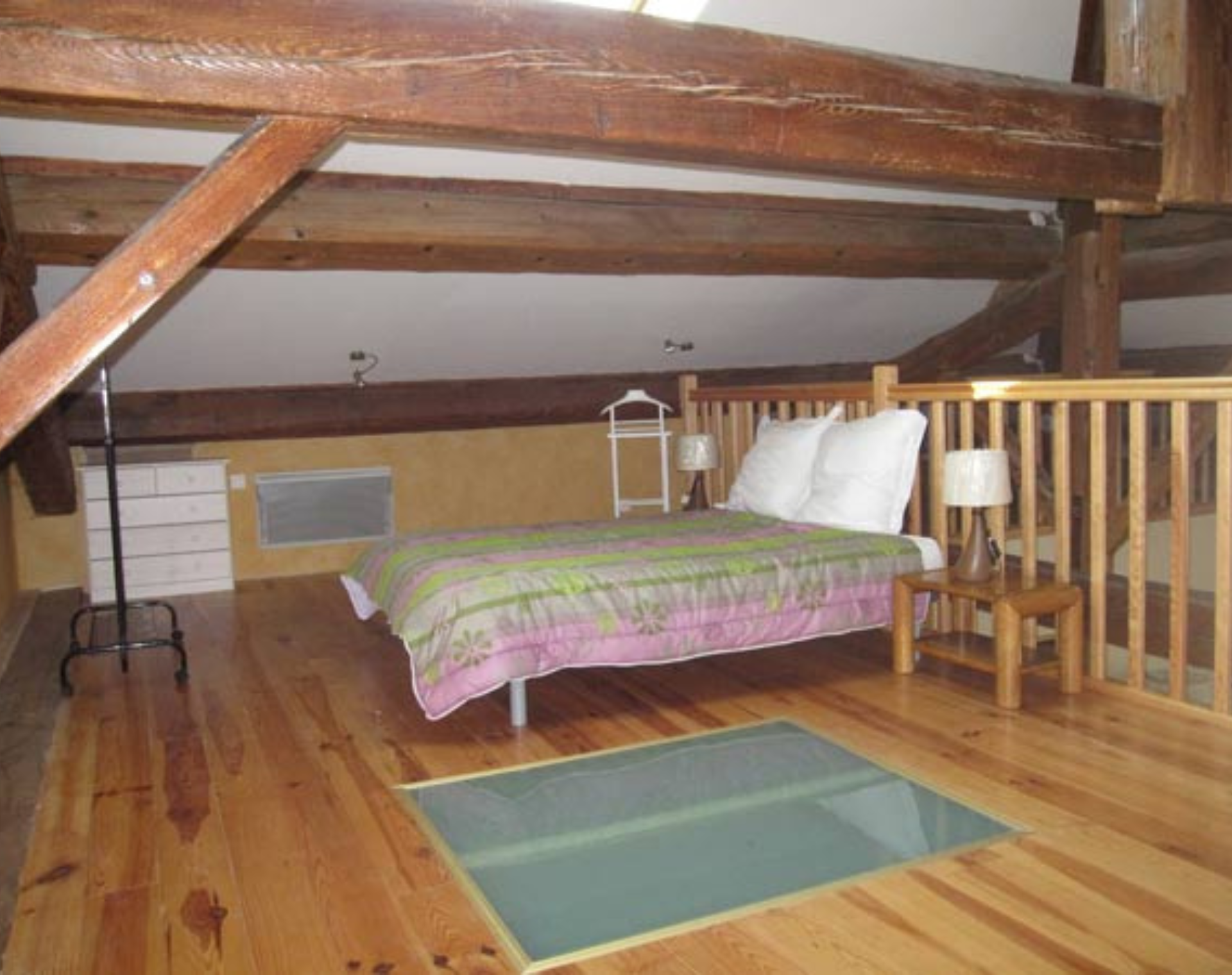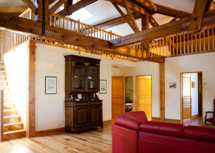 A l’étage : pièce de vie 65 m2 comprenant salon (grand canapé d’angle, TV + lecteur DVD) séjour et cuisine intégrée (plaque à induction, micro-ondes, congélateur, lave-vaisselle). 1 chambre 14 m2 (1 lit en 160), 1 chambre 12 m2 (1 lit en 140), 1 chambre sans ouverture sur l’extérieur 11 m2 (2 lits en 90), mezzanine 9 m2 (1 lit en 140). 2 salles d’eau de 9 et 4 m2 (douche, WC, radiateurs sèche-serviettes). Lit et chaise bébé, climatisation réversible dans la pièce de vie, chauffage, WI-FI. Draps, linge de maison et de toilette fournis.