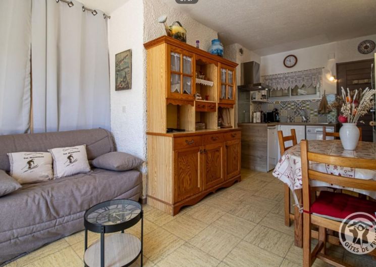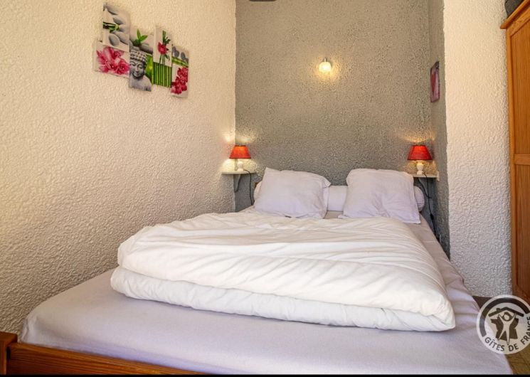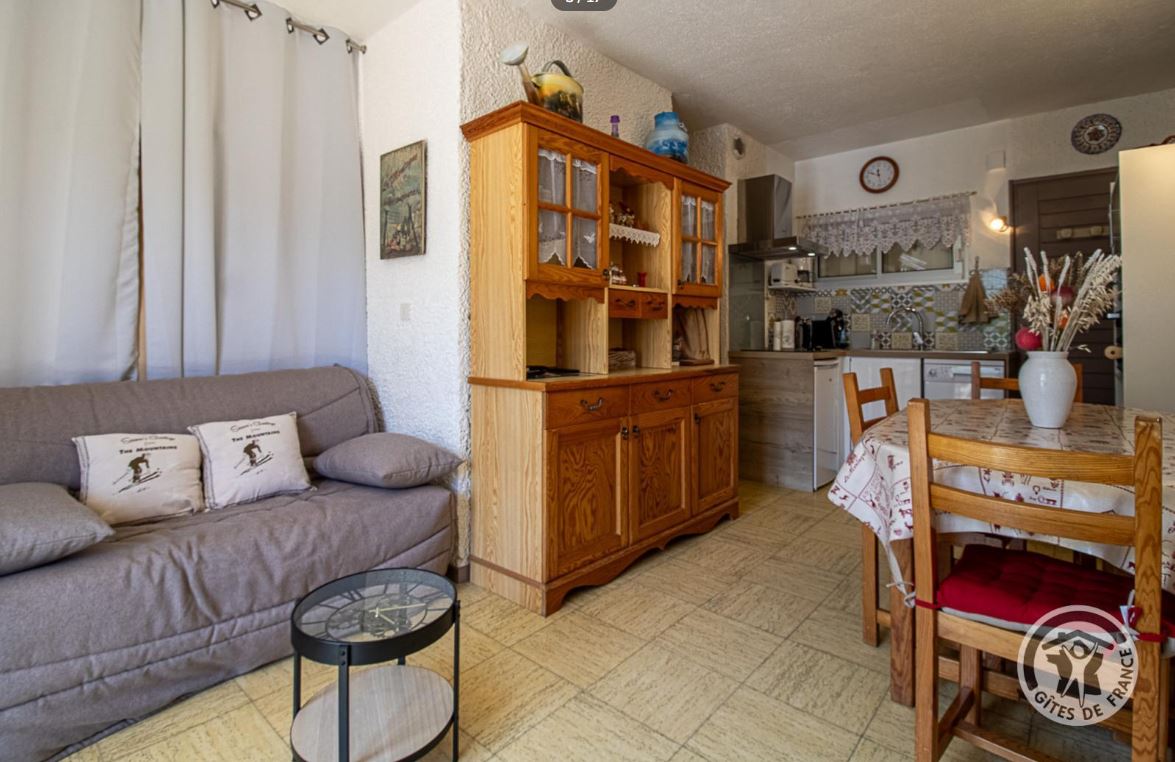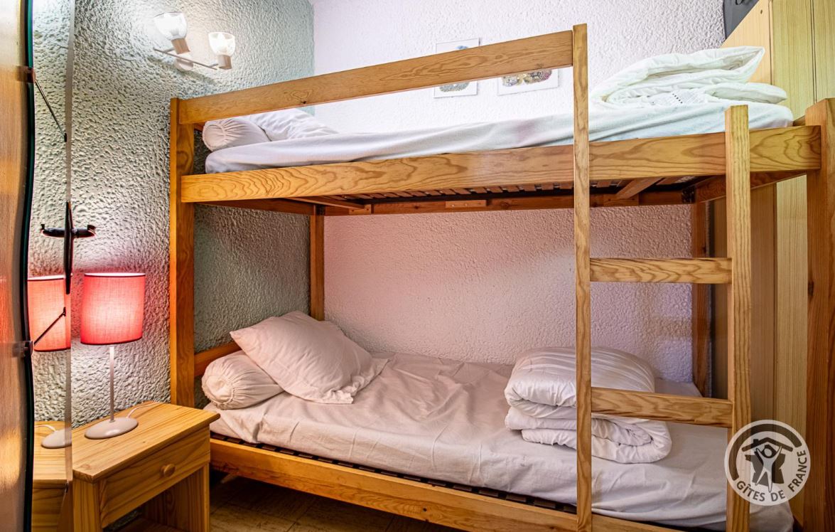 Accès par une trentaine de marches par l’extérieur, appartement de plain pied avec une chambre 1 lit 2 pers 140×190 ouverte sur séjour, séparée d’un rideau, pièce de vie, canapé, télévision, salle à manger, coin cuisine équipée, une salle d’eau avec vasque et sèche serviettes, wc indépendant, chambre petite superficie avec 1 lit superposé 90×190. Pas de wifi. Draps et linge de toilette à demander à la conciergerie en charge du gîte, qui vous remettra les clefs. Charges comprises. Ménage inclus. Forfait animal 15€/semaine avec caution. 1 place de stationnement privatif. Accès navette vers station de ski à 2 min en contrebas. Terrasse avec vue. .