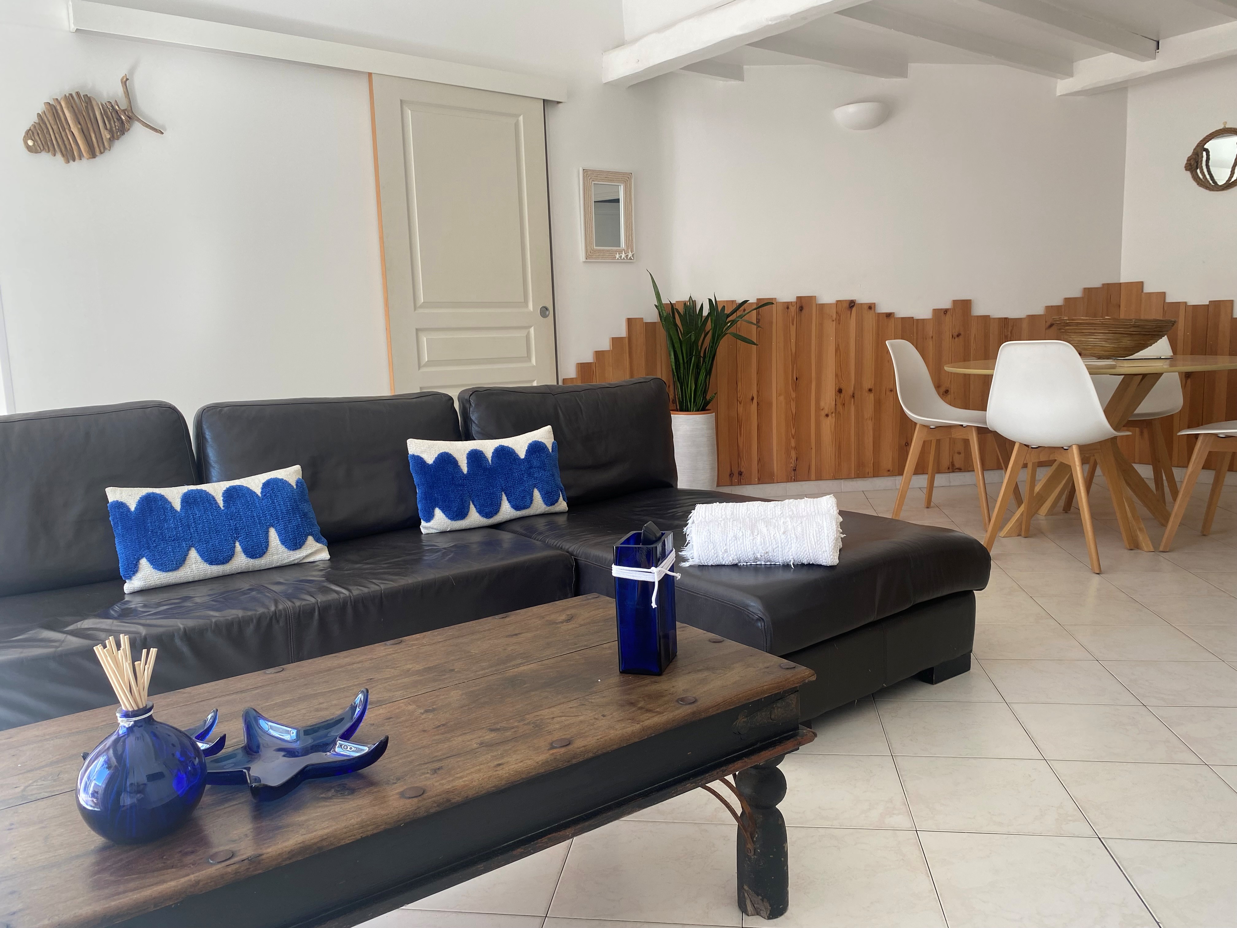 Ce logement est une maison individuelle de 75m² et 35m² de terrasse avec barbecue. Entièrement équipé, peut accueillir 4 personnes. Elle se compose d’une cuisine ouverte sur séjour et jardin, d’une chambre avec sa salle d’eau, d’une cabine avec couchage. La maison est calme et très lumineuse grâce à son exposition plein Sud. La décoration est sur le thème de la mer. Chien admis avec accord du propriétaire.