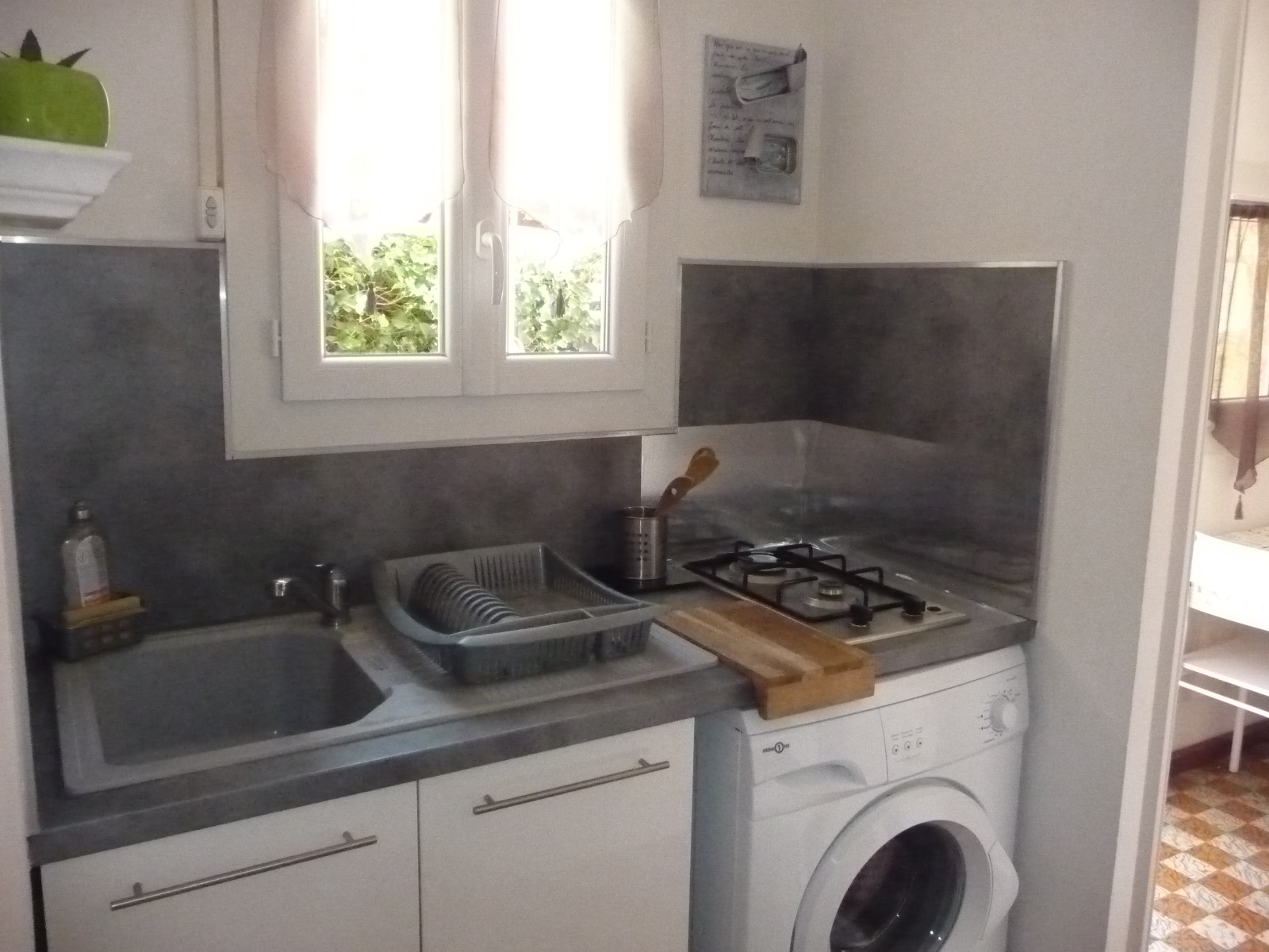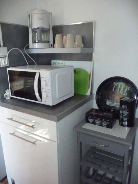 Le coin cuisine est équipé: lave linge, plaque de cuisson, réfrigérateur congélateur, micro ondes grill, aspirateur sans fil, fer et table à repasser