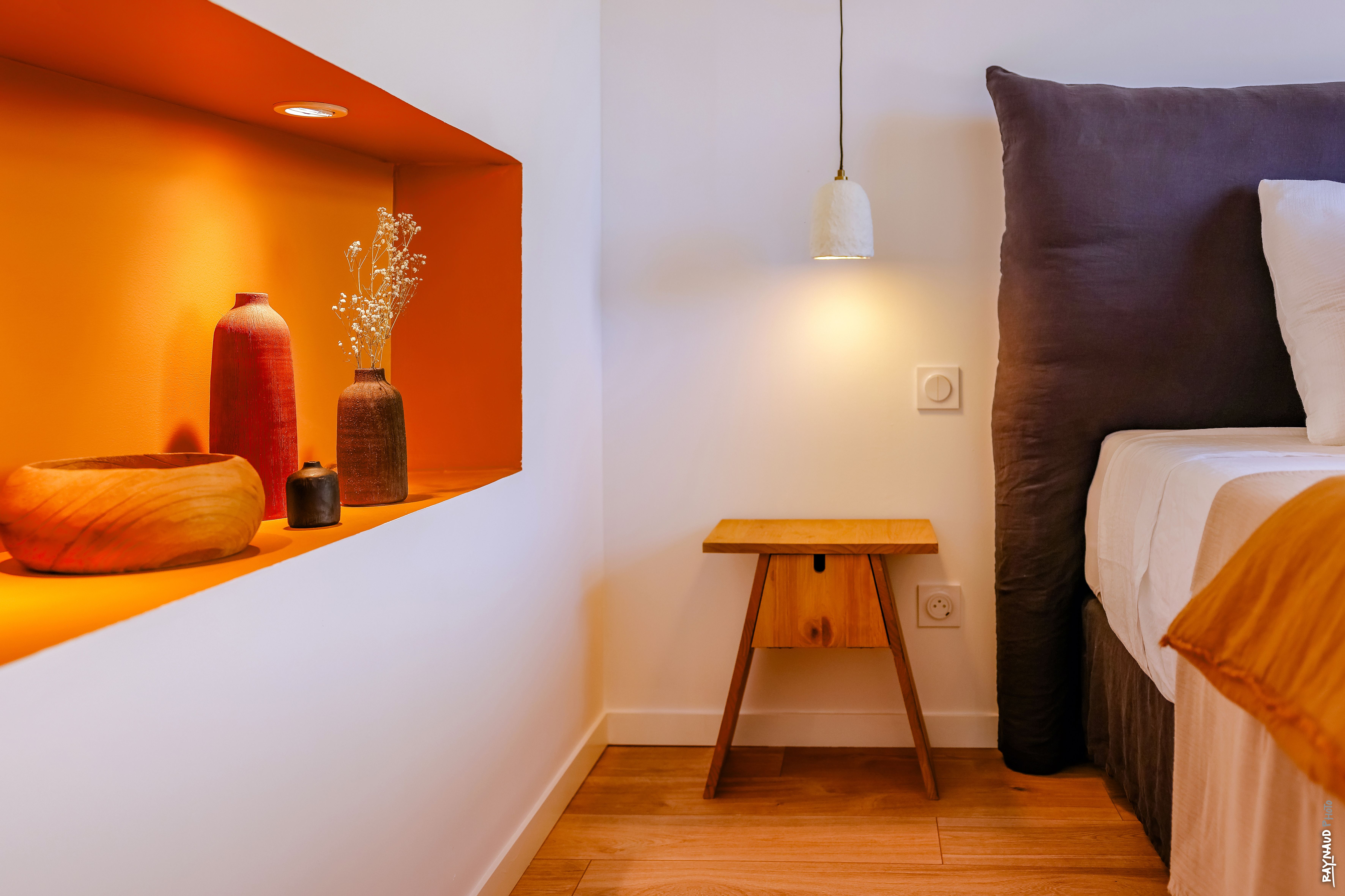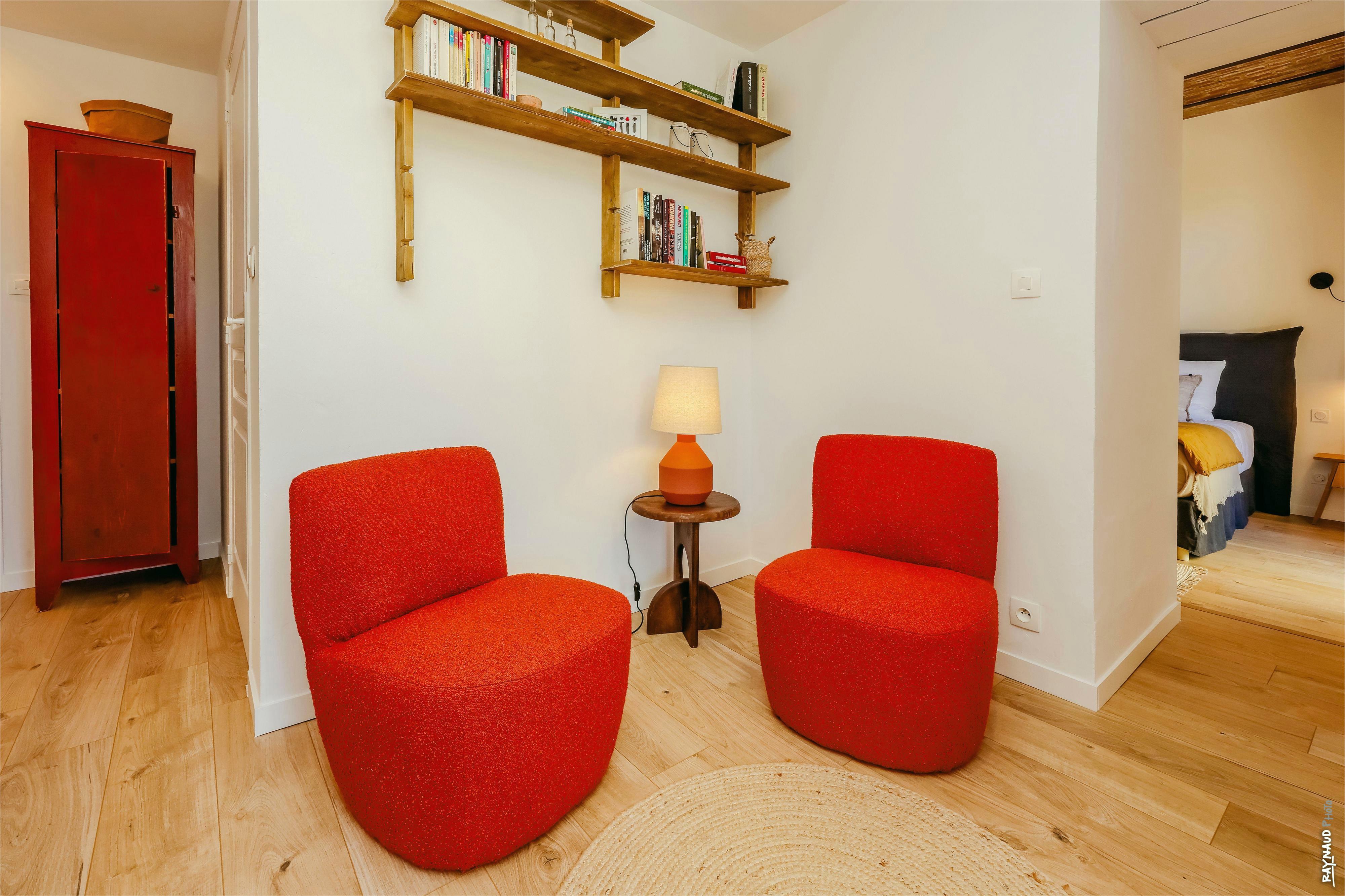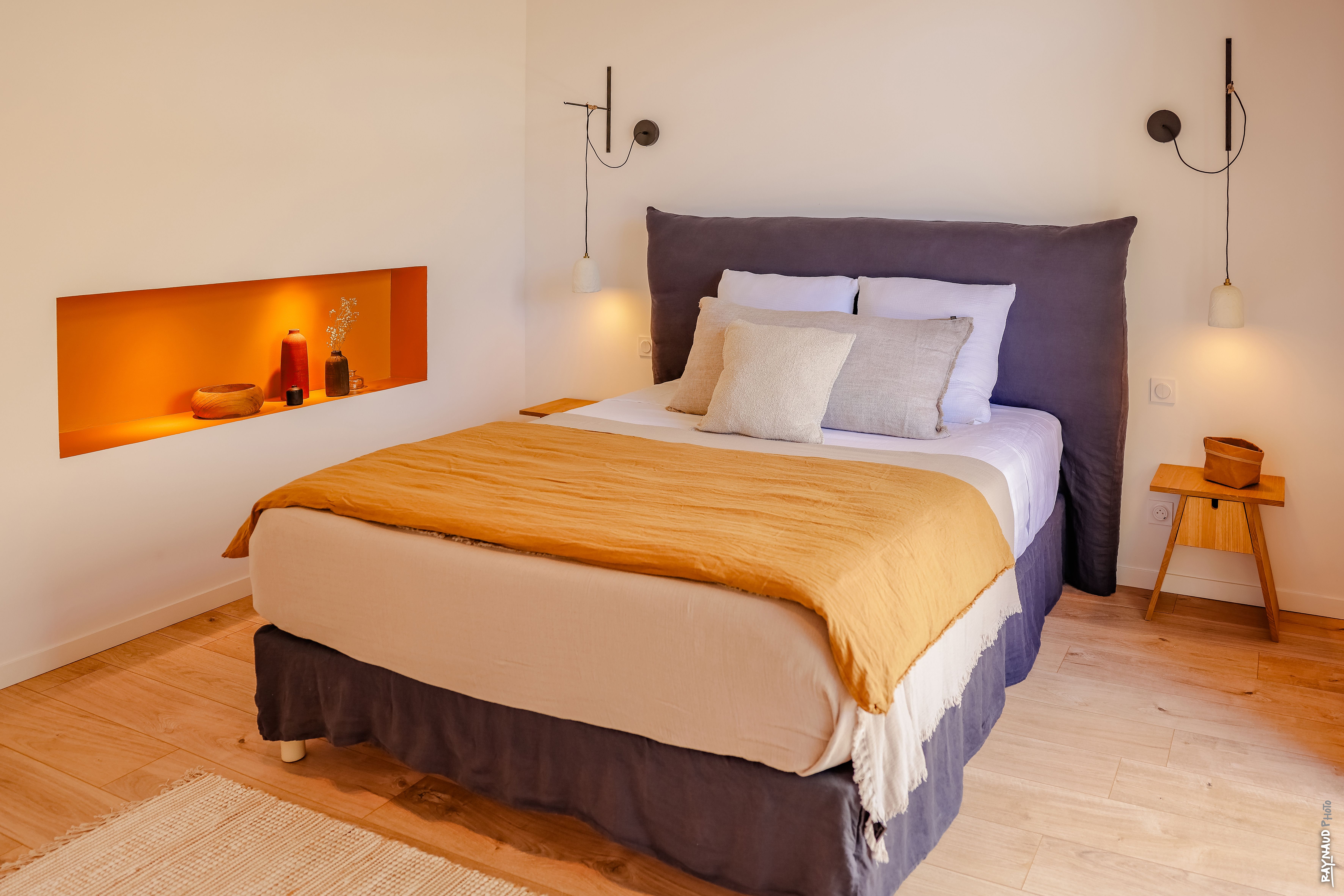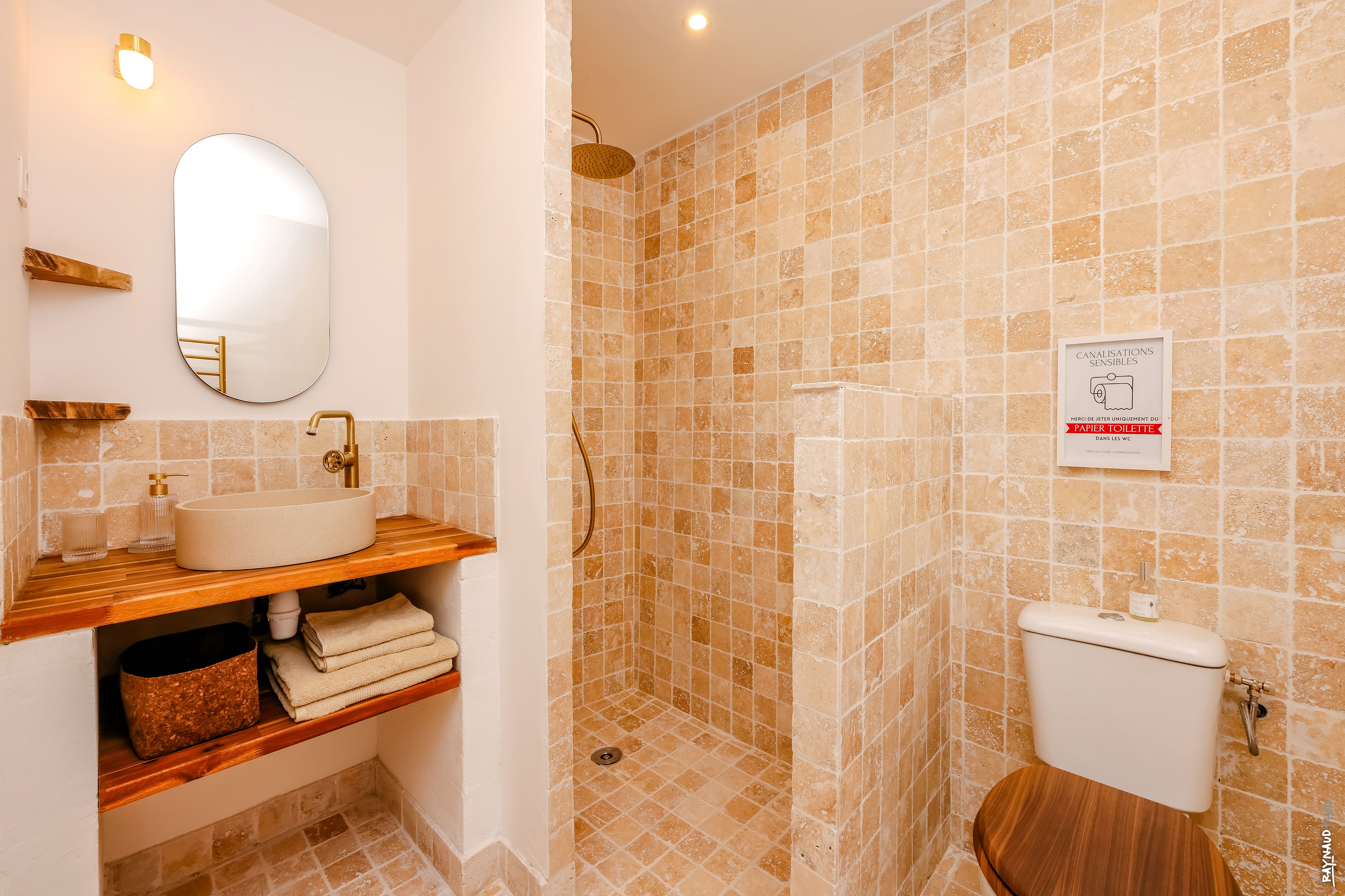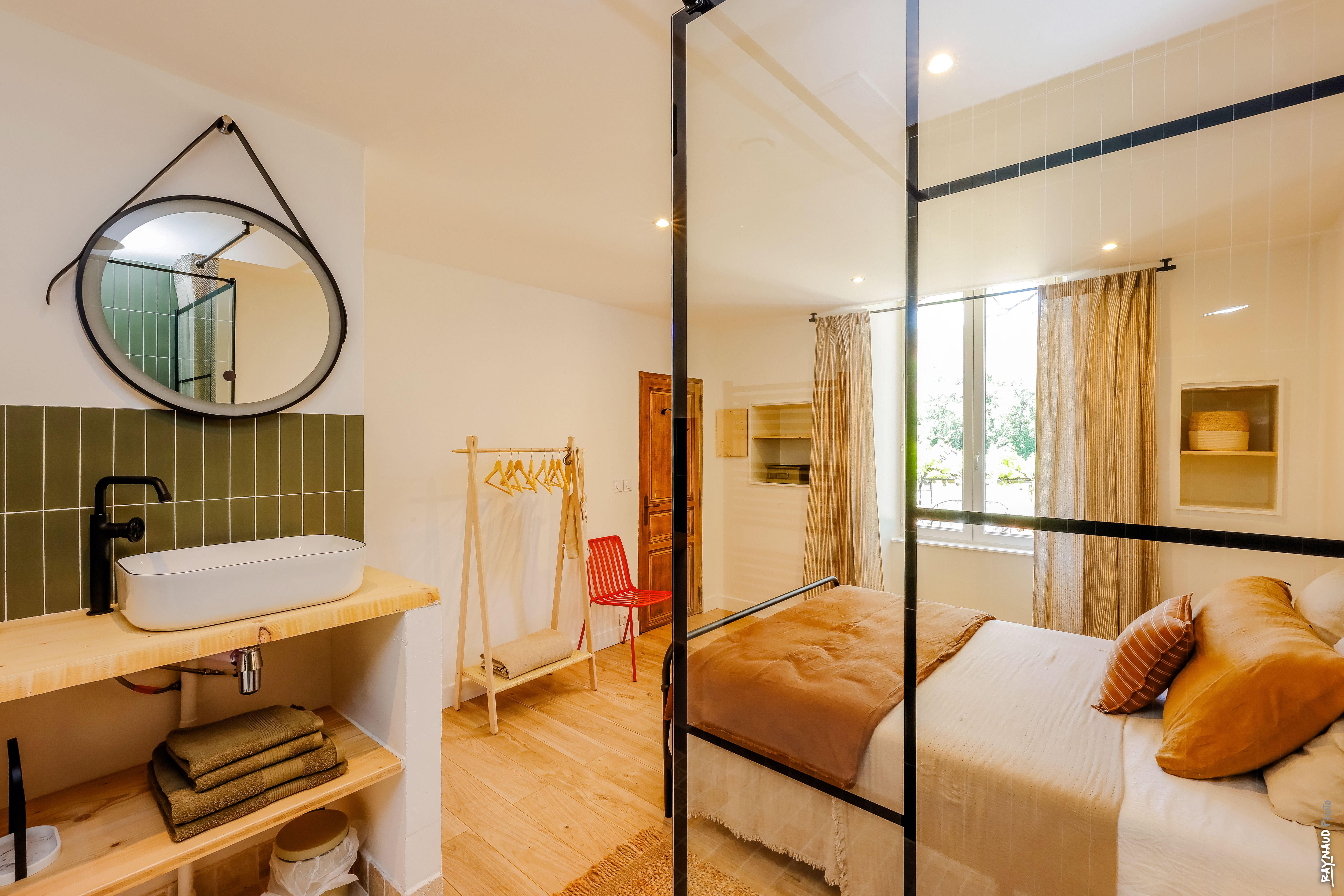 Deux belles chambres au rez-de-chaussée équipées de salles de bain et wc privatifs et une au deuxième étage sous pente.