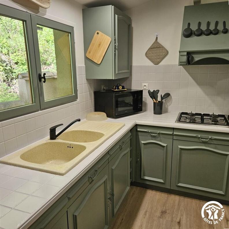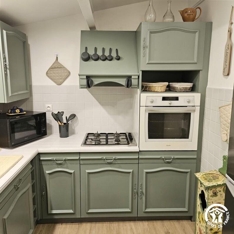 * cuisine toute équipée : lave-vaisselle, four, plaque gaz, réfrigérateur/congélateur, micro-ondes, cafetière filtre + cafetière expresso, arrière cuisine