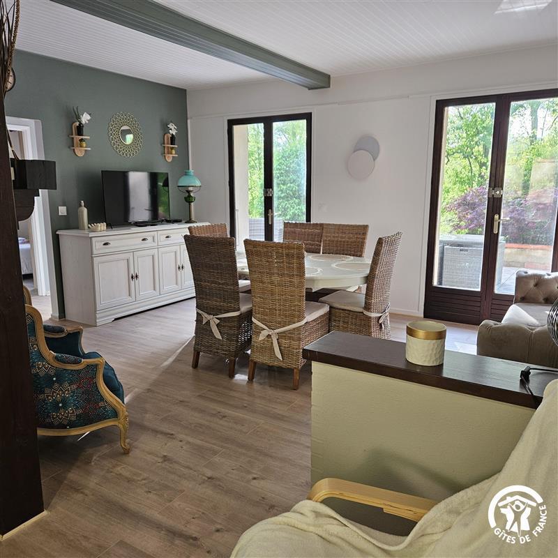 * pièce à vivre avec coin salon et salle à manger, canapé, fauteuils, table à manger, cheminée. Accès direct à la terrasse