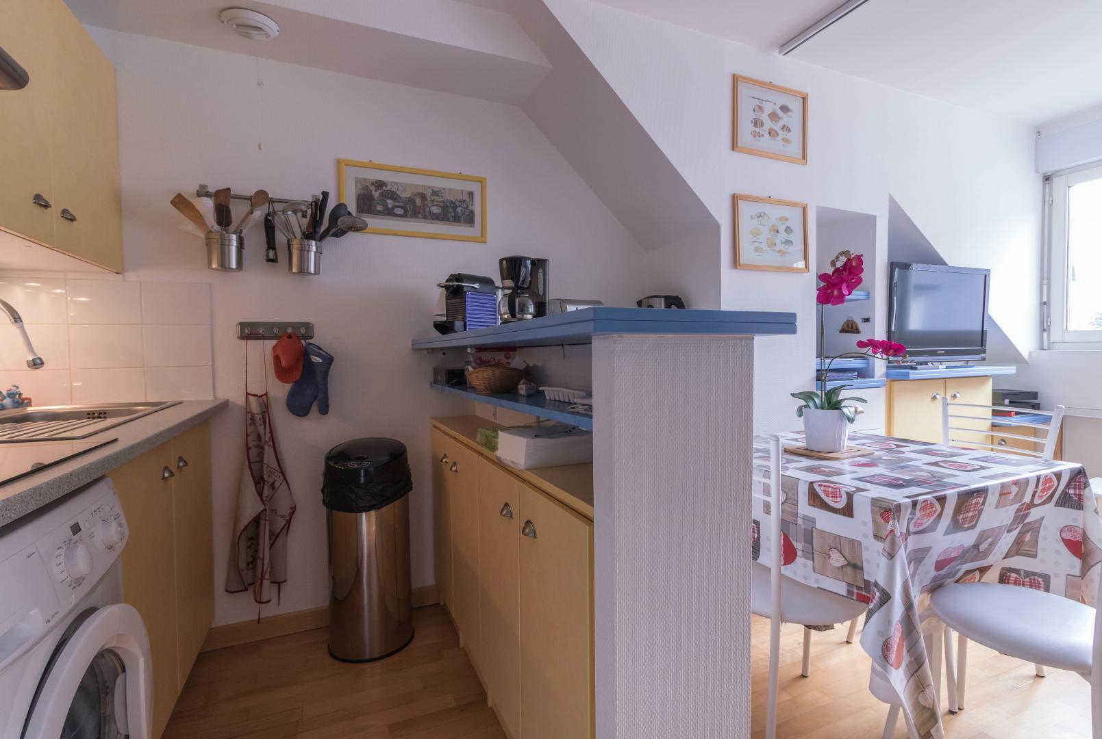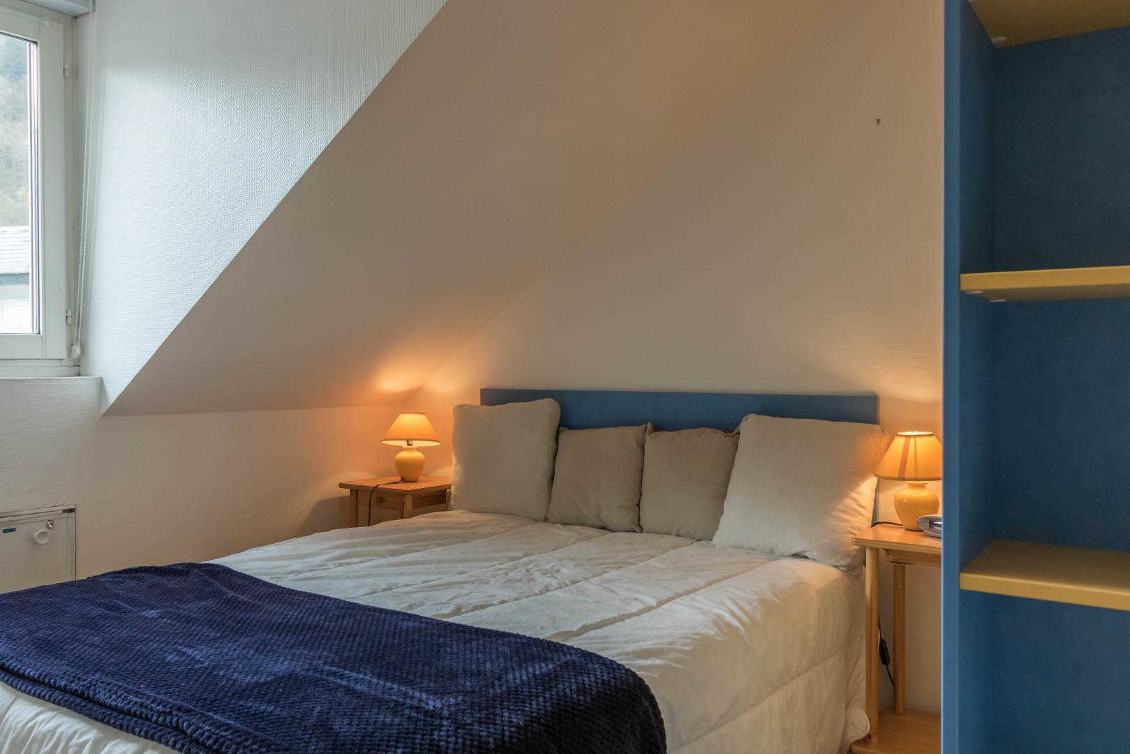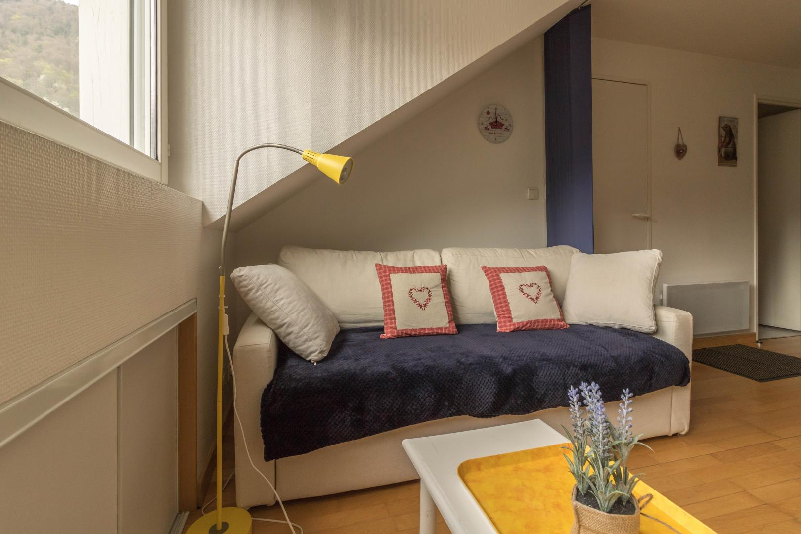 Appartement aménagé au 4ème étage de la résidence, accessible par un ascenseur : entrée directe sur la pièce de jour, petite cuisine américaine, espace détente avec canapé convertible. Chambre séparée en partie mansardée (1 lit 2 personnes en 140cm), salle d’eau/WC. Chauffage électrique, connexion Internet wifi. Un local en rez-de-chaussée permet de ranger skis et chaussures, éventuellement 1 ou 2 vélos. Local ski. Stationnement privatif dans la cour. Internet