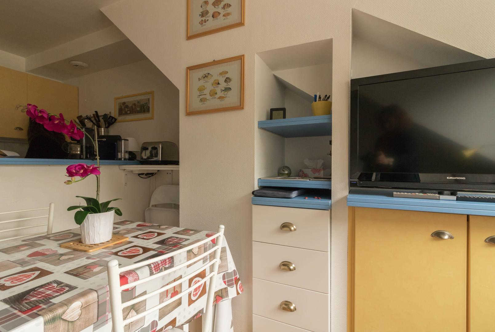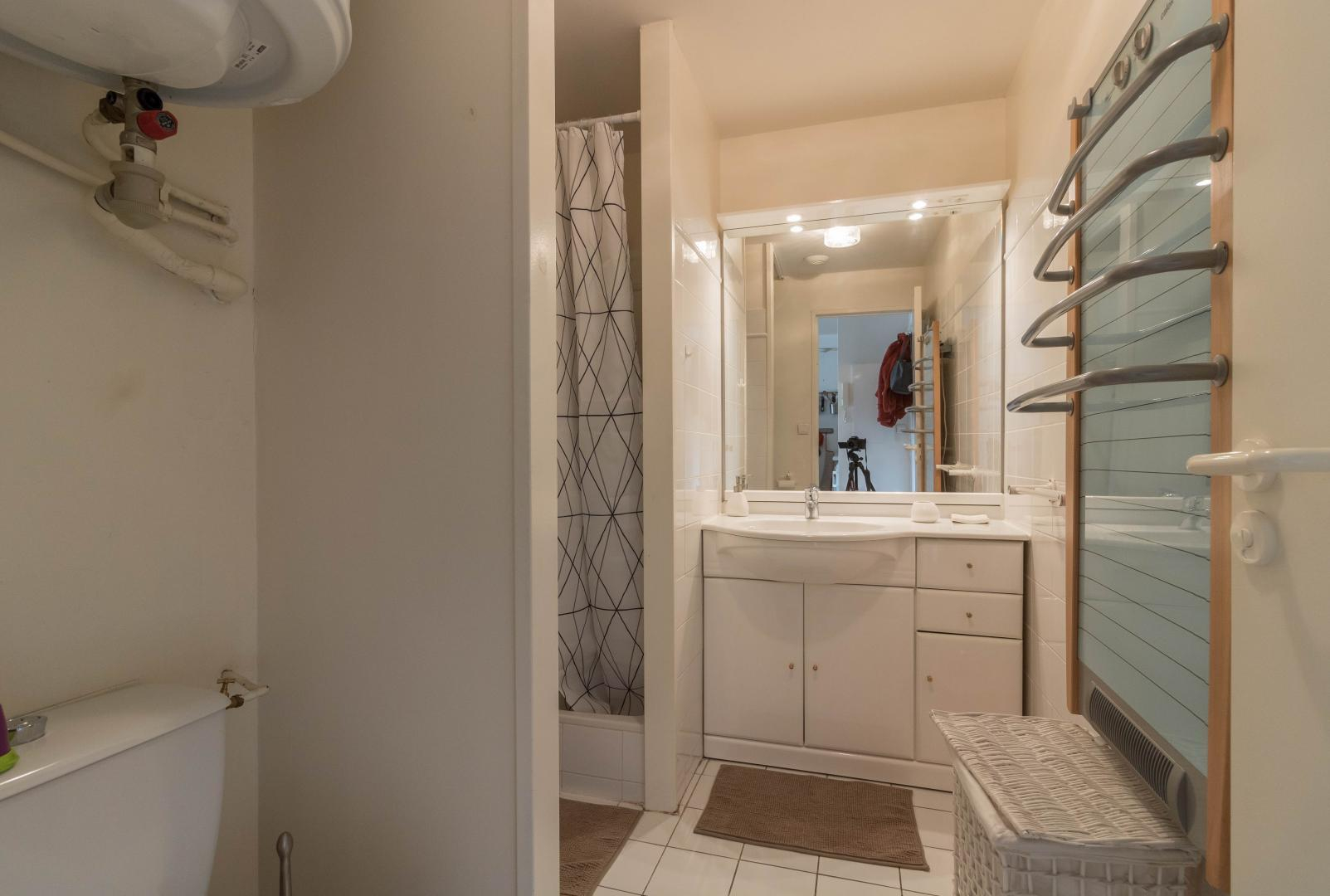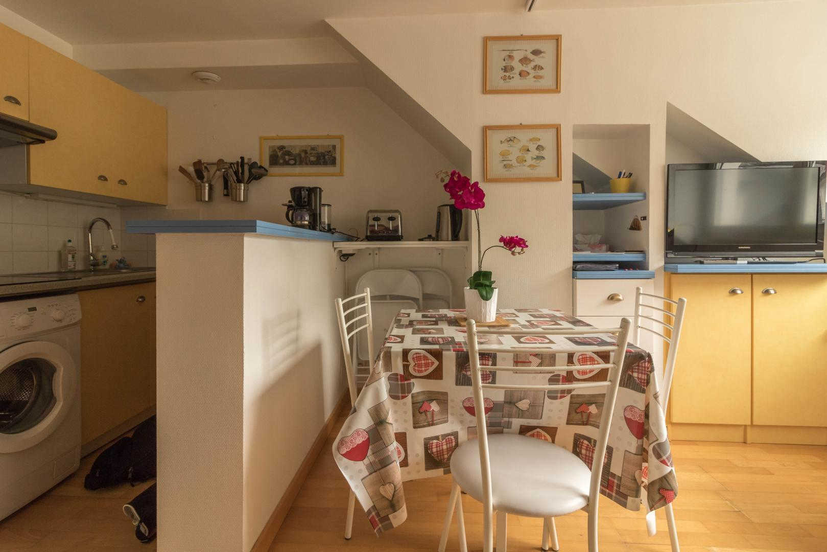 Appartement aménagé au 4ème étage de la résidence, accessible par un ascenseur : entrée directe sur la pièce de jour, petite cuisine américaine, espace détente avec canapé convertible. Chambre séparée en partie mansardée (1 lit 2 personnes en 140cm), salle d’eau/WC. Chauffage électrique, connexion Internet wifi. Un local en rez-de-chaussée permet de ranger skis et chaussures, éventuellement 1 ou 2 vélos. Local ski. Stationnement privatif dans la cour. Internet