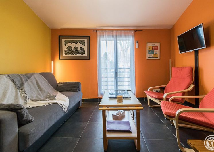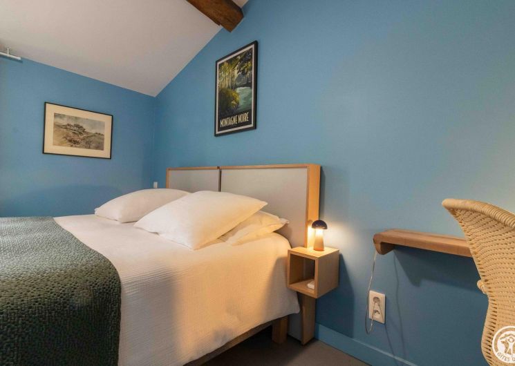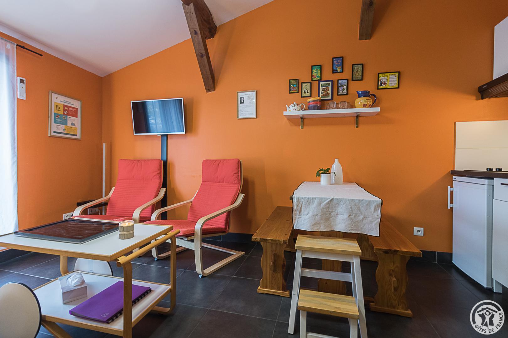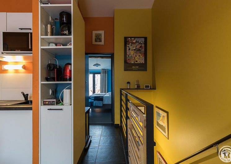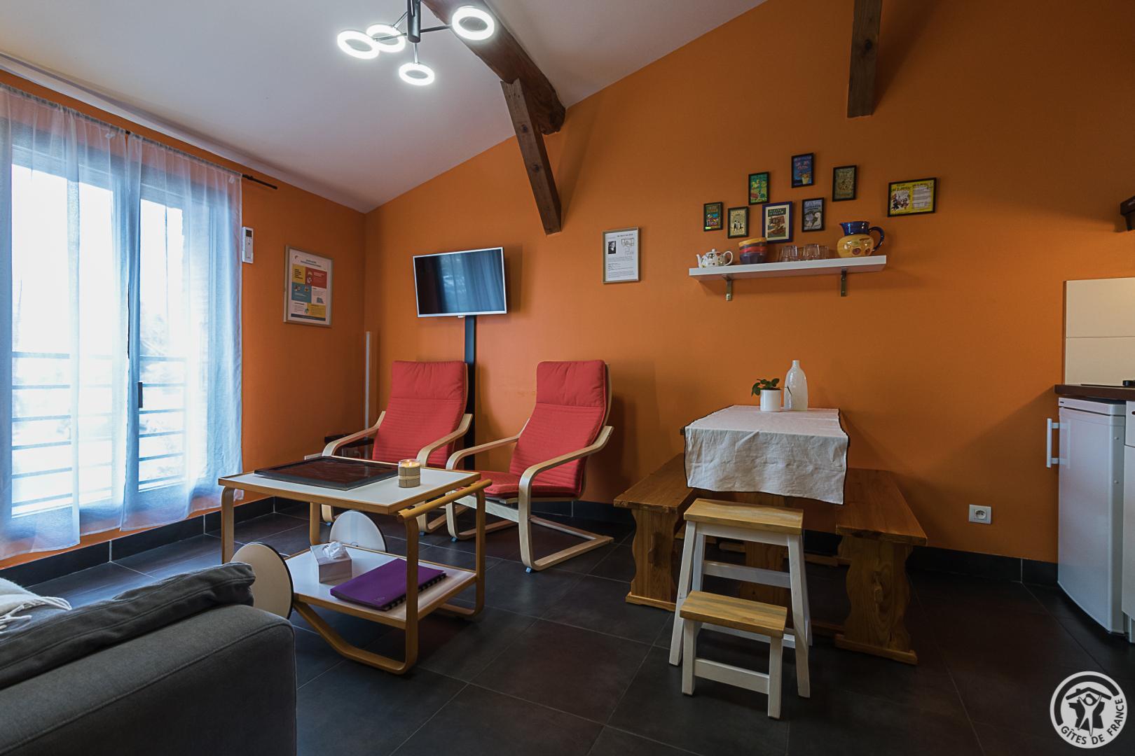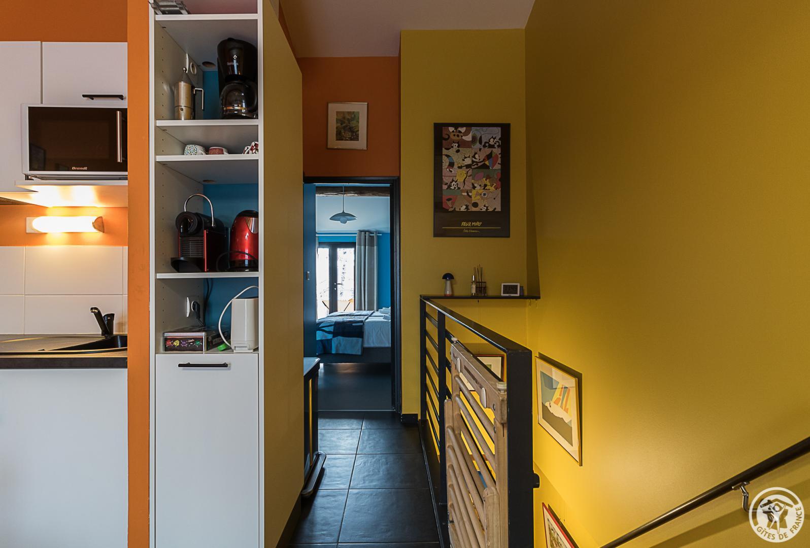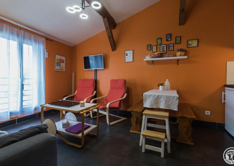 Le gîte est situé à l’étage de la maison des propriétaires, avec un accès indépendant : séjour (canapé, fauteuils, table basse, télévision, jeux, bibliothèque) et coin-cuisine (réfrigérateur, micro-ondes/grill, cafetière, bouilloire). Un dégagement dessert la salle d’eau/WC et la chambre (2 lits pour 1 personne en 80x200cm, jumelables, bureau) qui ouvre sur une petite terrasse privée, dominant le jardin (transats). Un escalier permet de descendre directement dans le jardin. Climatisation réversible.
