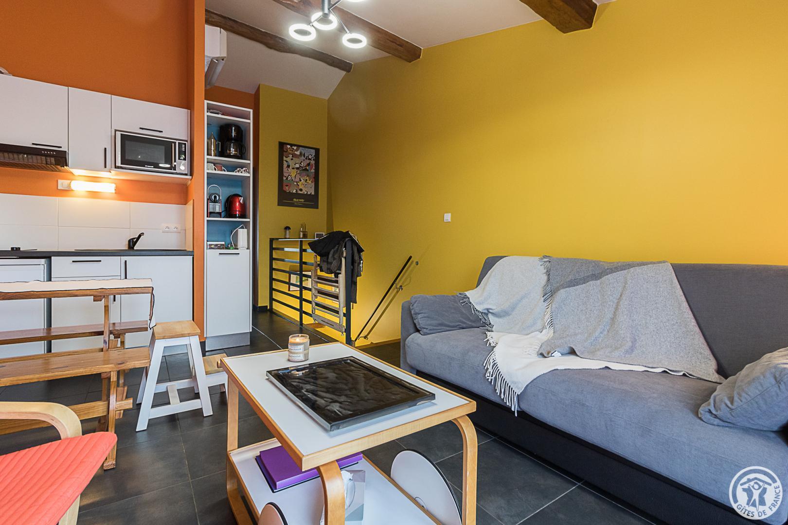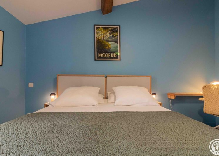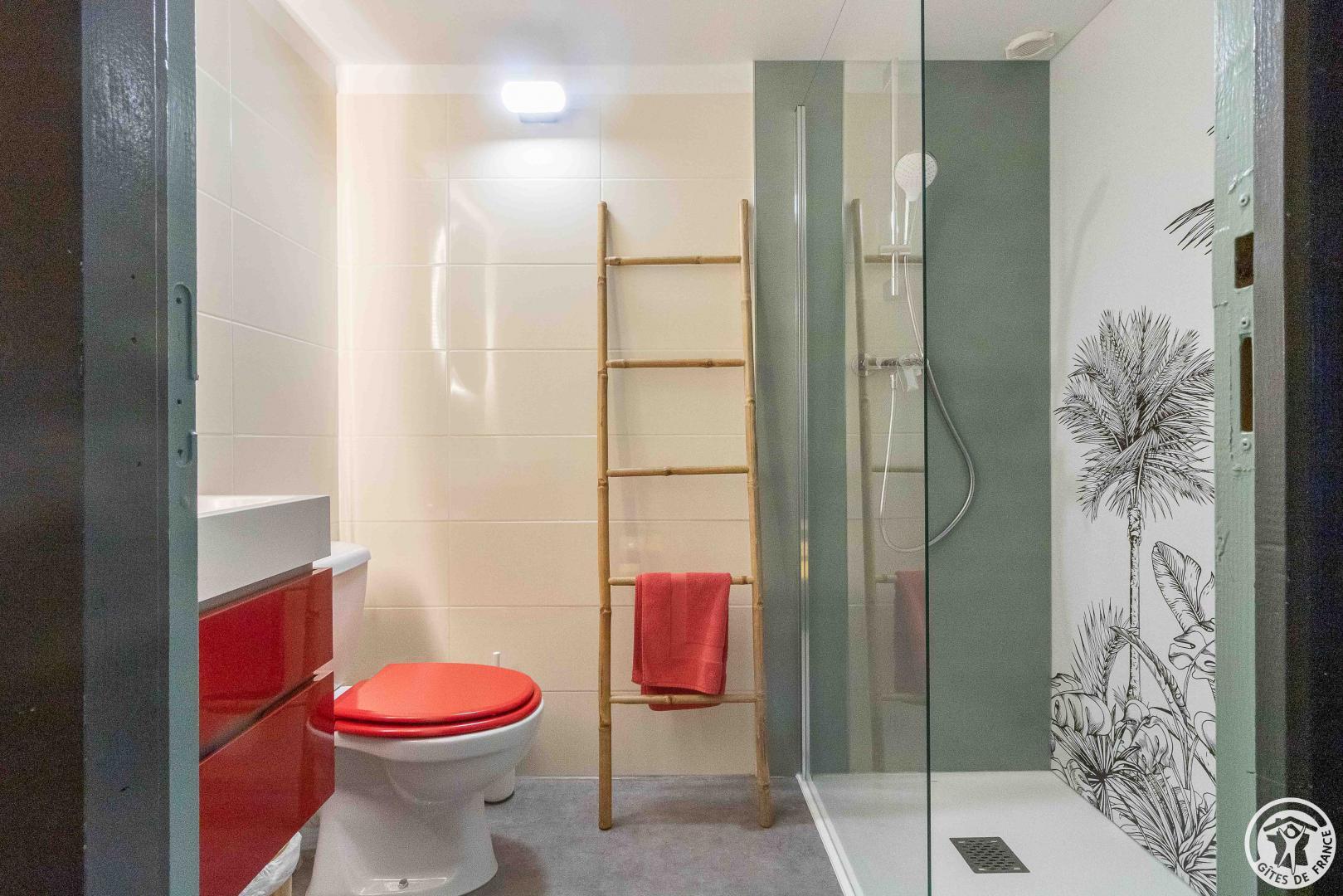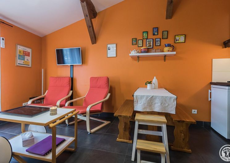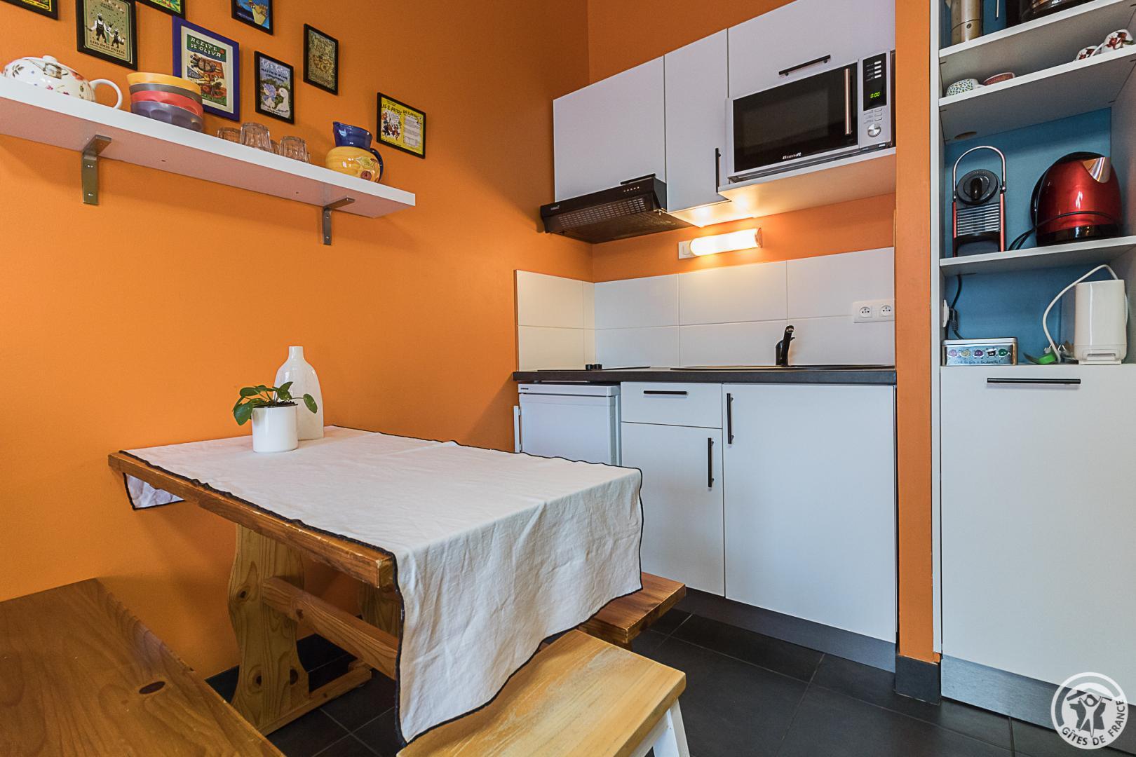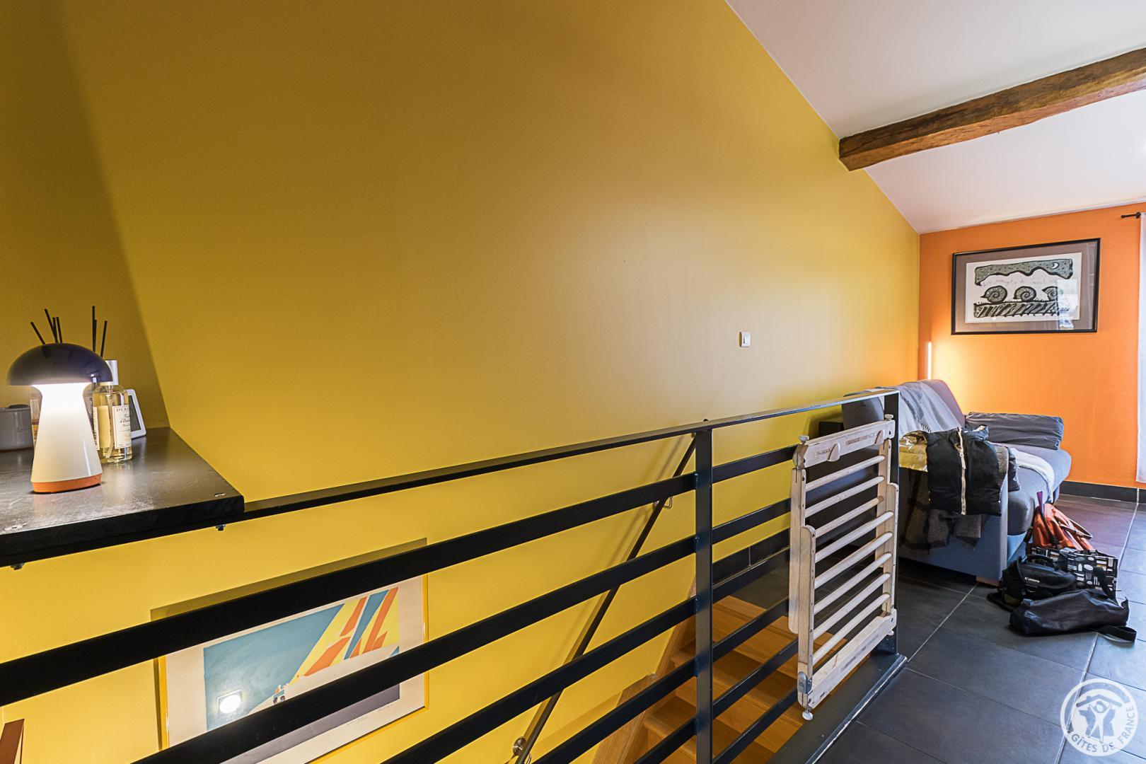Le gîte est situé à l’étage de la maison des propriétaires, avec un accès indépendant : séjour (canapé, fauteuils, table basse, télévision, jeux, bibliothèque) et coin-cuisine (réfrigérateur, micro-ondes/grill, cafetière, bouilloire). Un dégagement dessert la salle d’eau/WC et la chambre (2 lits pour 1 personne en 80x200cm, jumelables, bureau) qui ouvre sur une petite terrasse privée, dominant le jardin (transats). Un escalier permet de descendre directement dans le jardin. Climatisation réversible.