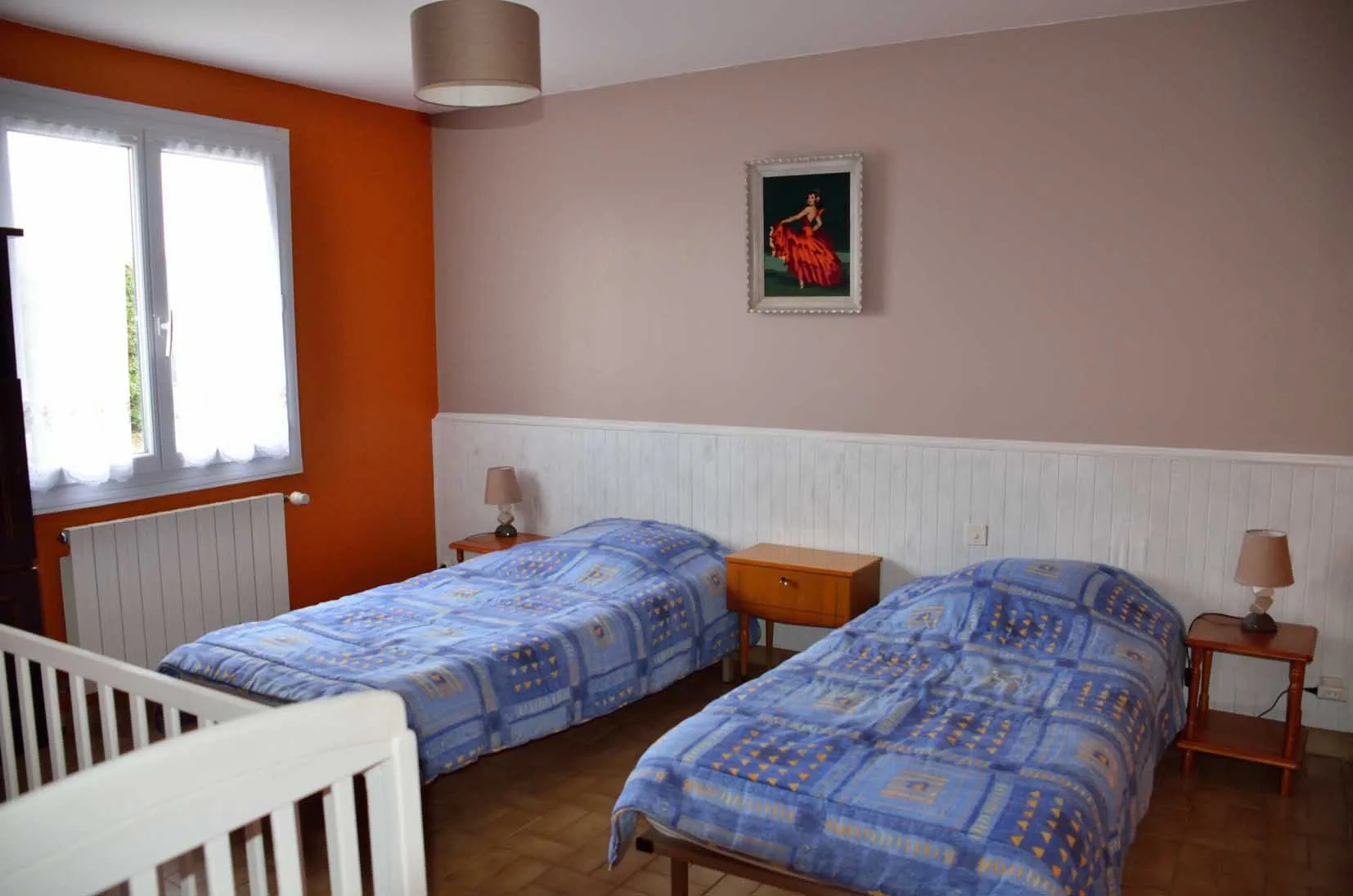 Appartement de plain-pied, au rez-de-chaussée. 2 chambres (1 lit en 140, 2 lits en 90), salle d’eau avec lave-linge. Cuisine (lave-vaisselle), salon (clic-clac 130, télévision, lecteur DVD, Wifi , .acces a la fibre . Chauffage central. Véranda (14 m²), terrain (100 m²) clos privé, salon de jardin, barbecue, jeux pour enfant, baby-foot, location de draps, linge de table et toilette. Taxe de séjour.
