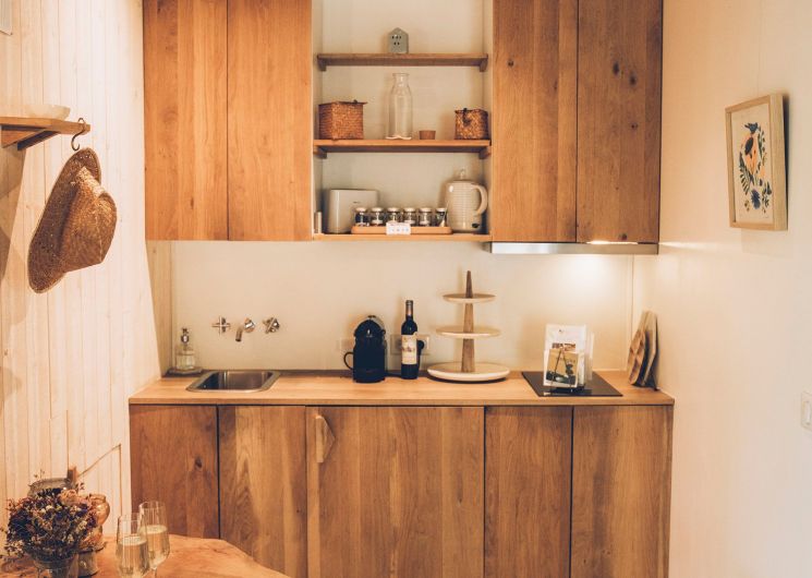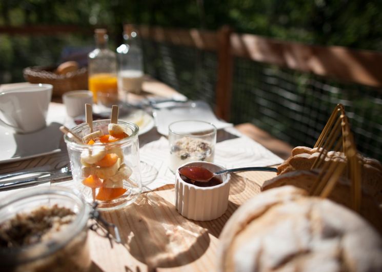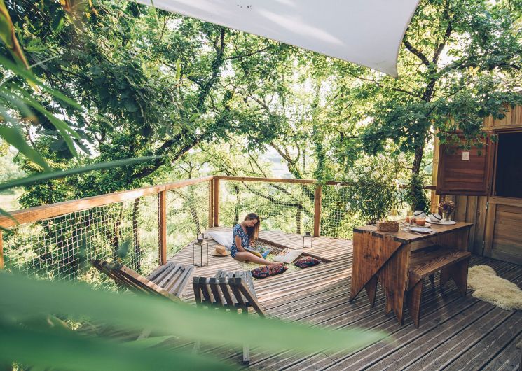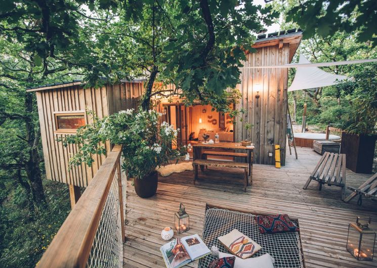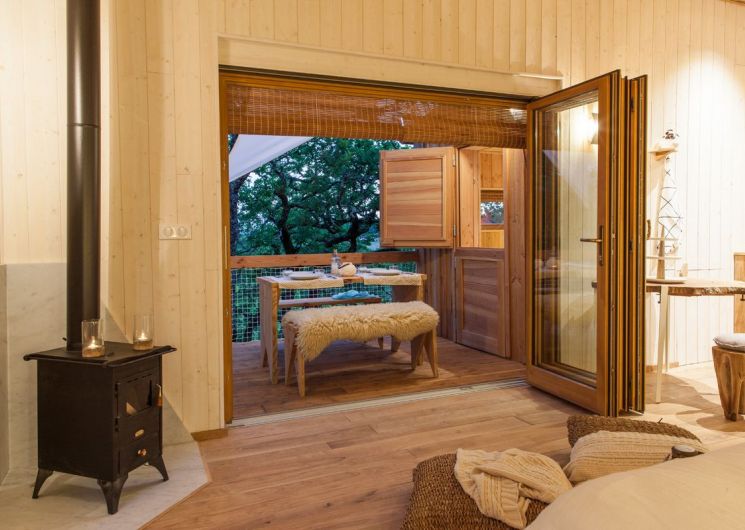Aménagement de la cabane dans les arbres : une grande chambre (1 lit 160×200), un bloc cuisine avec éléments intégrés, un poêle à bois, terrasse avec mobilier d’agrément et bain nordique à bulles privé. De la terrasse accès au sauna privé dans une pièce séparée qui peut faire office de chambre supplémentaire (2 lits 70). Accès piscine et tennis chez le propriétaire à 100 mètres.