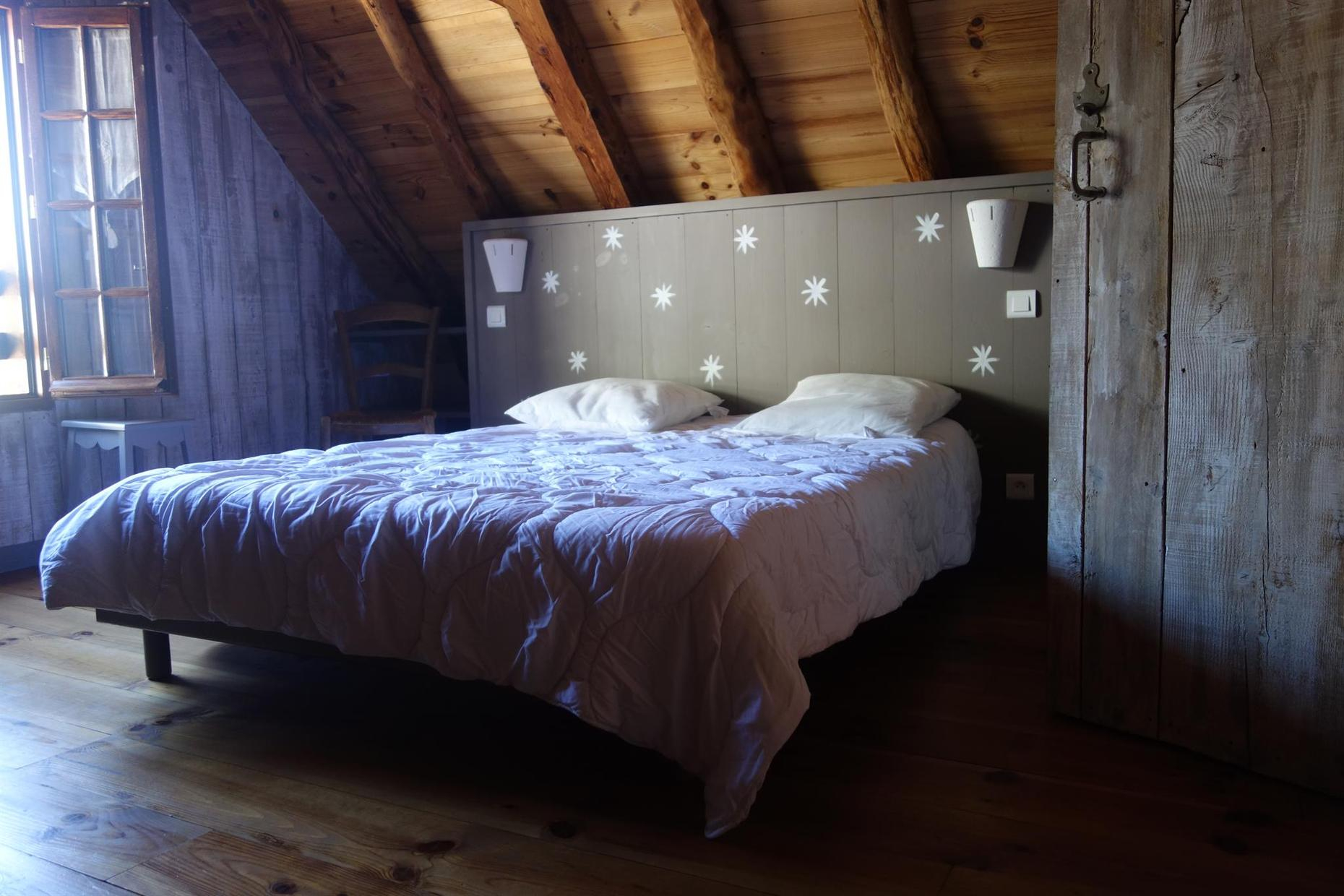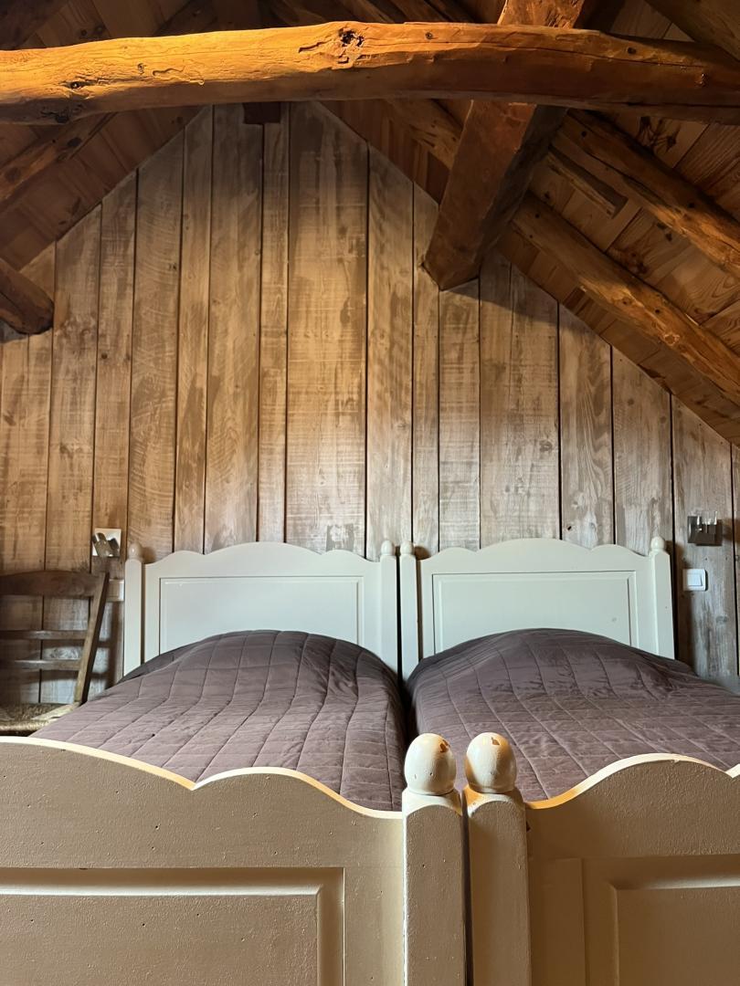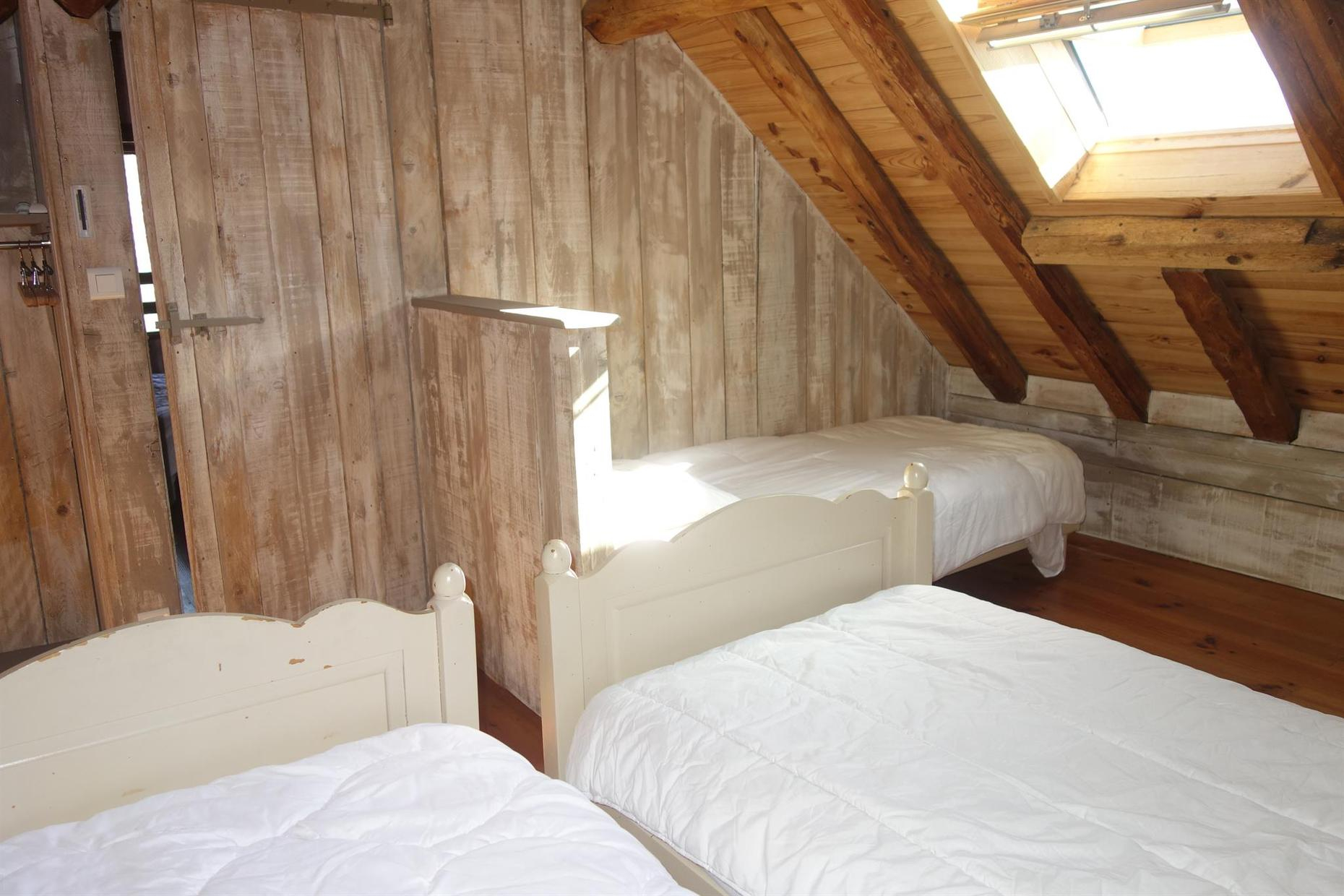 – À l’étage : 2 chambres mansardées (1 lit 2 personnes en 140cm) (1 lit 1 personne en 90cm + 2 lits 1 personnes en 90cm jumelés).